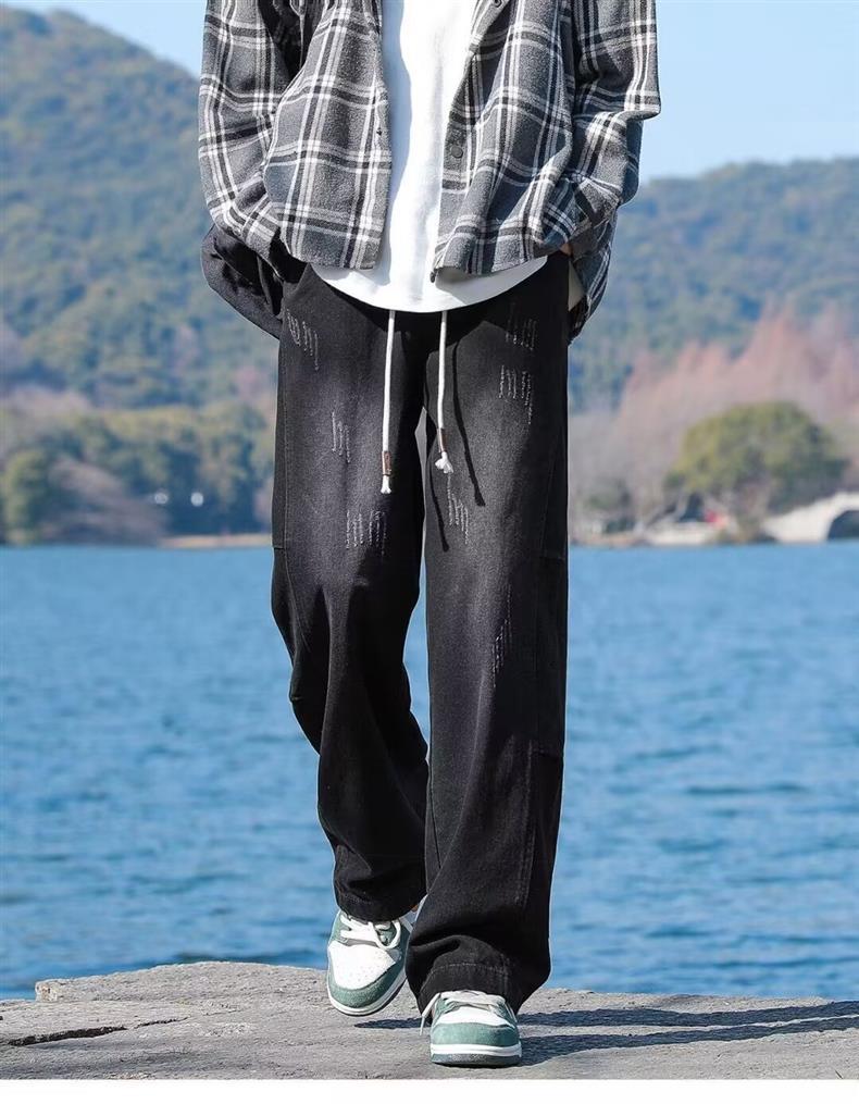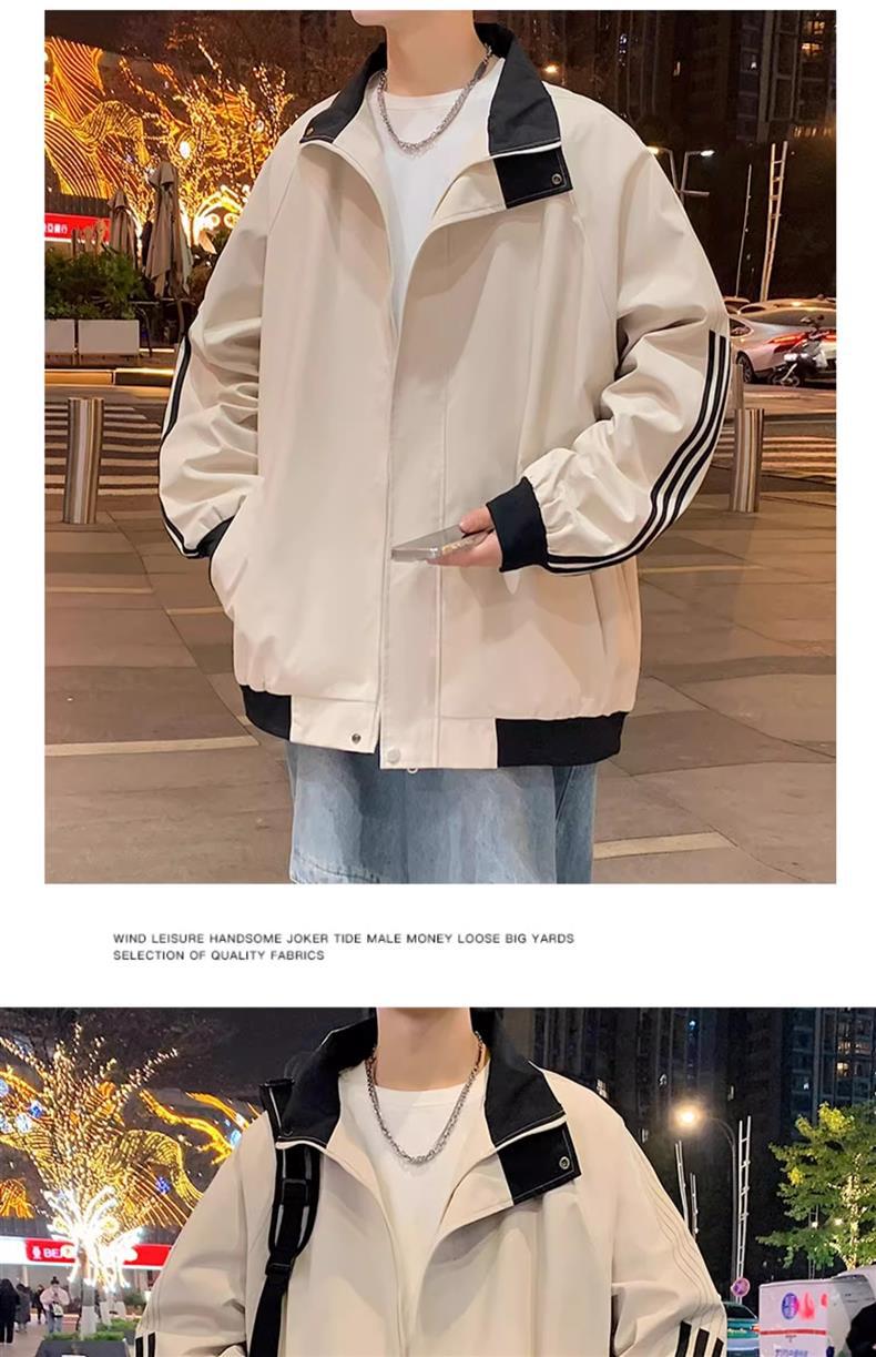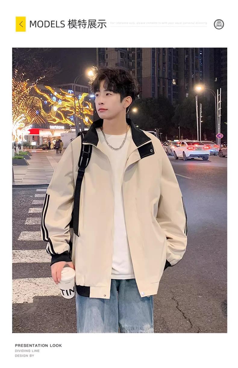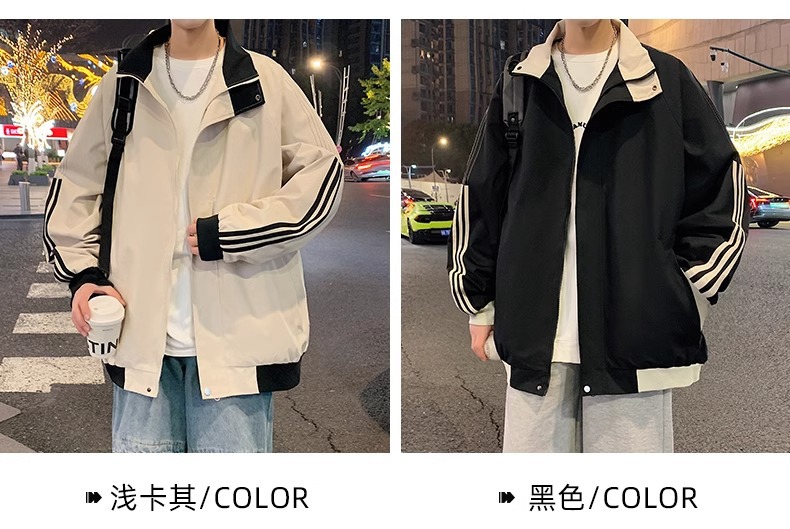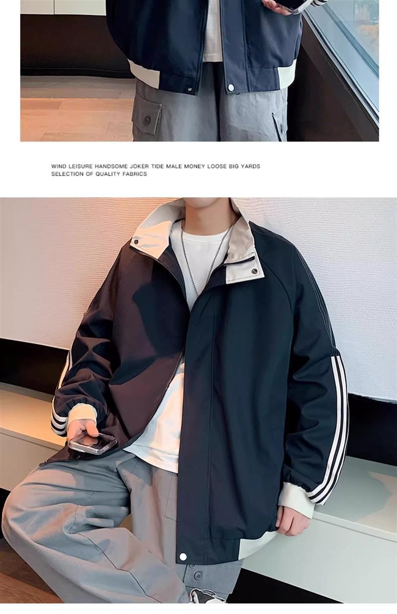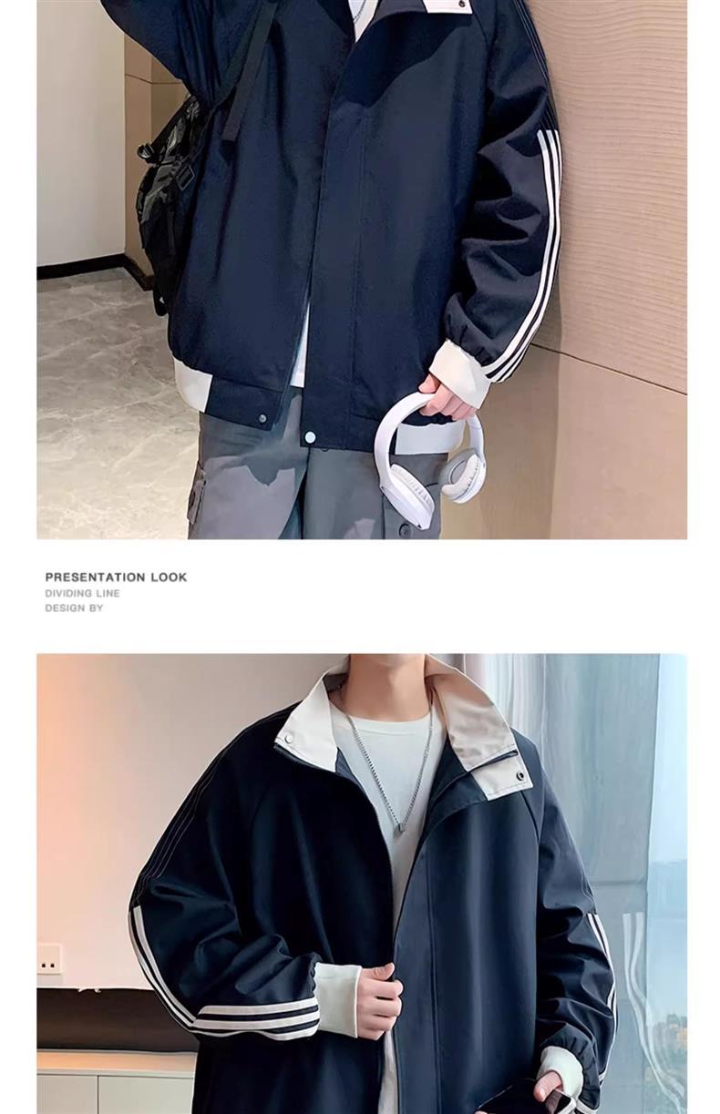美式秋季立领外套男款潮牌休闲运动条纹夹克男生防风冲锋衣一整套