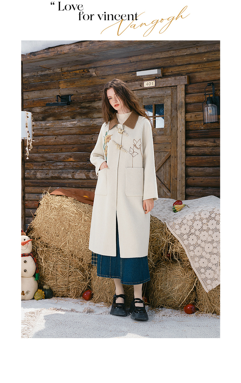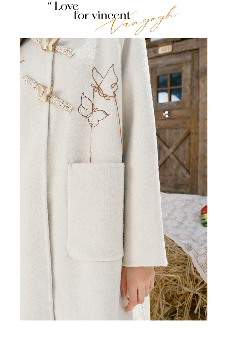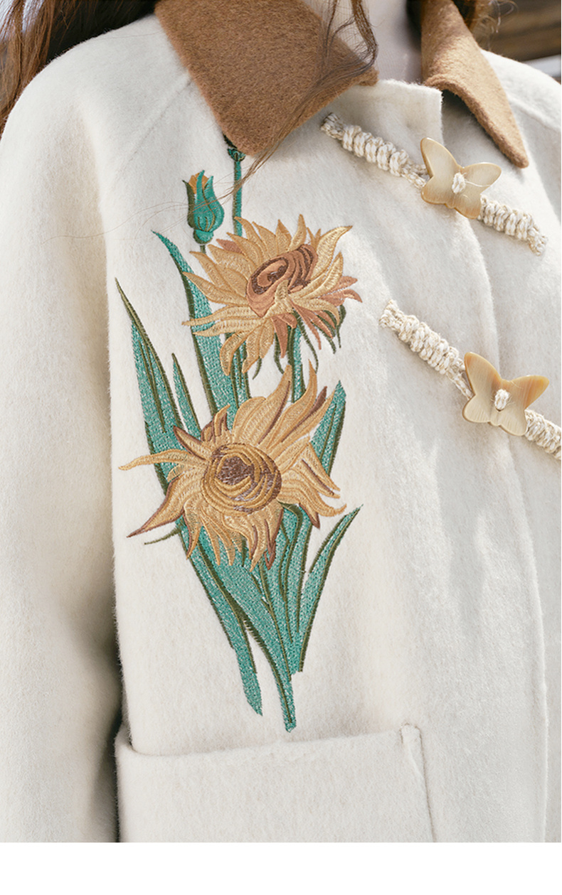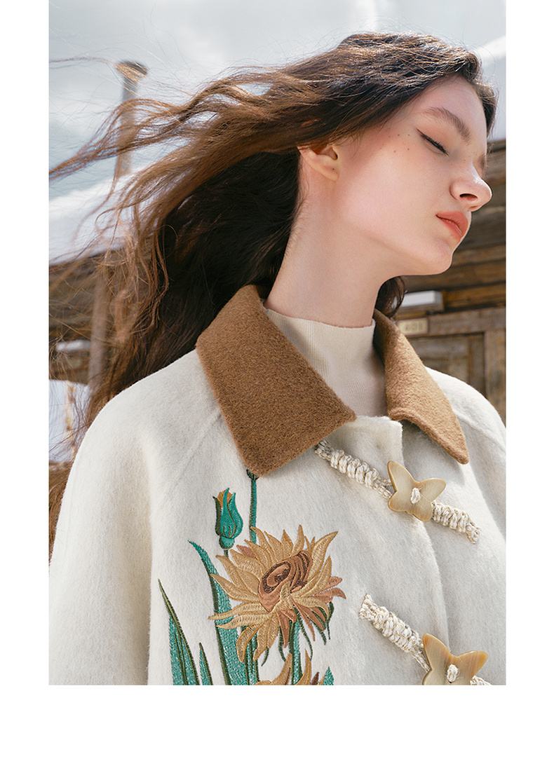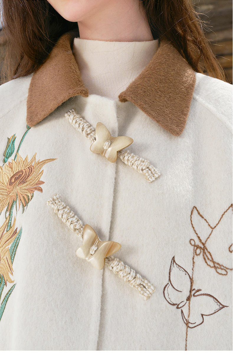 两三事梵高文艺向日柔情2024冬季新款绣花蝴蝶牛角扣毛呢外套女