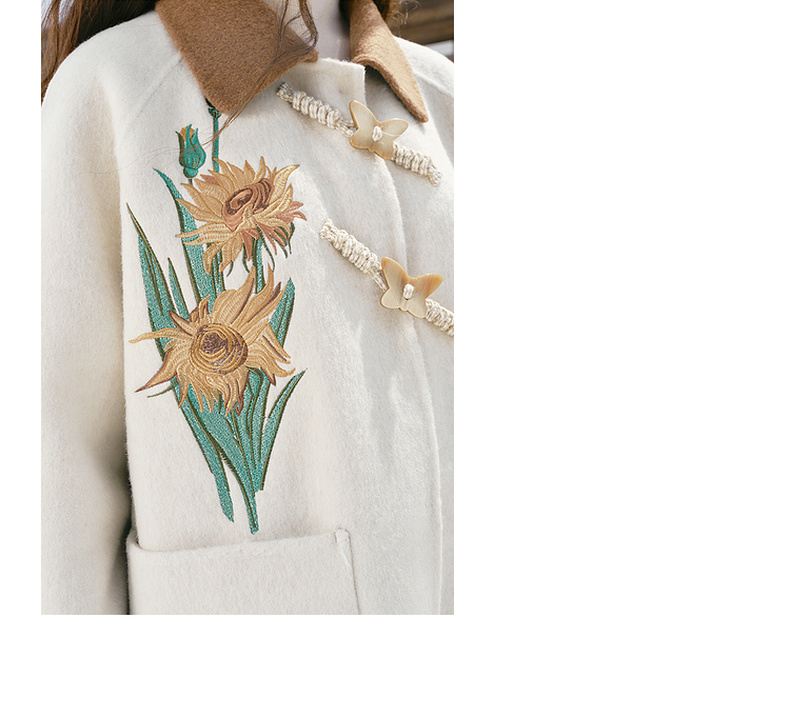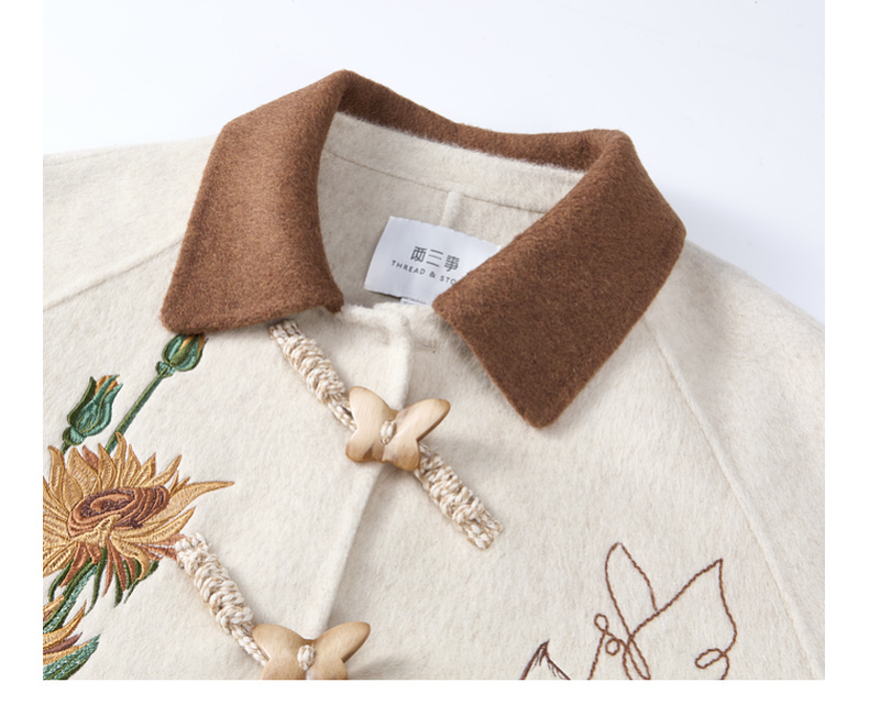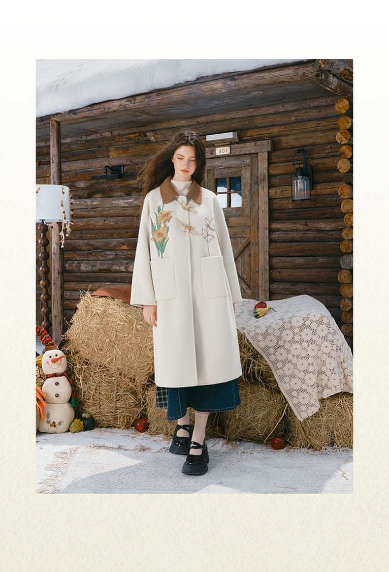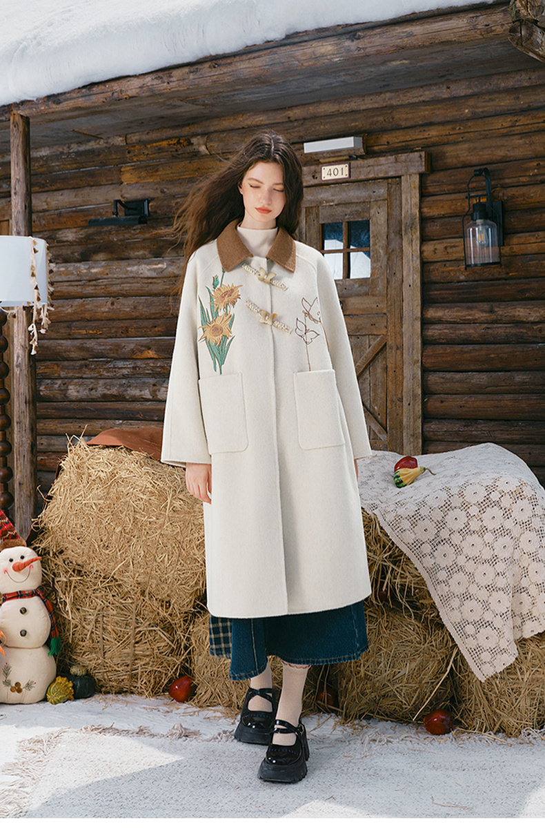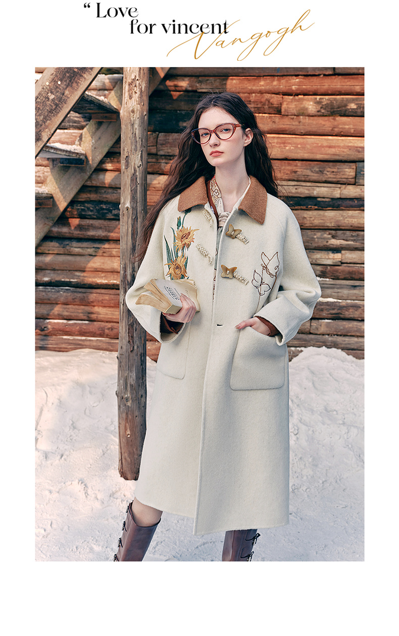 两三事梵高文艺向日柔情2024冬季新款绣花蝴蝶牛角扣毛呢外套女