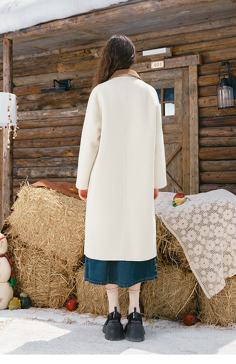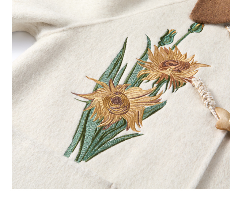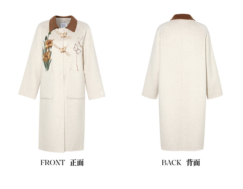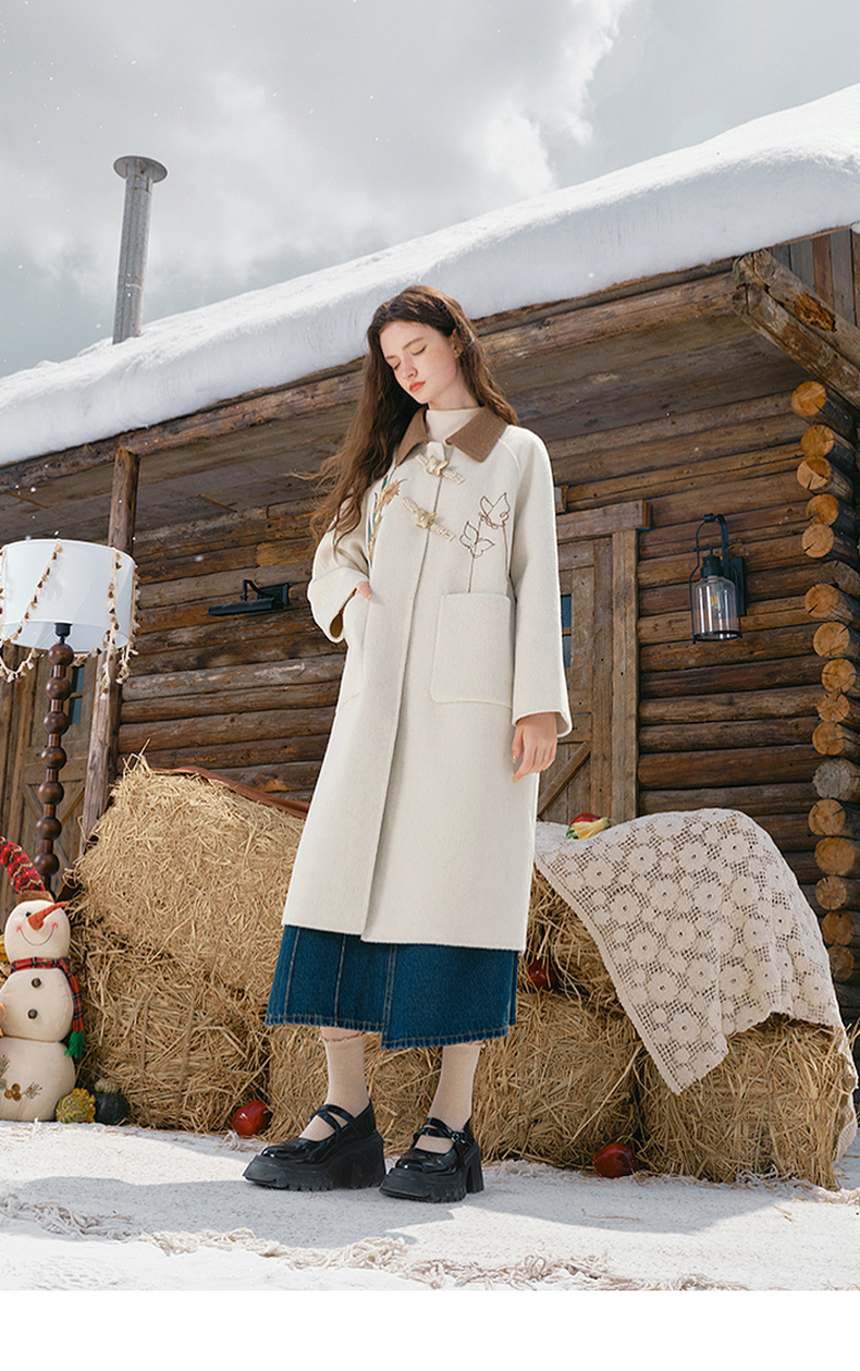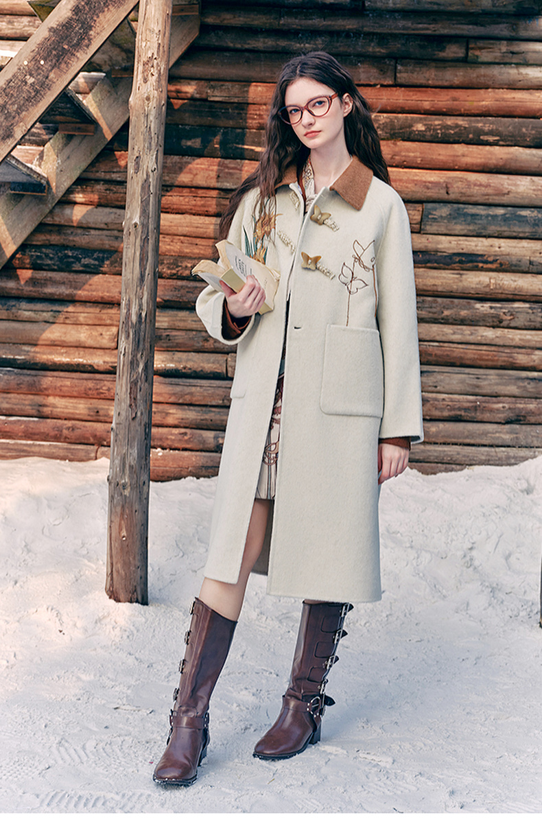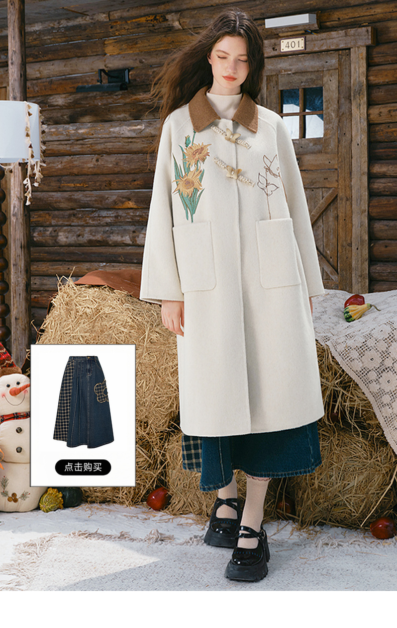 两三事梵高文艺向日柔情2024冬季新款绣花蝴蝶牛角扣毛呢外套女