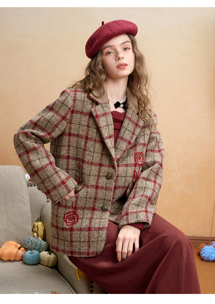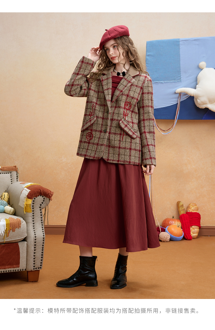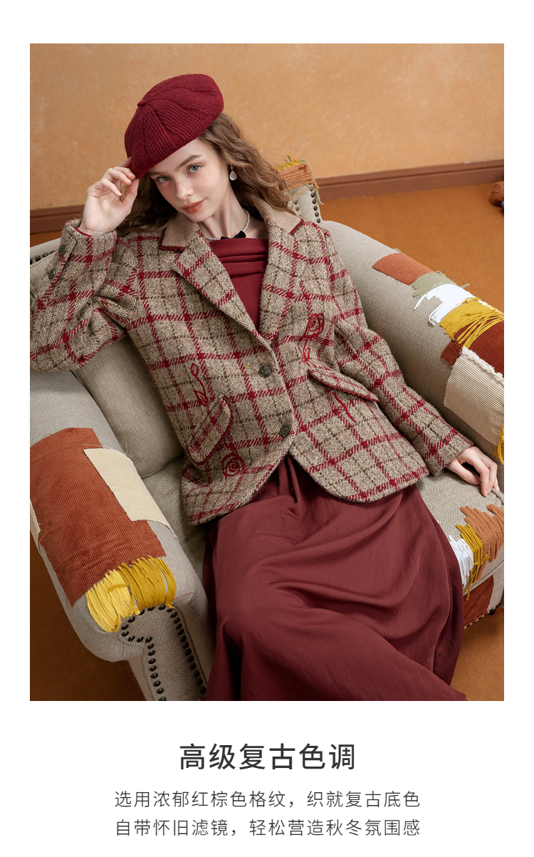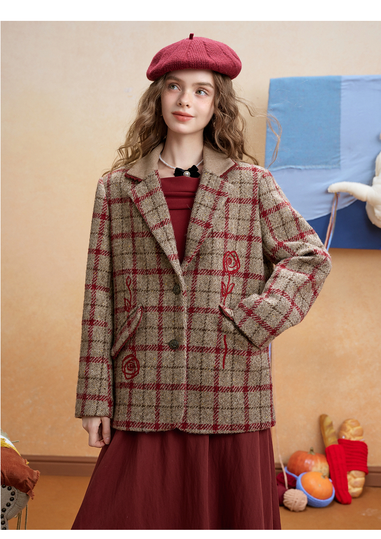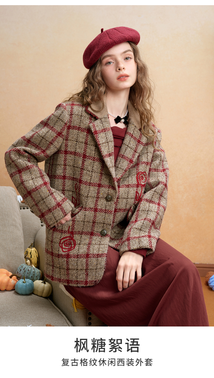 【暖冬内购】两三事 枫糖絮语 2025冬季新款英伦风格子绣花西装毛呢外套女宽松