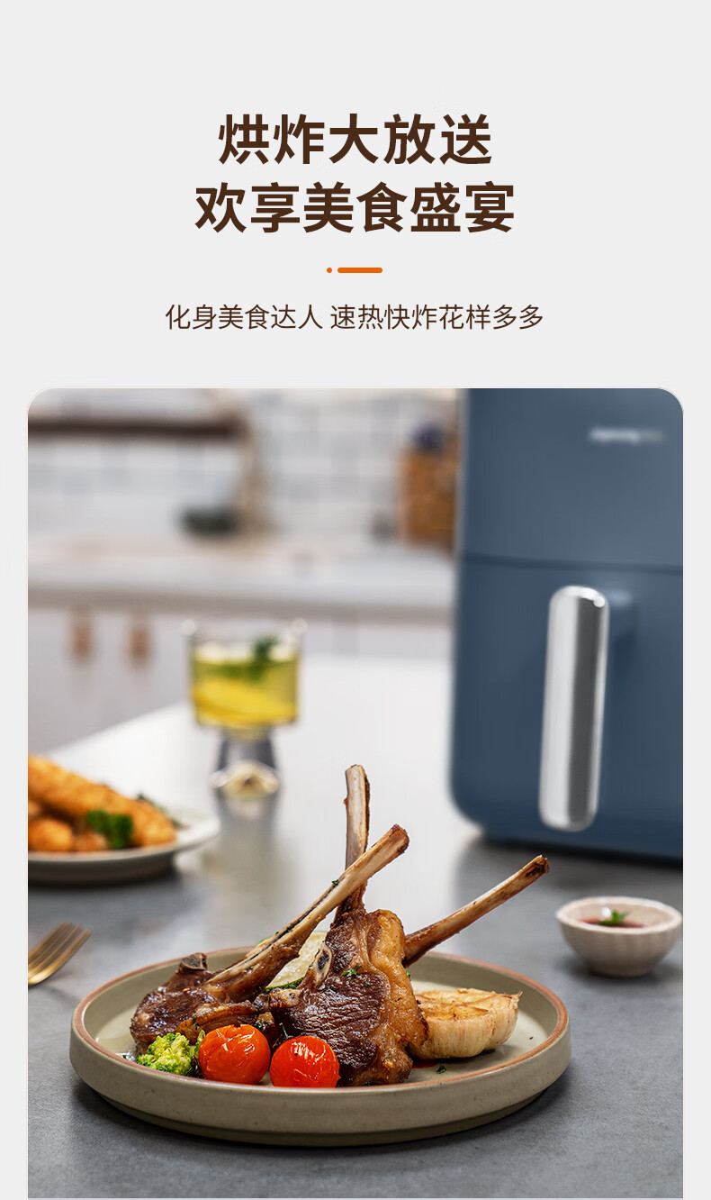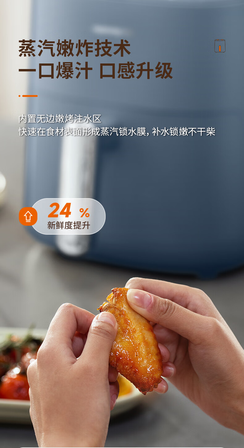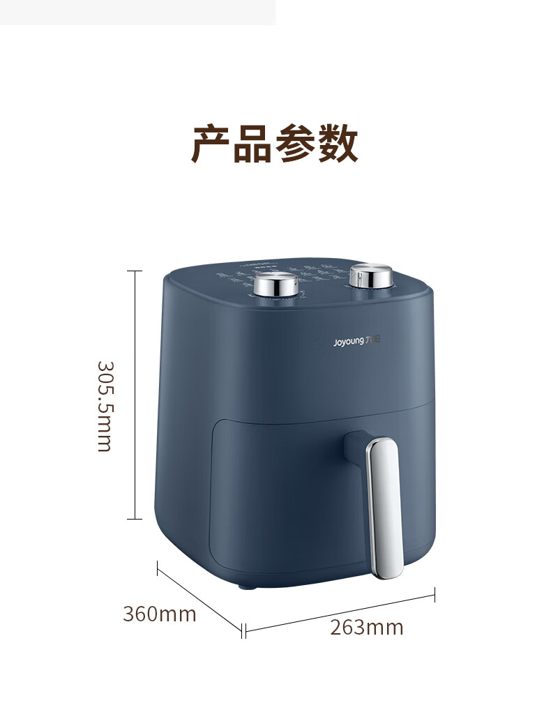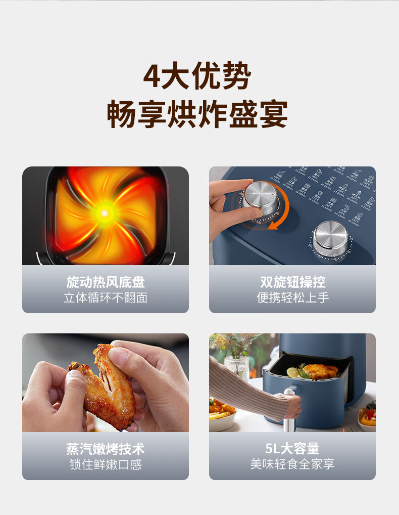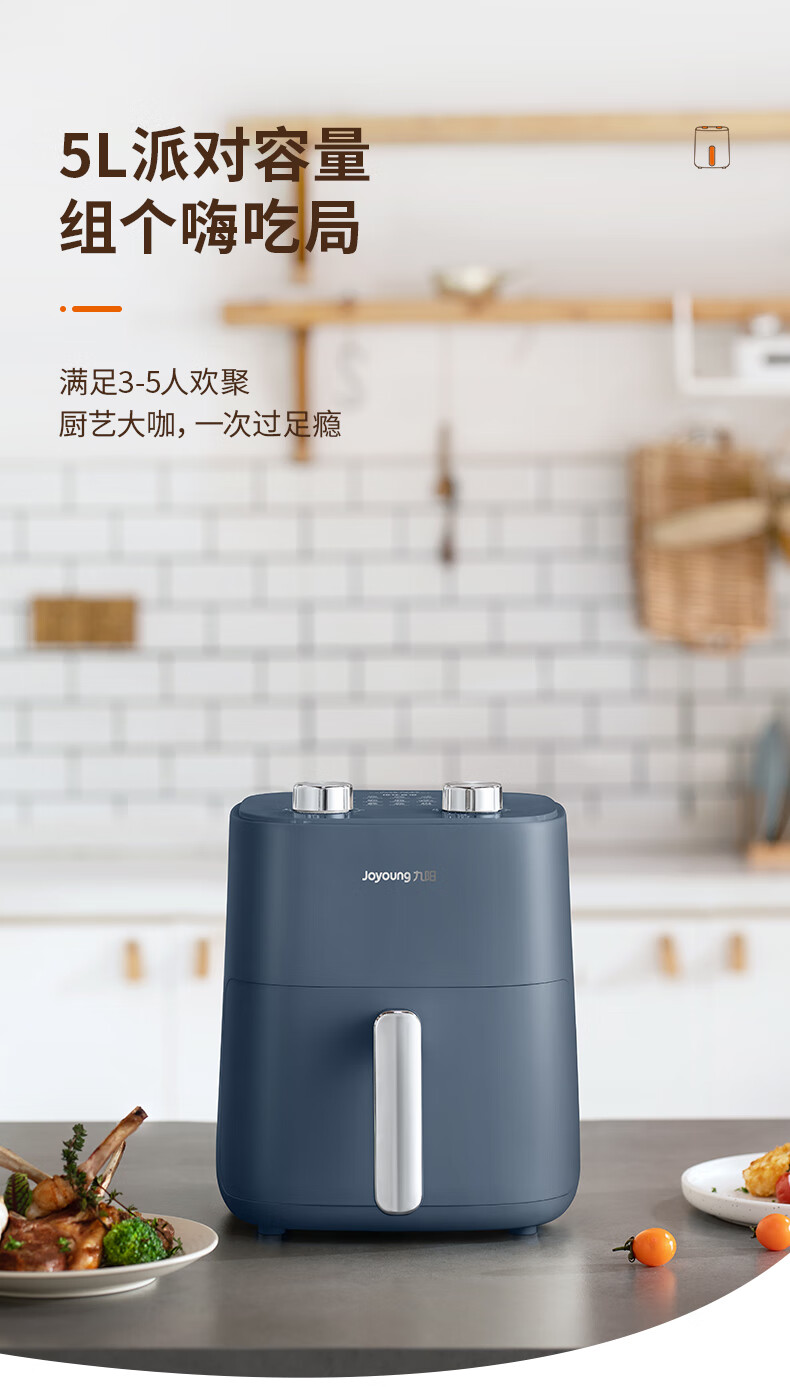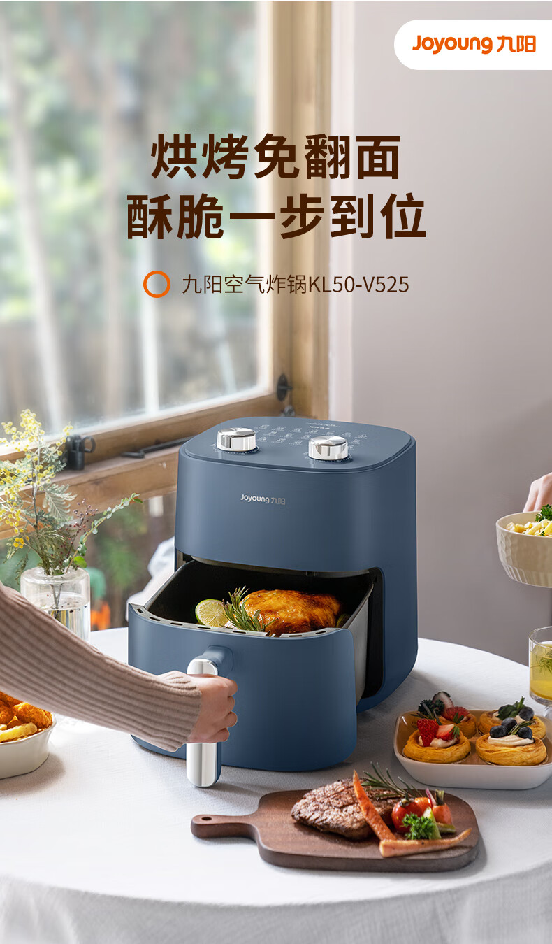 九阳(Joyoung)空气炸锅大容量不用翻面蒸汽嫩烤家用智能无油不粘电炸锅薯条机KL50-V525【5L蓝色双旋钮】