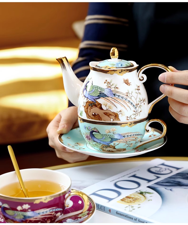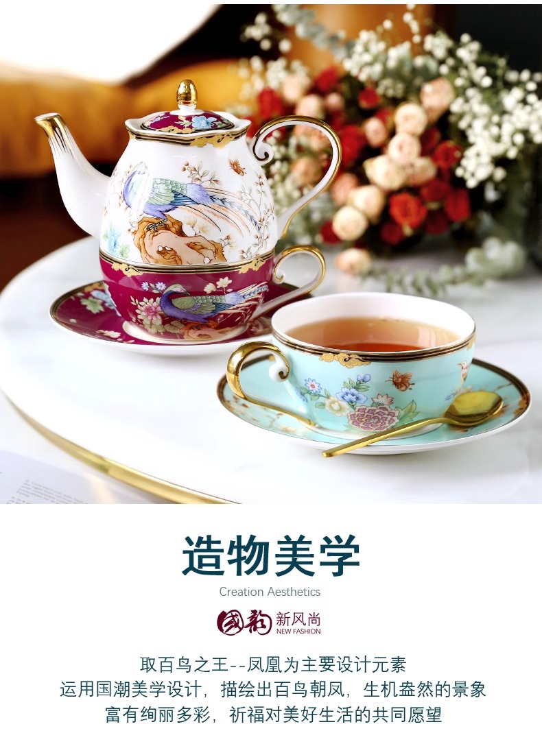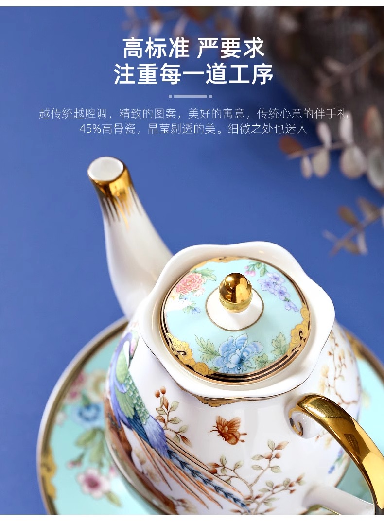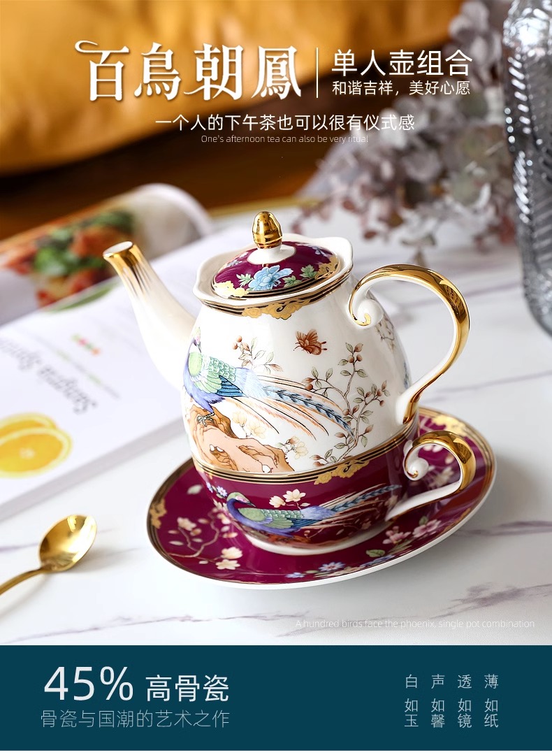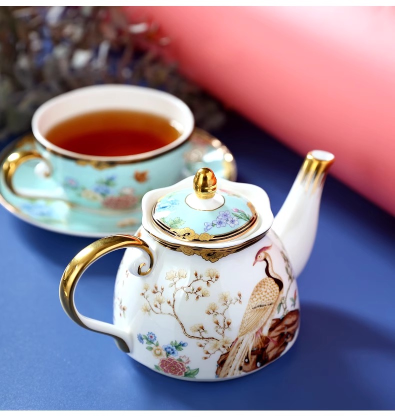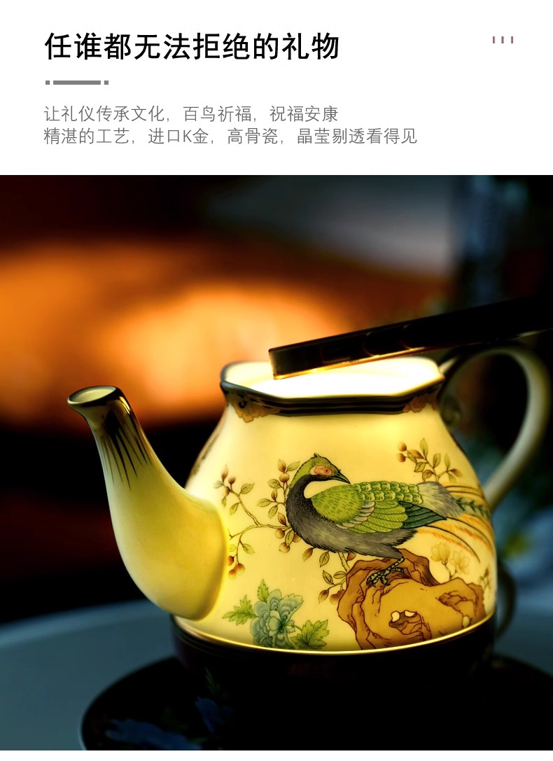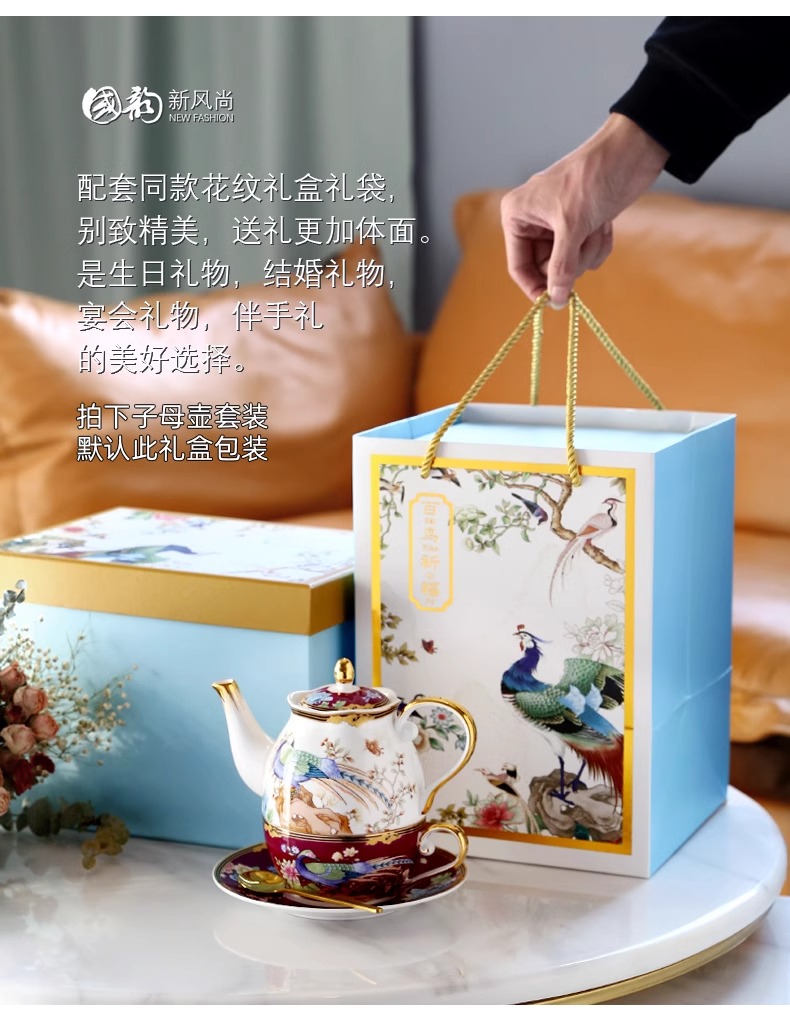 中式百鸟朝凤创意家用轻奢花茶下午茶陶瓷茶具咖啡杯碟套装茶杯壶诺轩百鸟娜蓝子母壶1壶1杯碟礼盒装