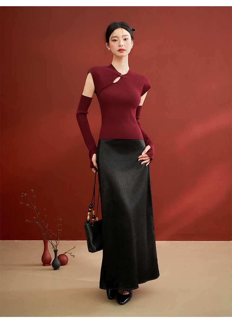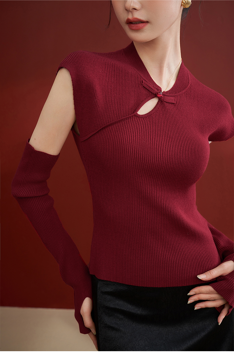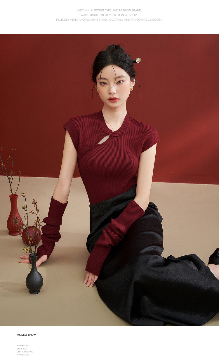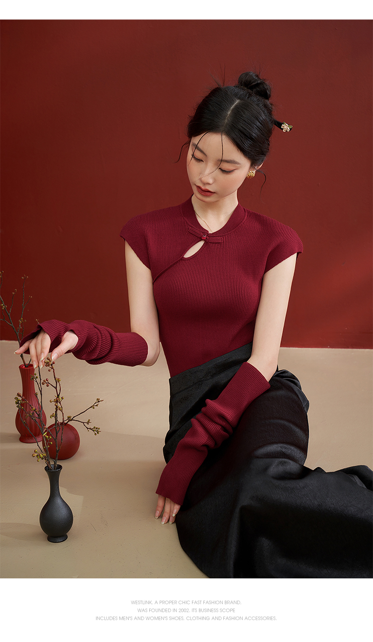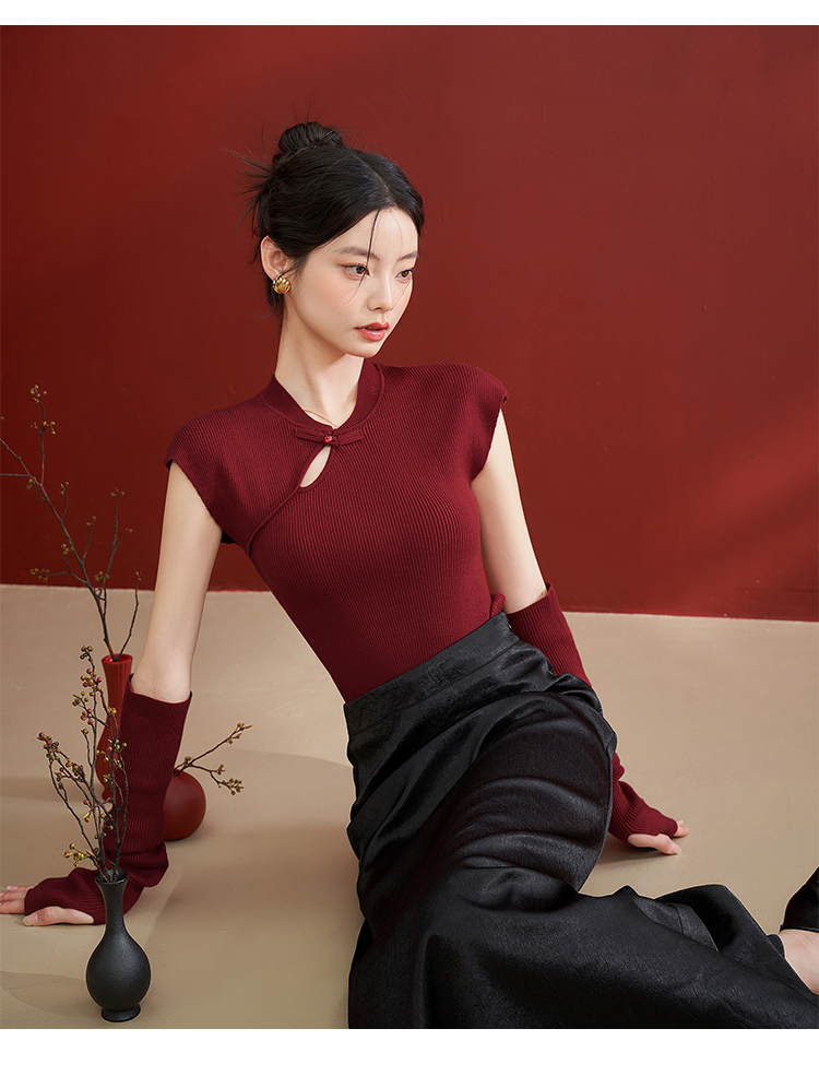 西遇新中式半高领盘扣针织毛衣女2024新款可拆卸袖套毛衣上衣10340089