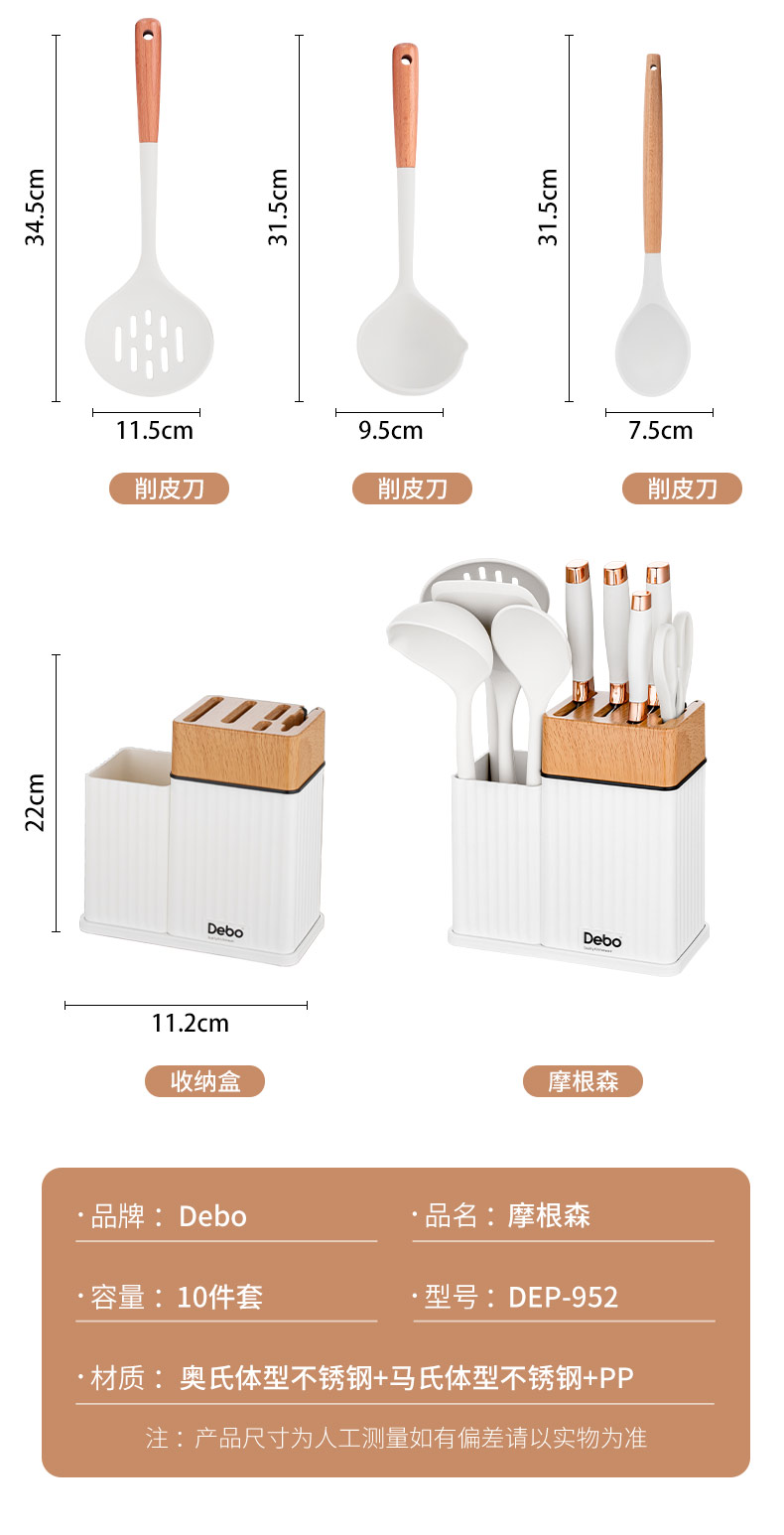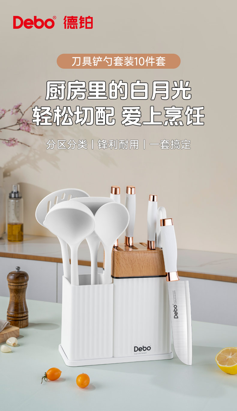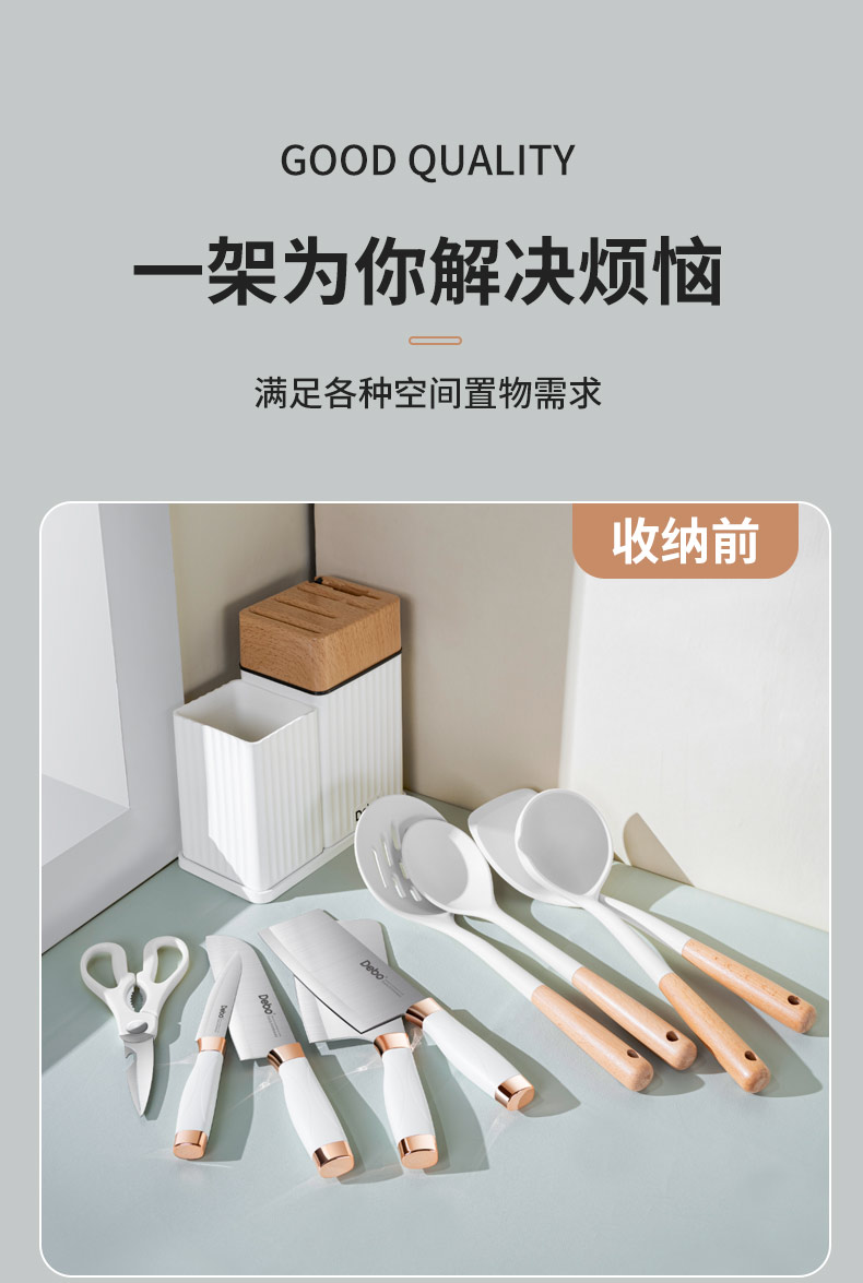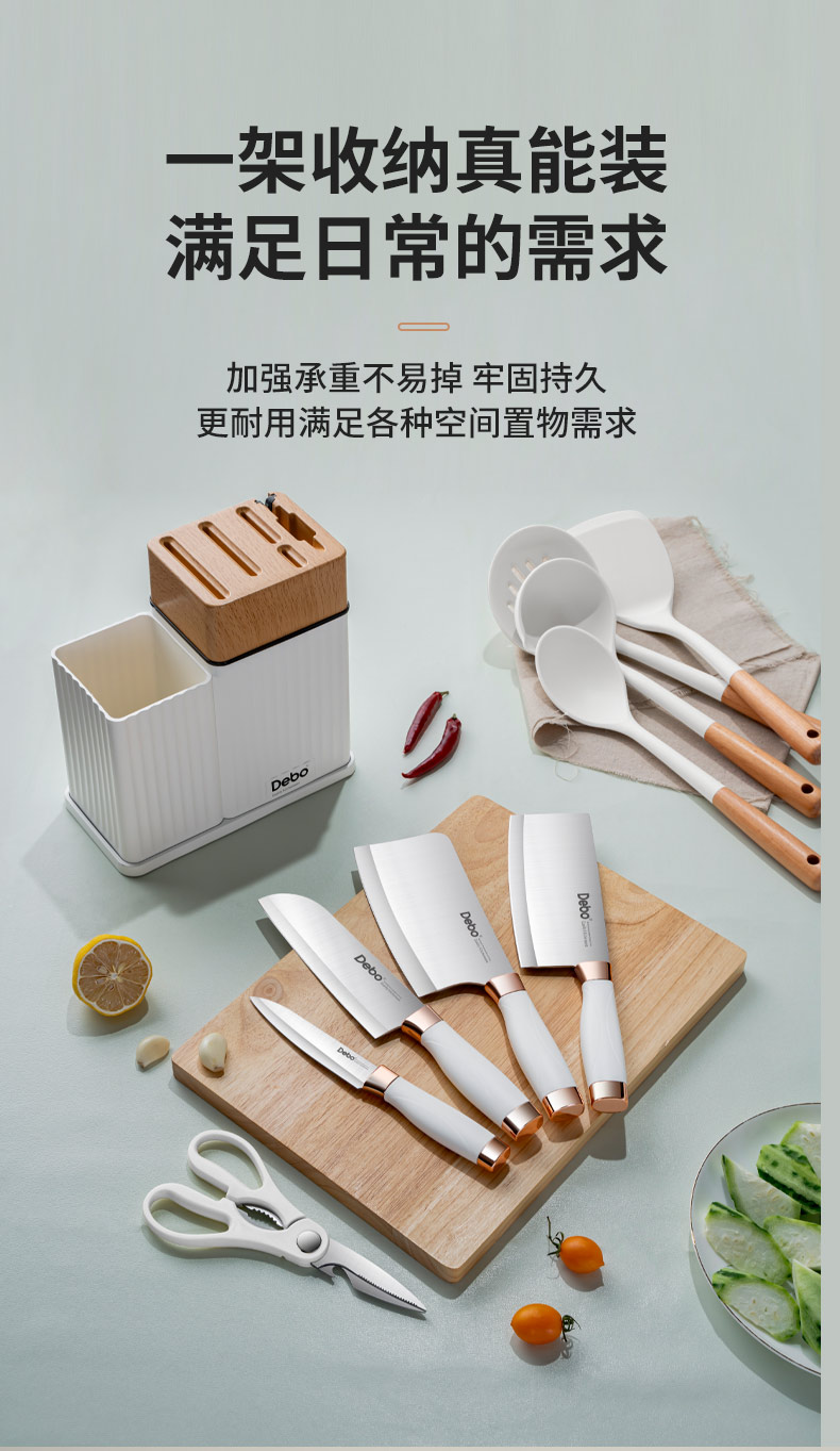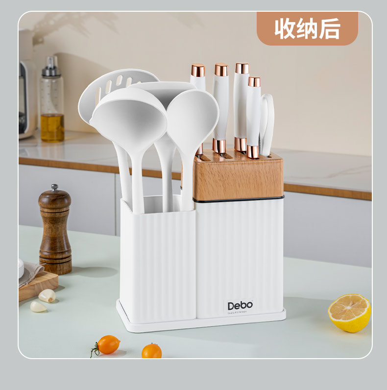 配置:收纳座*1、砍骨刀*1、菜刀*1、多用刀*1、水果刀*1、厨房剪*1、硅胶汤勺*1、 硅胶炒勺*1、硅胶饭勺*1、硅胶漏勺*1