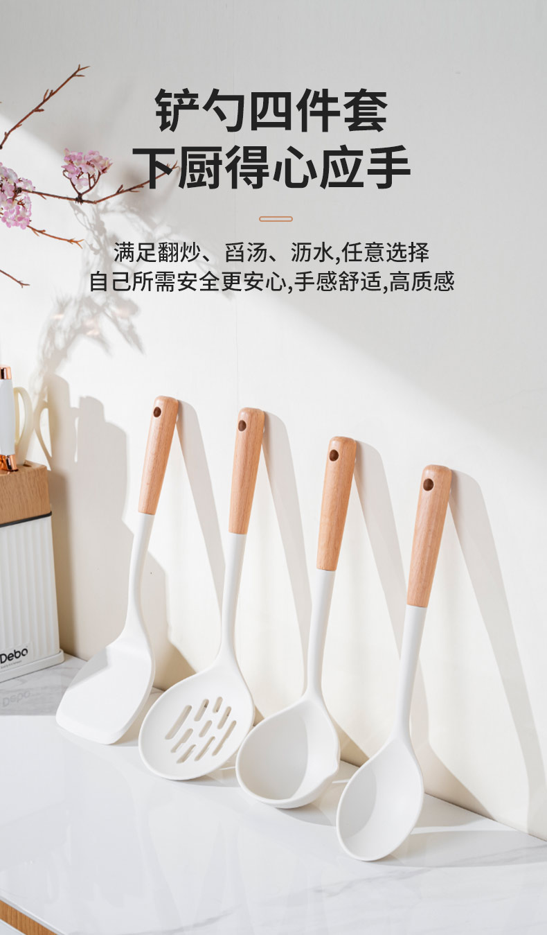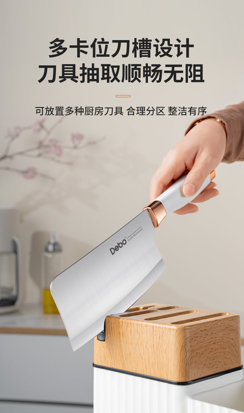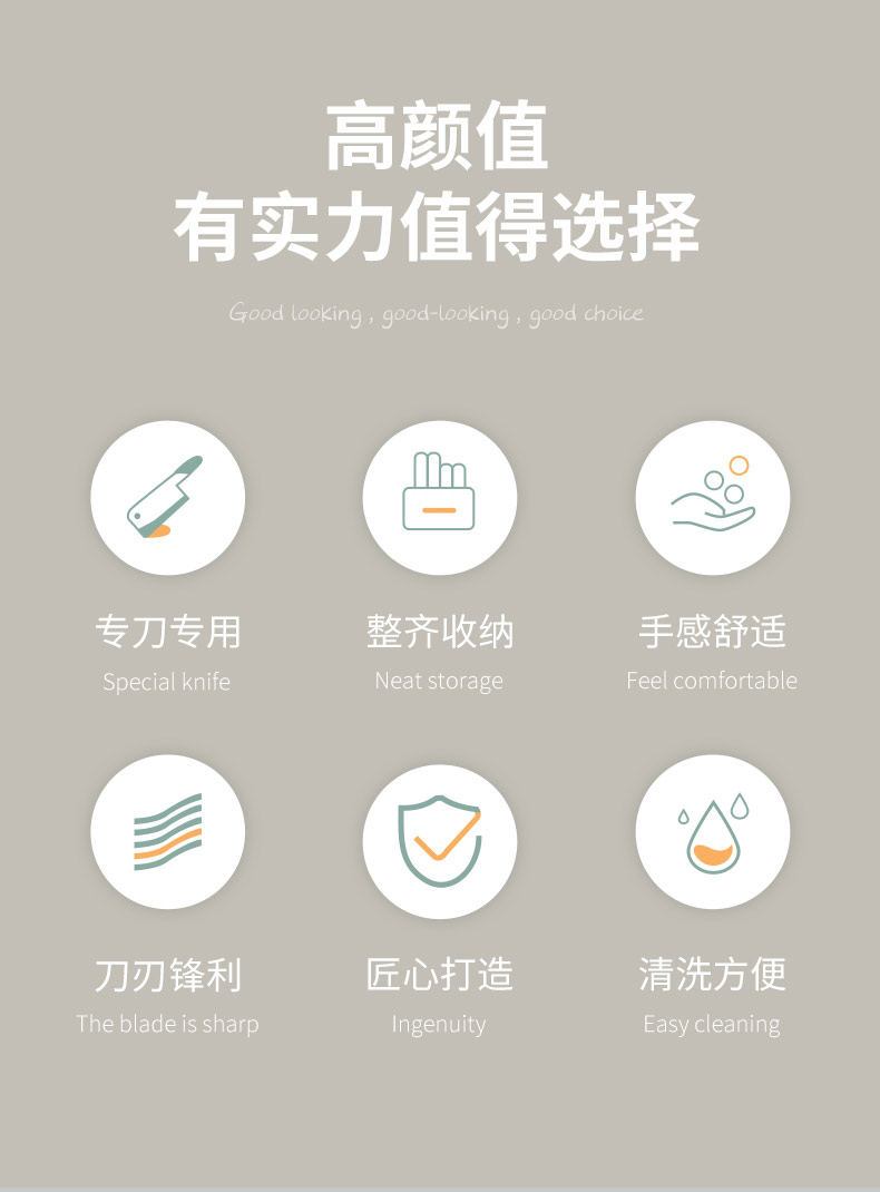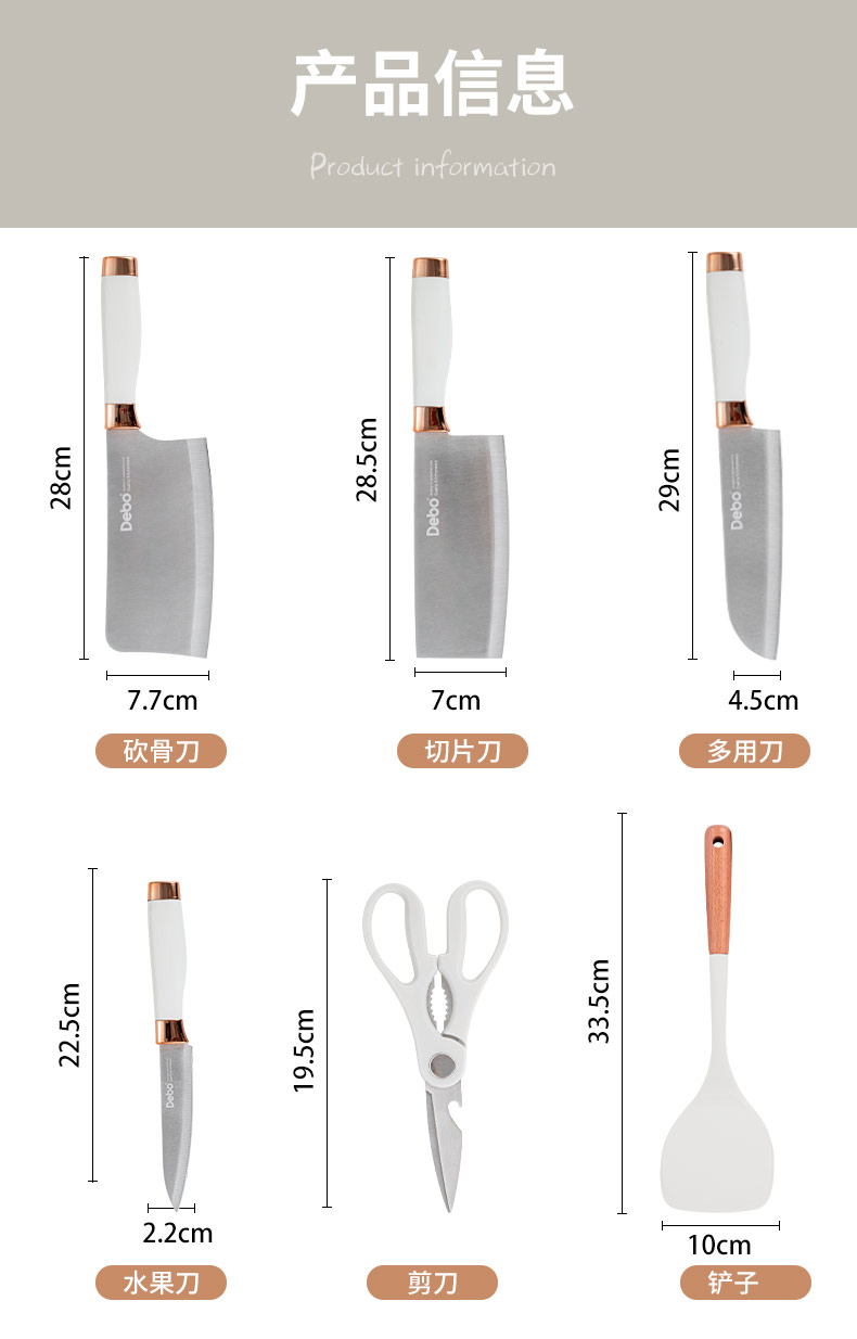 配置:收纳座*1、砍骨刀*1、菜刀*1、多用刀*1、水果刀*1、厨房剪*1、硅胶汤勺*1、 硅胶炒勺*1、硅胶饭勺*1、硅胶漏勺*1