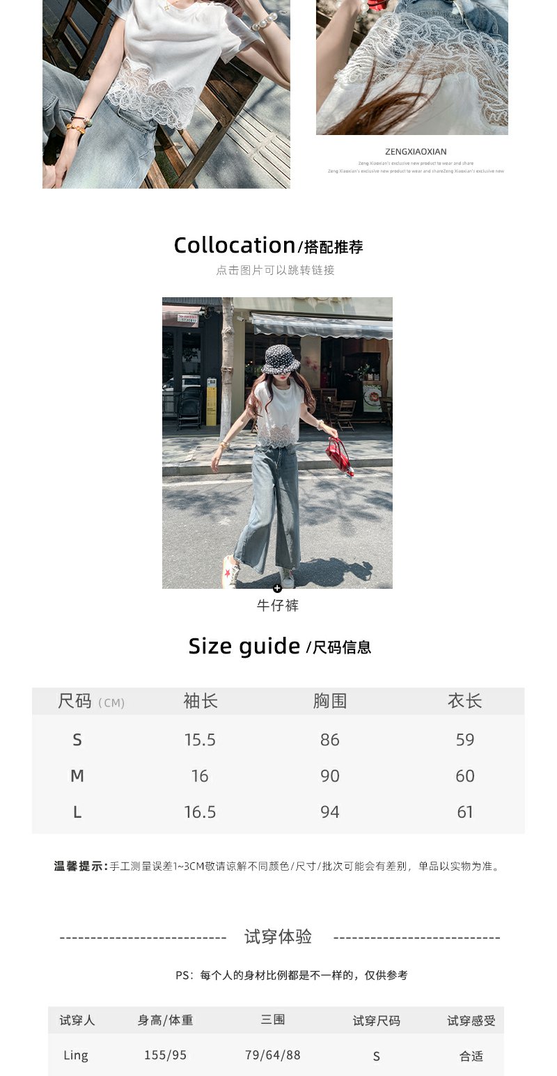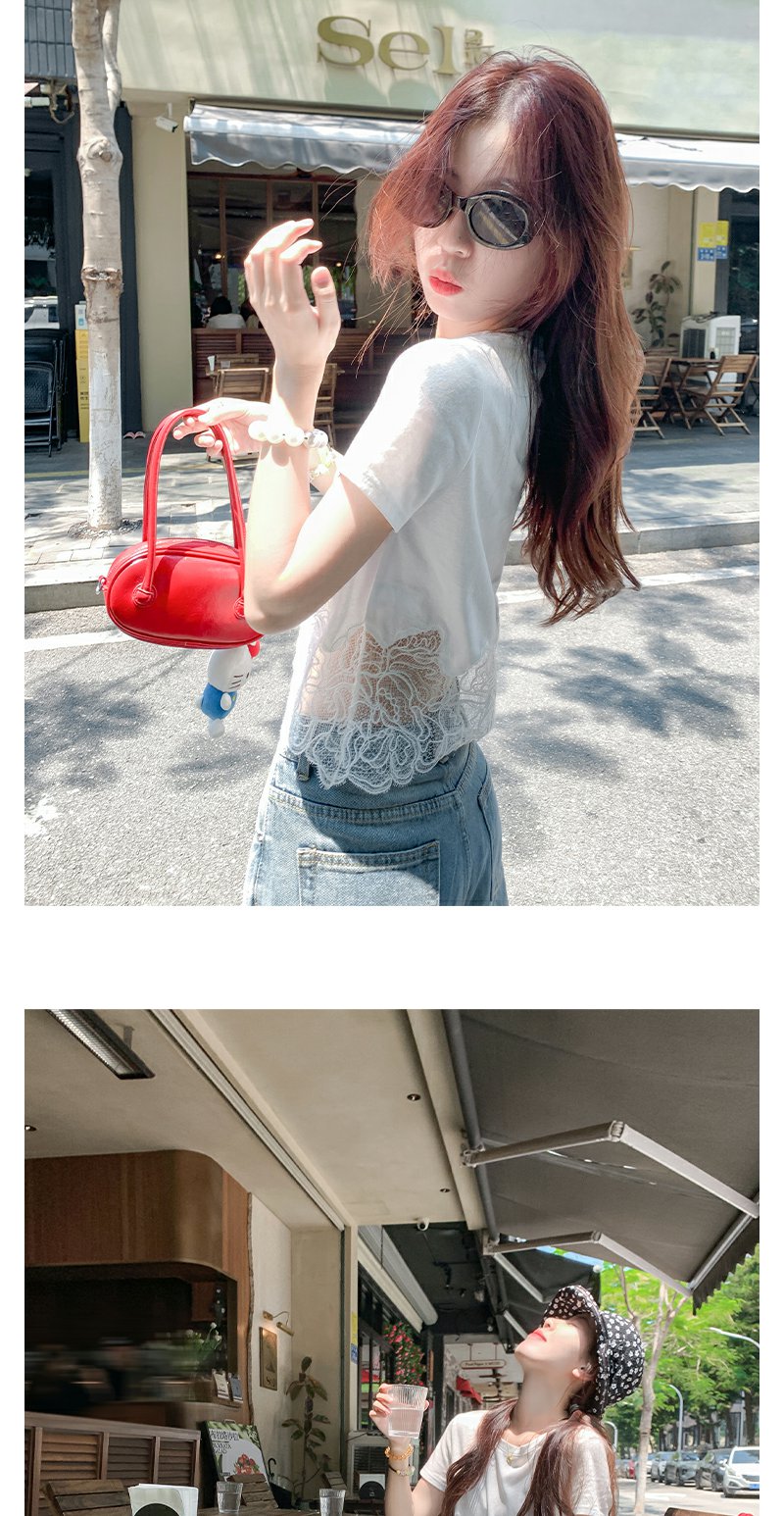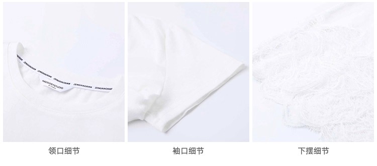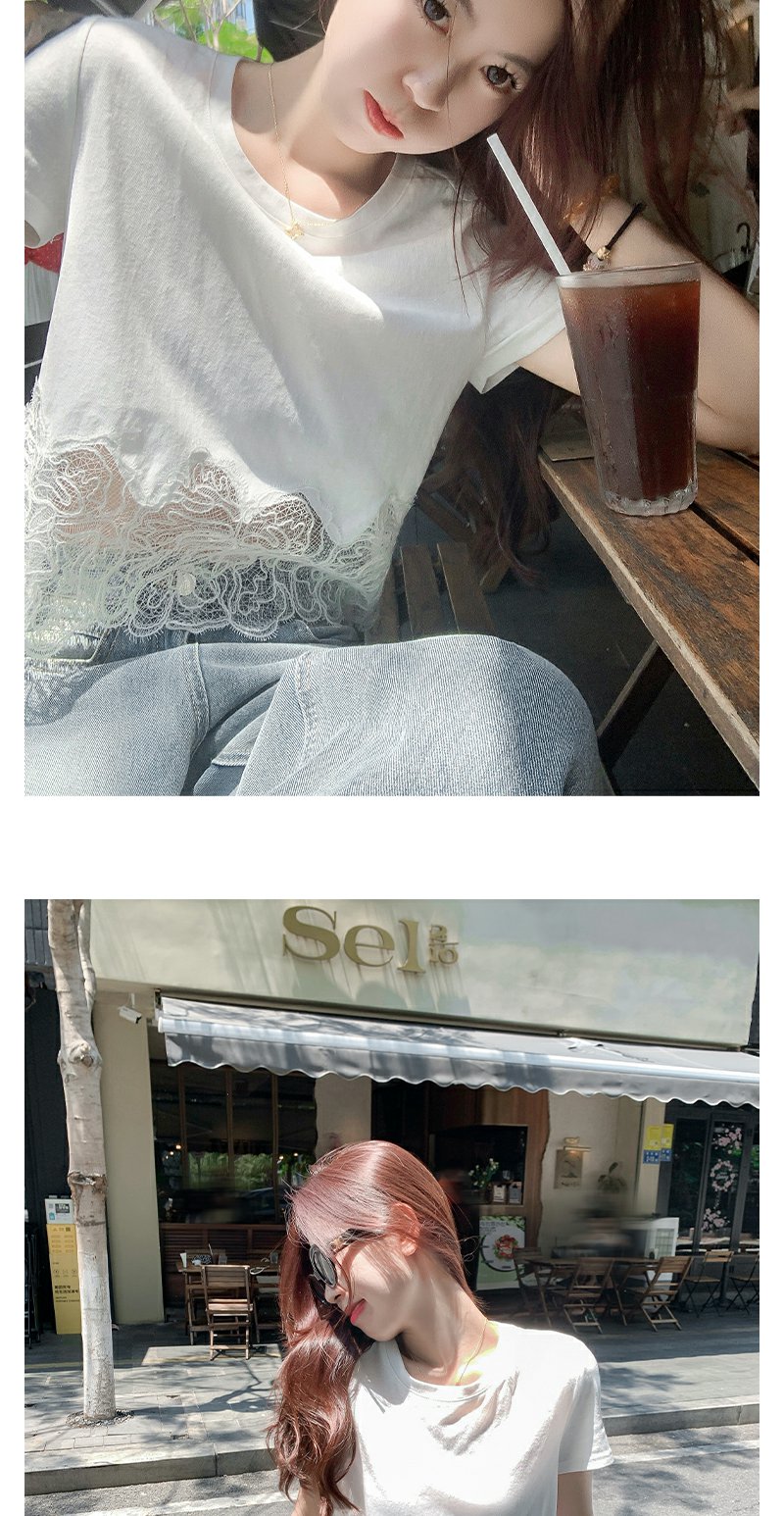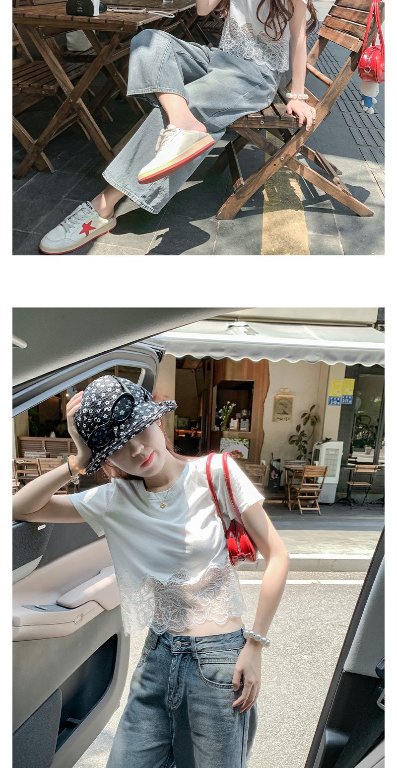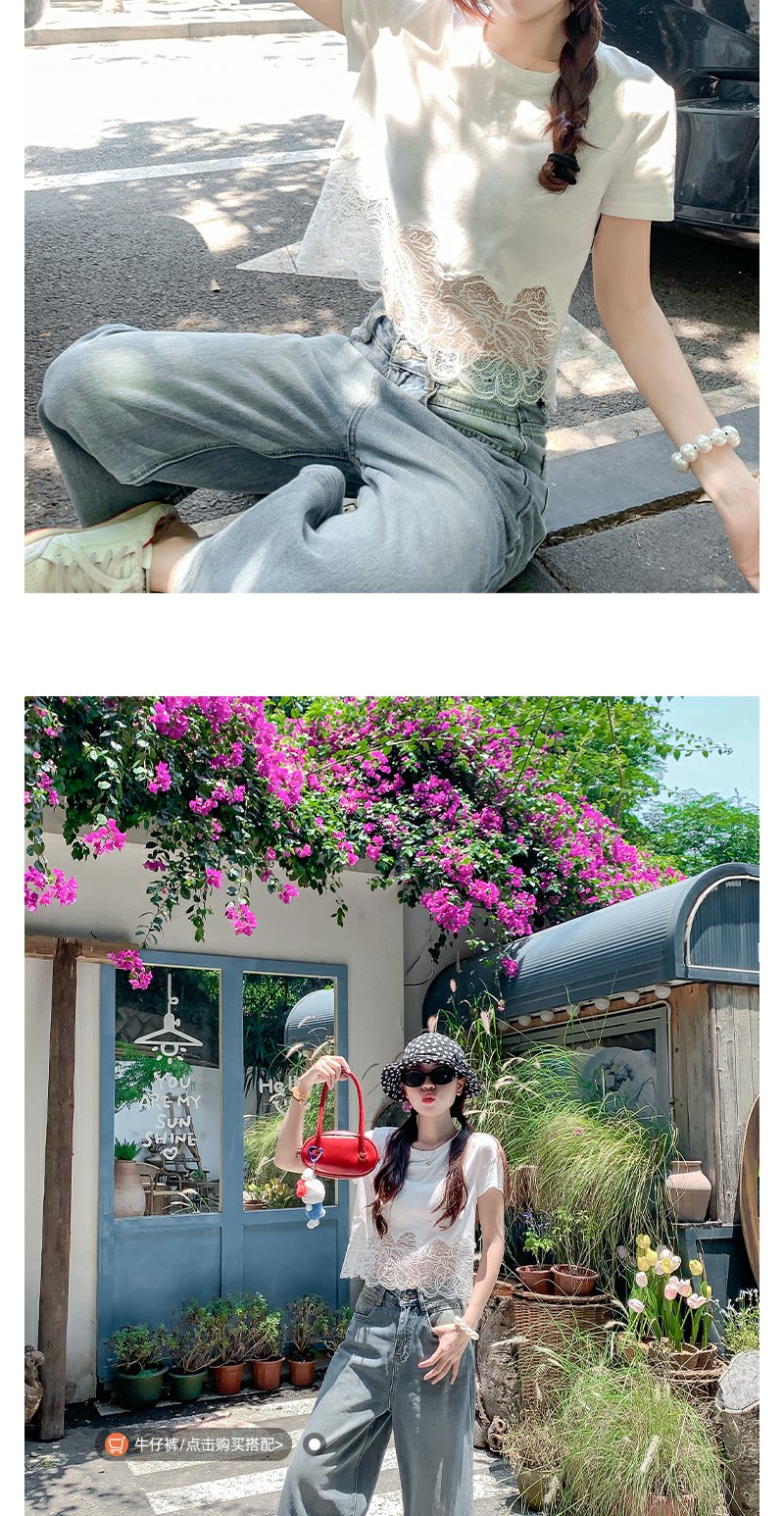 <曾小咸推荐>纯欲不规则蕾丝花边短袖T恤