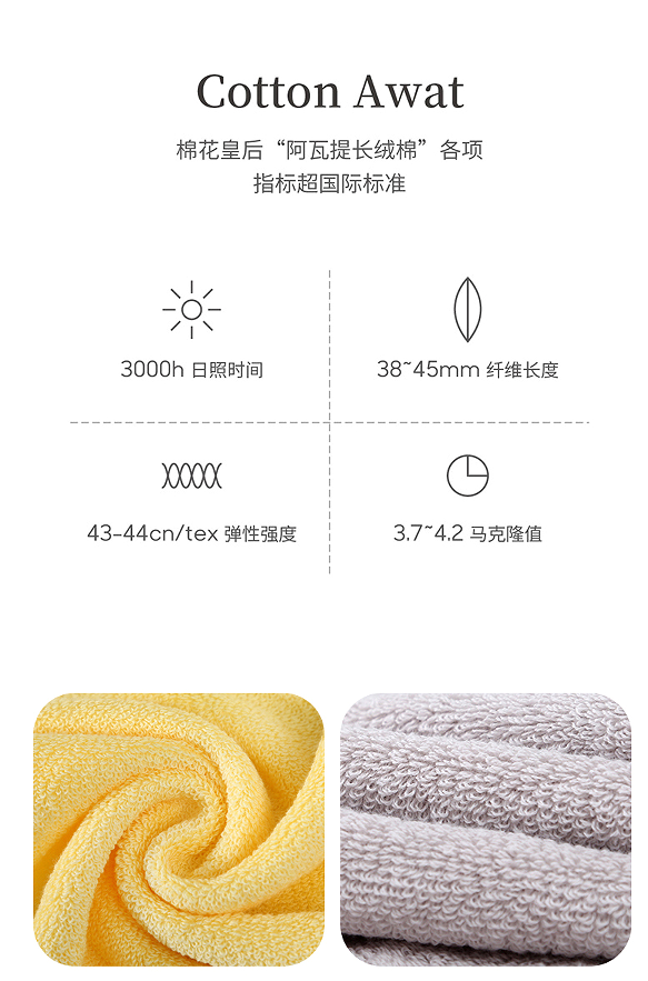 吸水性强 擦干秀发仅需一条毛巾,3秒吸水性远超国标优等品10秒标准,不易掉毛 每次肌肤之亲不留毛絮,阿瓦提长绒棉纤维更长毛羽不易脱落 。