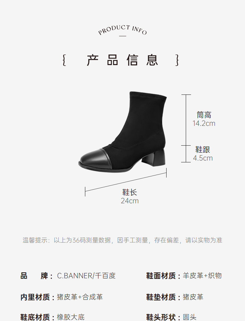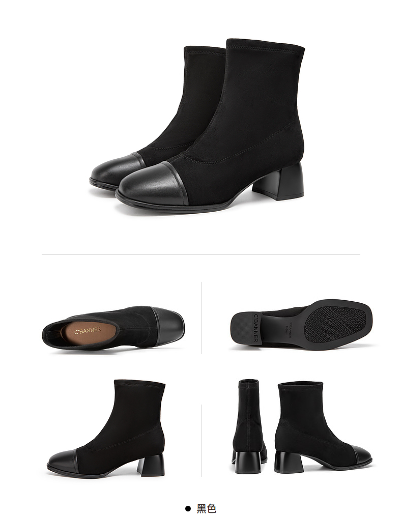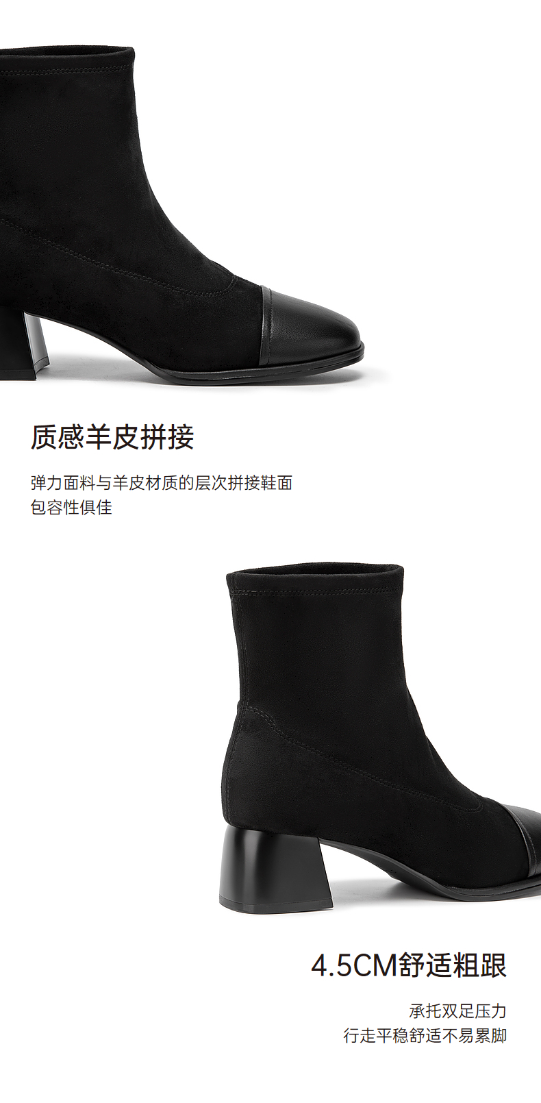 千百度粗高跟靴拼接时装靴冬季瘦瘦靴洋气小短靴女鞋保暖A23576501