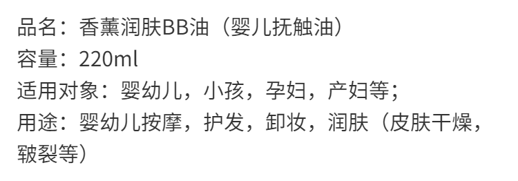 婴儿润肤BB油香薰按摩精油抚触油身体护肤宝宝孕产妇可用220ml装