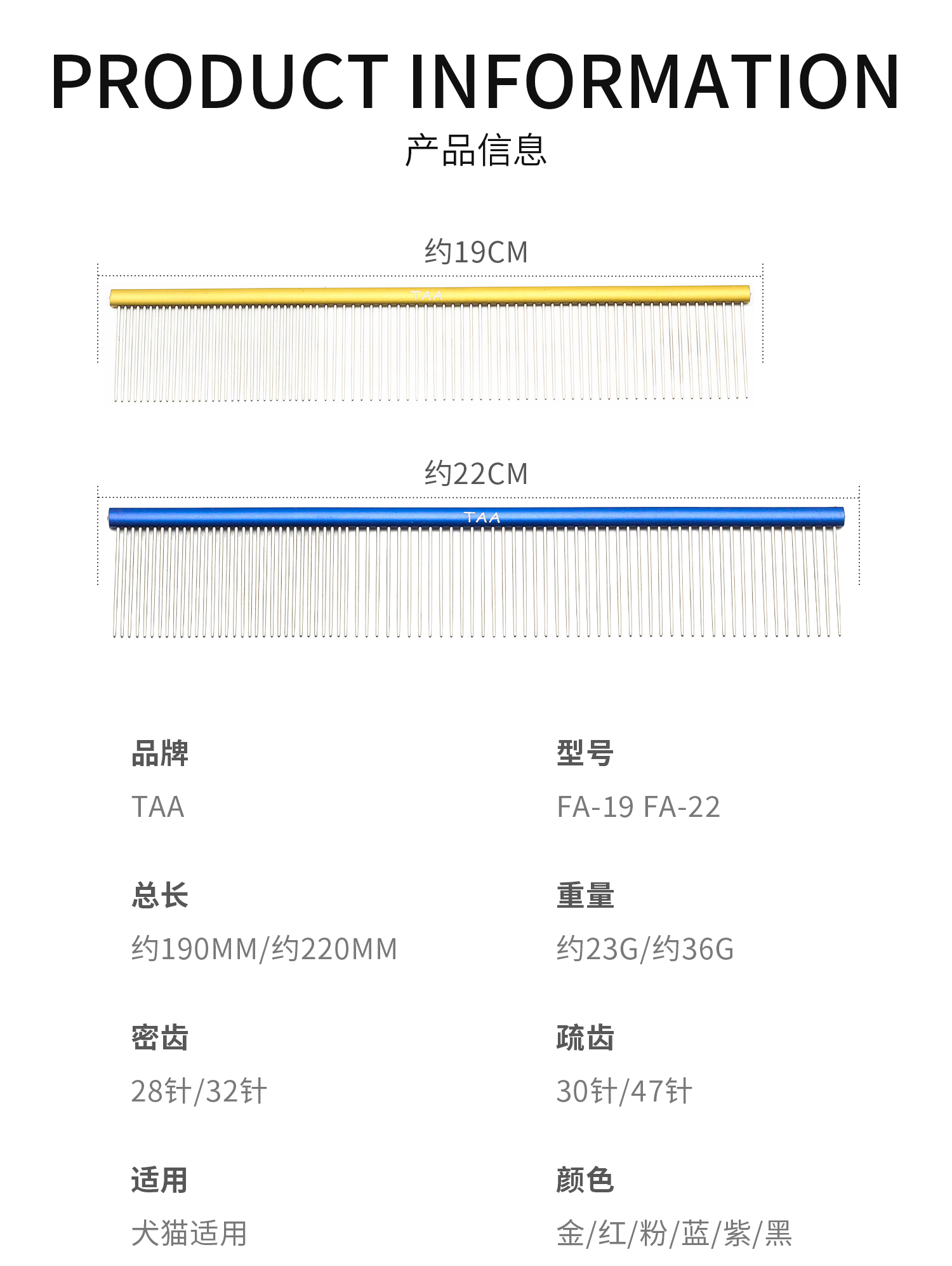 TAA它它宠物美容彩色排梳FA-19 /FA-22狗猫疏密两用