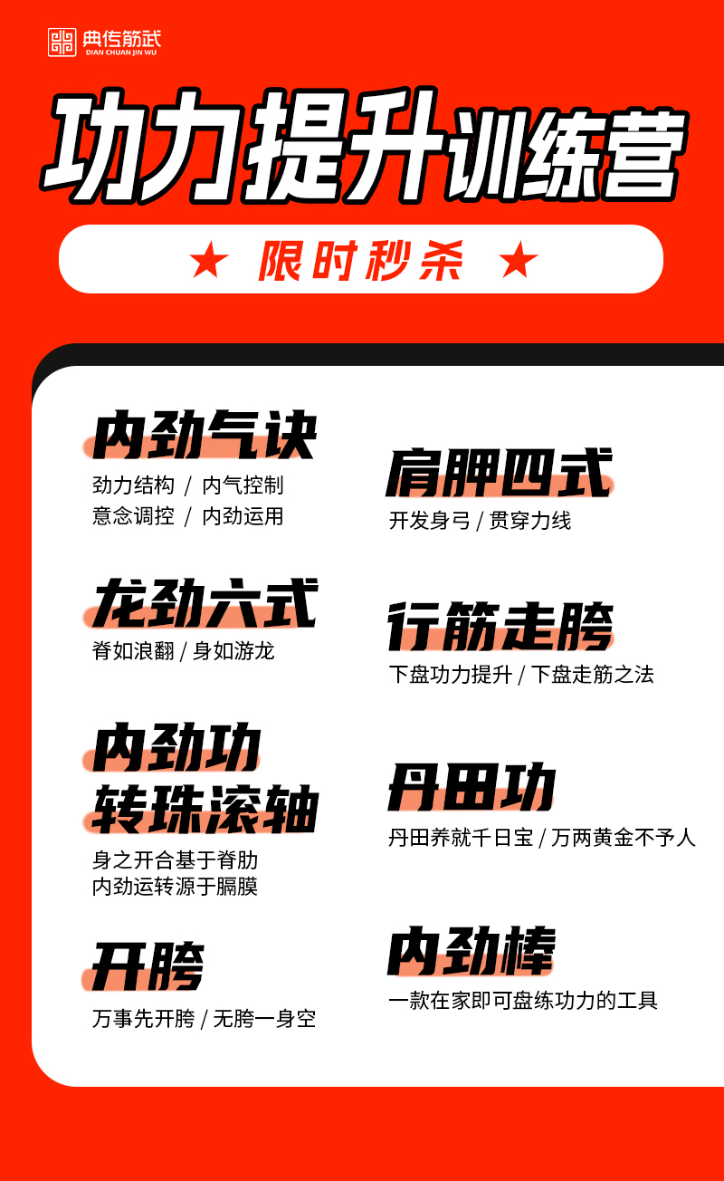典传筋骨,传承于中华武术训练体系最精华部分,与解剖学、人体力学等科学理论相融合,致力于人体筋骨结构的内在开发与强化,为健康打下坚实基础。