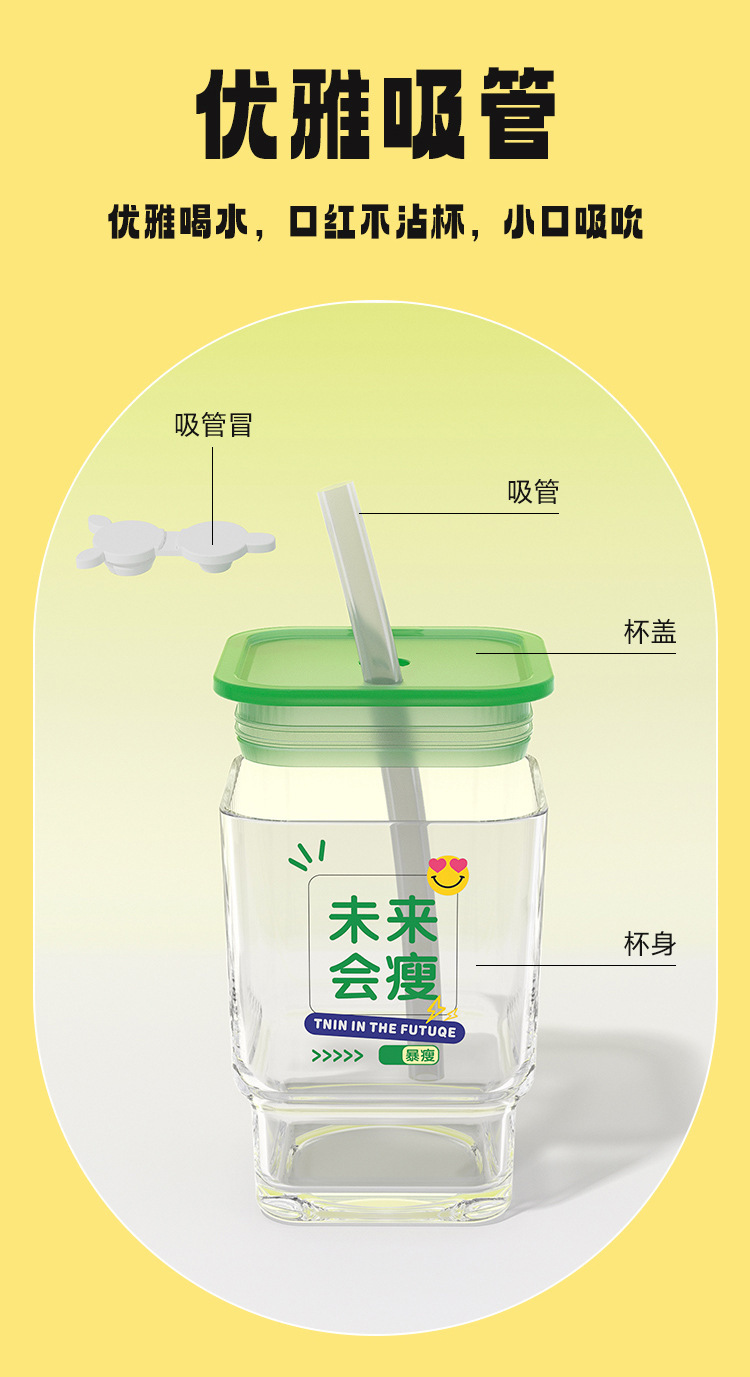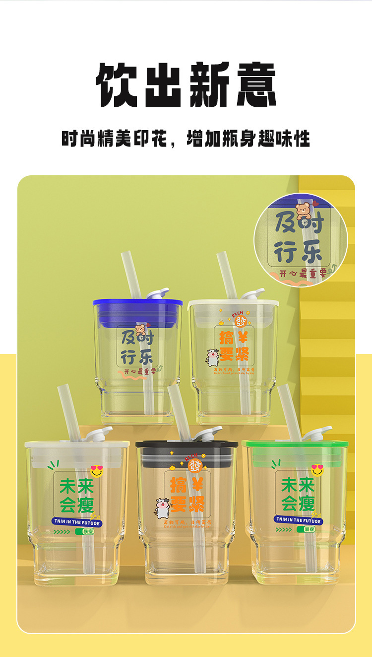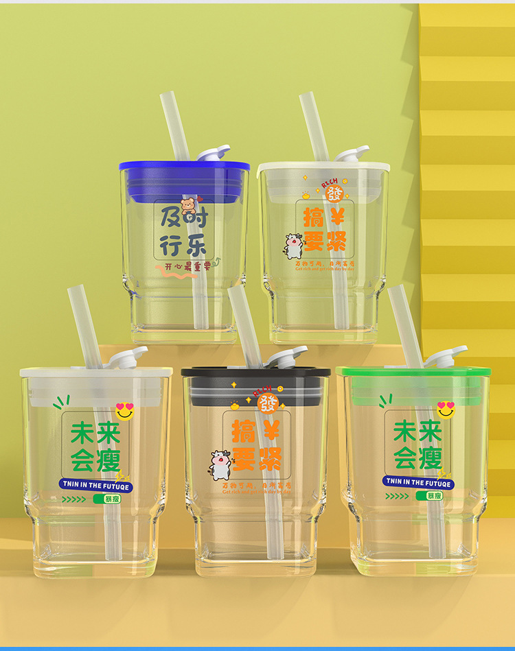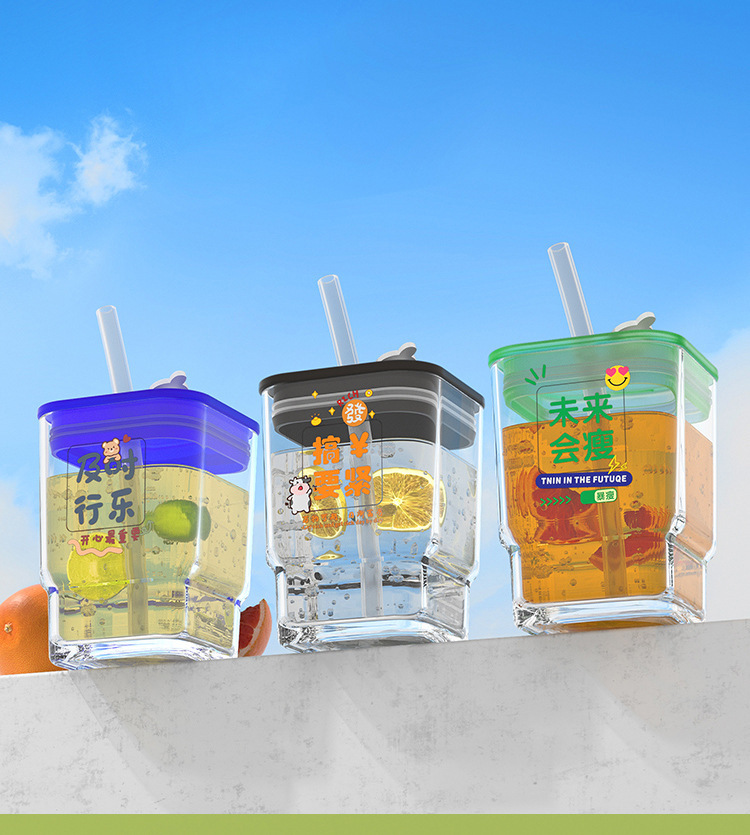 【积分兑换,会员专享福利】「6款可选!高颜值玻璃杯」趣味文字带盖ins风方形水杯 密封学生吸管杯礼品餐饮用具