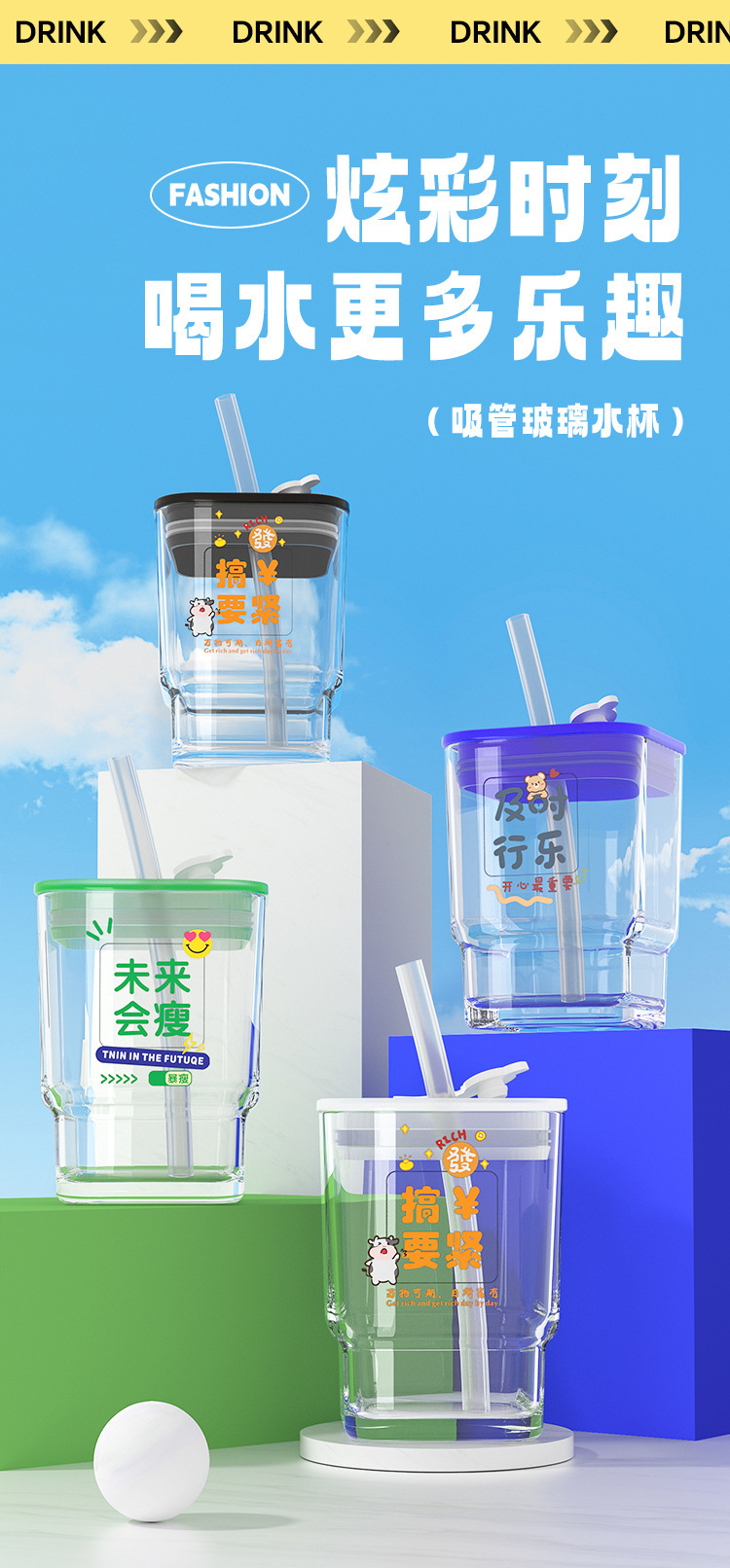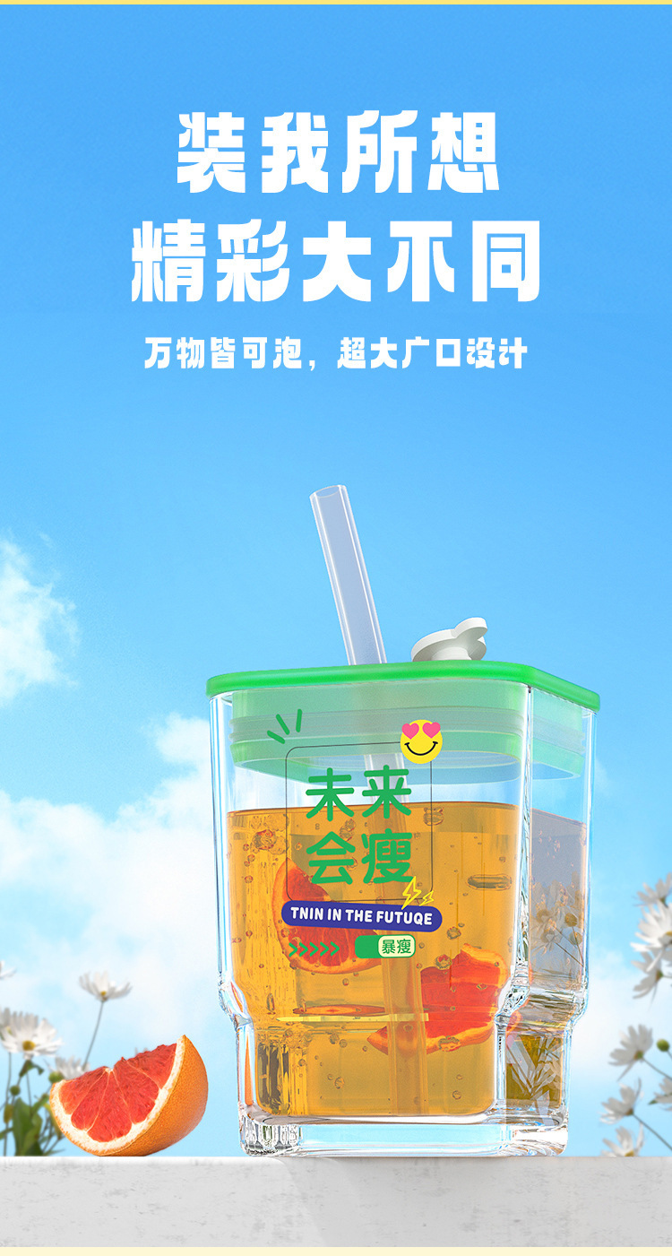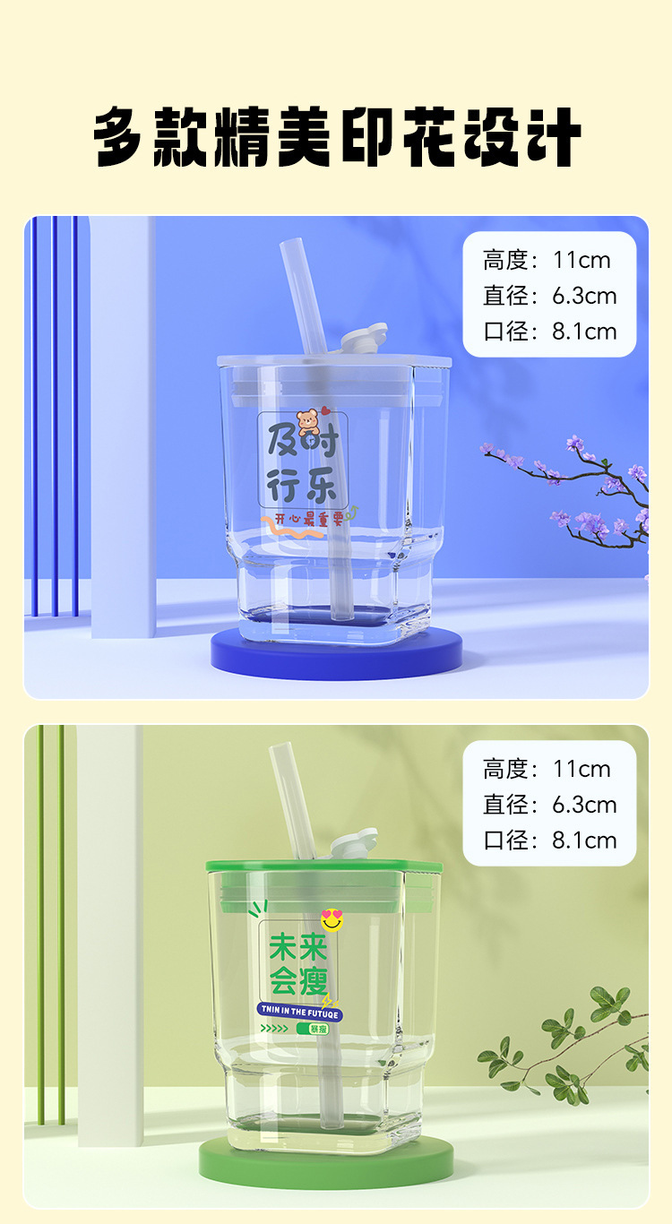 【积分兑换,会员专享福利】「6款可选!高颜值玻璃杯」趣味文字带盖ins风方形水杯 密封学生吸管杯礼品餐饮用具