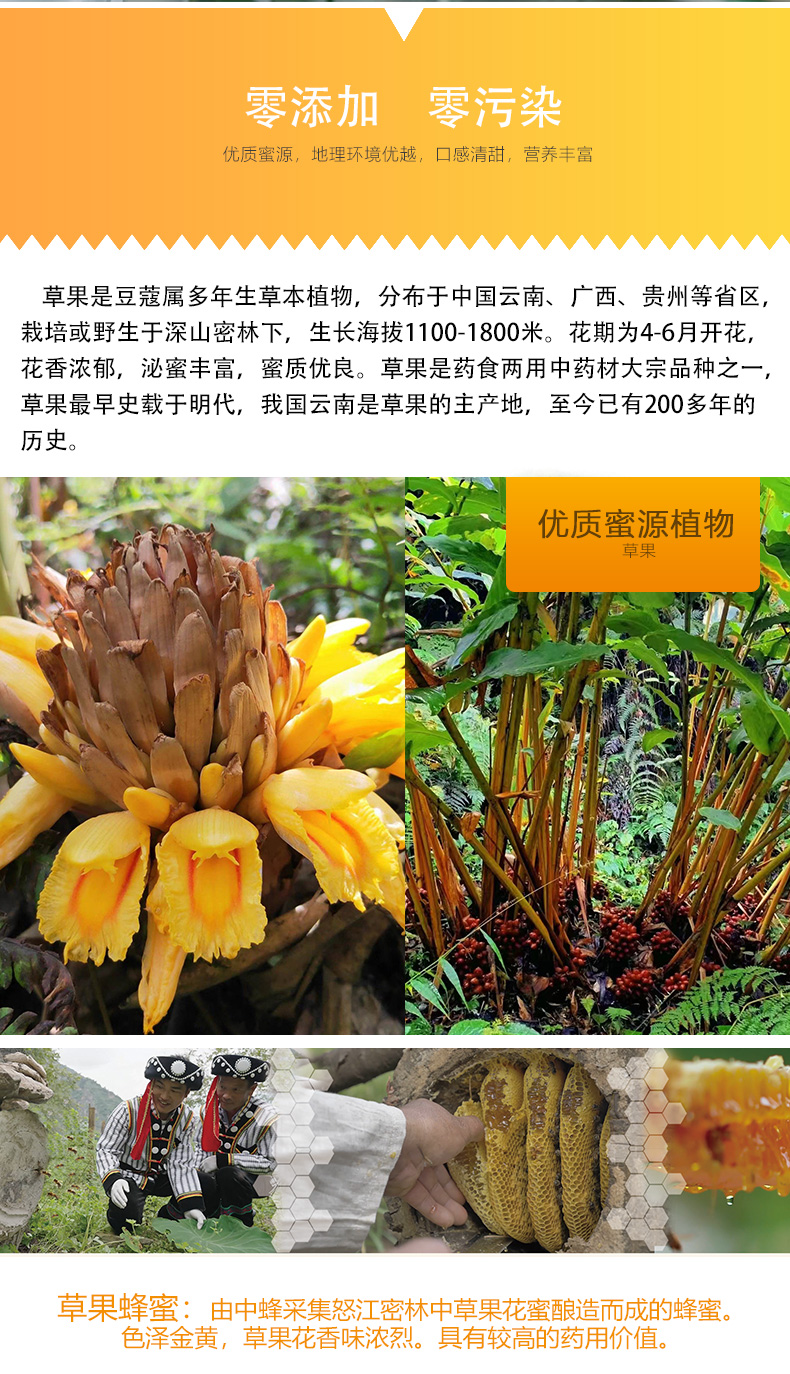 草果蜂蜜简介:由中蜂采集怒江州深山密林中草果花蜜酿造而成的蜂蜜。色泽金黄,草果花香味浓烈,草果蜂蜜富含草果酮和新陈皮苷等特色物质,是怒江州特有蜂蜜产品。