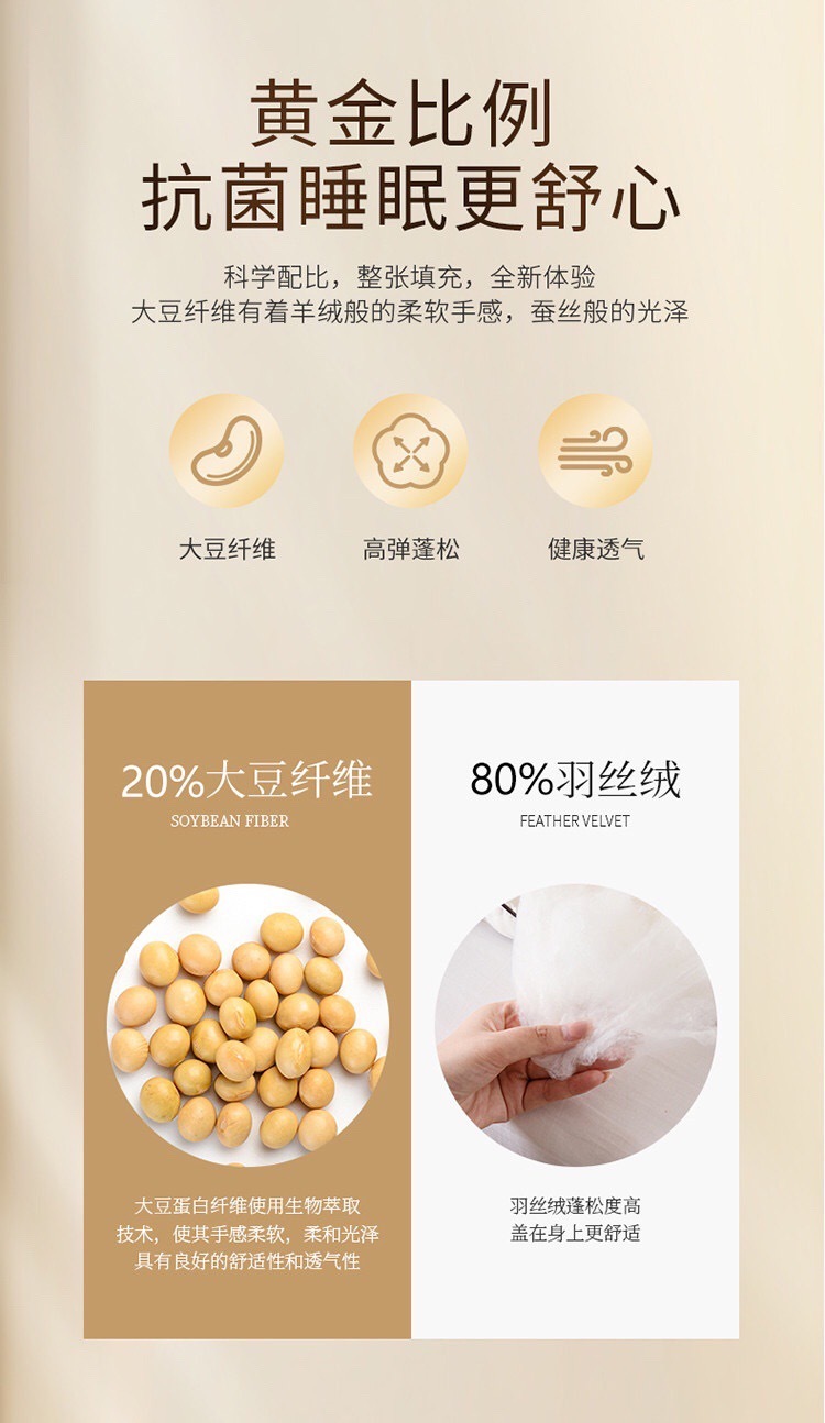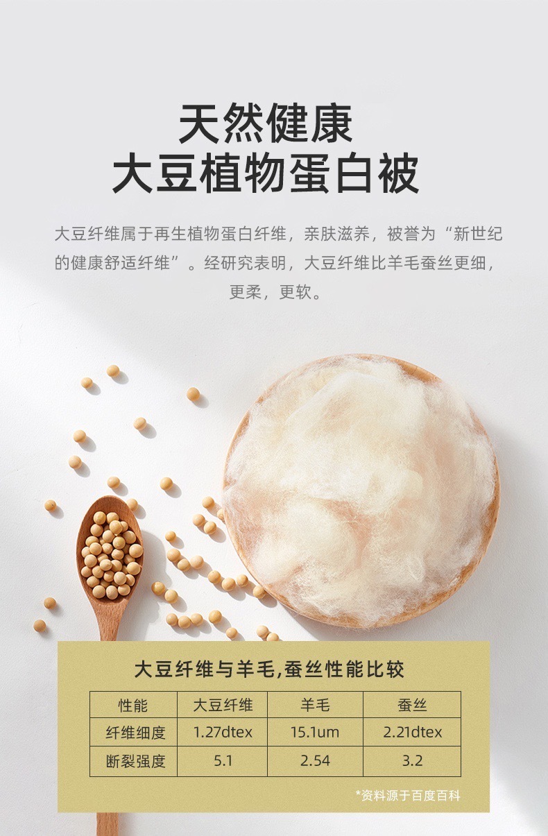 4️⃣我们这款A类原棉大豆被的大豆被具有羊绒的手感,蚕丝的光泽,羊毛的保暖性,棉的吸湿性。在科学的配比研究下,大豆含量在20%,超细抗菌羽丝在80%的黄金配比下,达到最好的效果!
