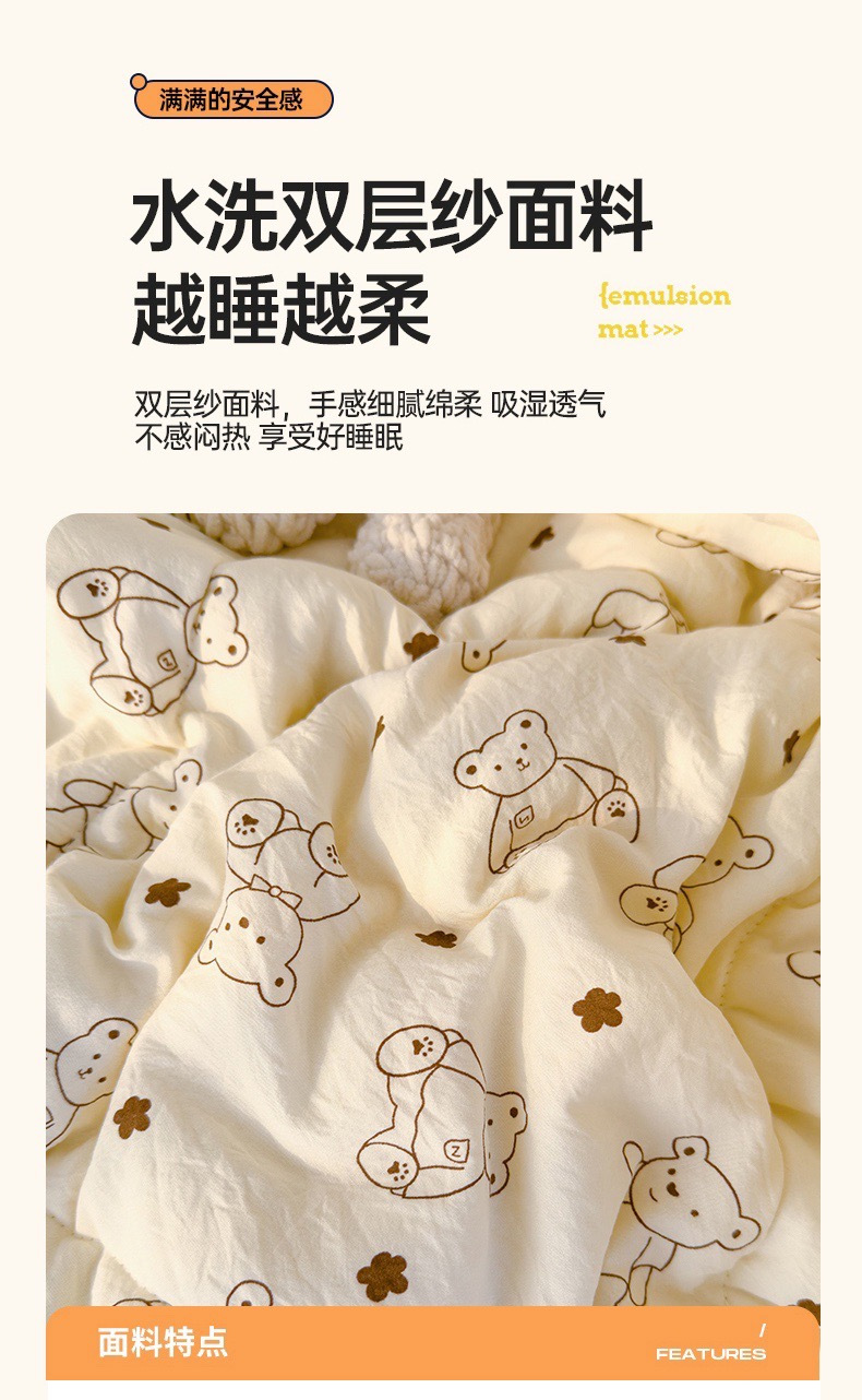 1、面料是水洗双层纱 国家A类标准纺织品安全标准。可直接接触皮肤使用。