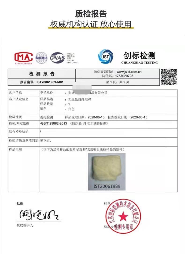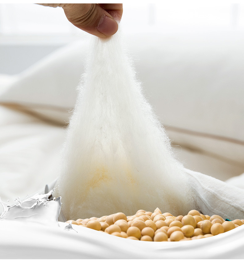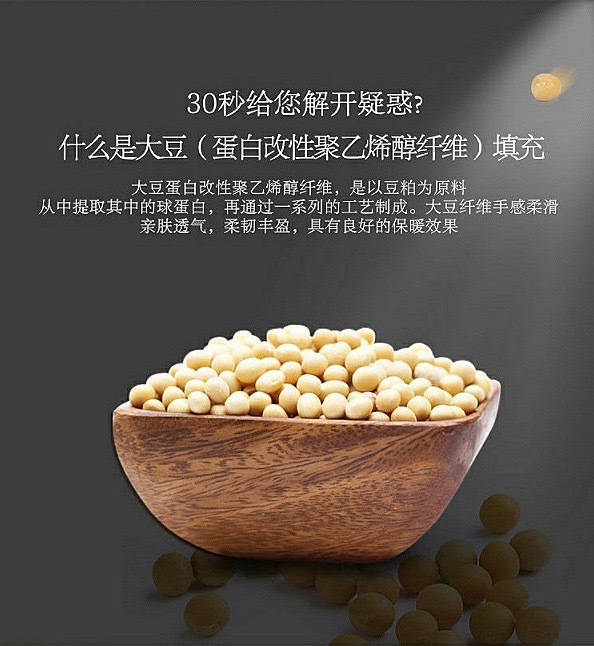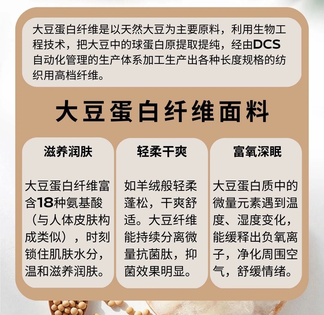 世纪的健康舒适纤维”和“肌肤喜欢的好面料”。大豆蛋白纤维外层基本上都是蛋白质,含有人体必需的多种氨基酸!