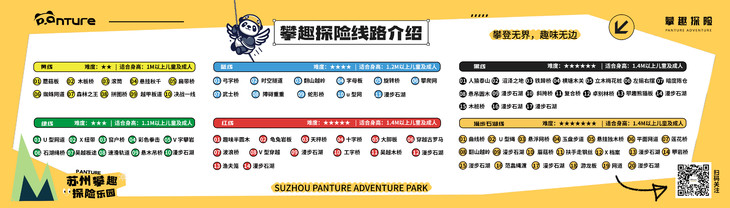 苏州攀趣探险乐园项目引进自瑞士,地处石湖景区核心位置。乐园主打的丛林飞跃是风靡全球的户外探险项目。乐园全套装备及关卡设备均从瑞士KANOPEO公司原装进口,并获得欧盟安全检测认证。