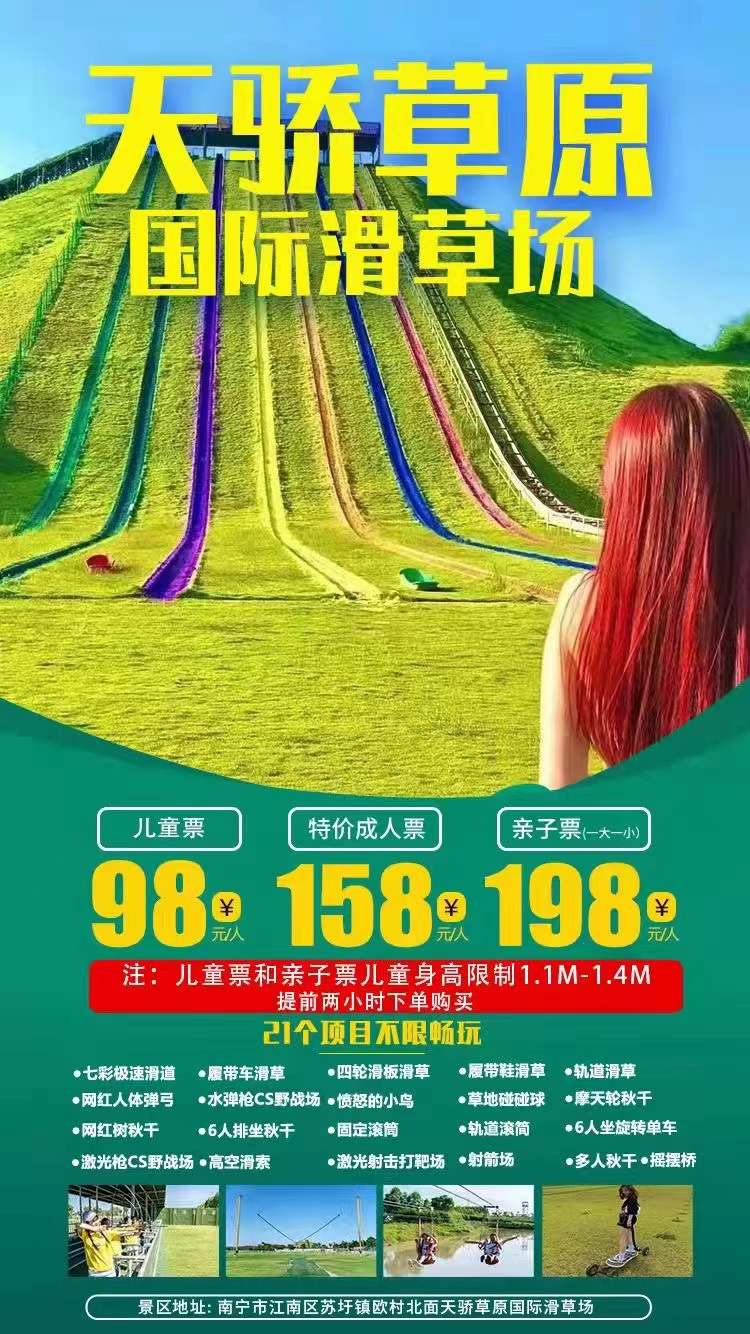 自驾出行:从南宁江南客运站到迎凯路--朋展路--那洪大道--金阳路--壮锦大道--南友高速(约30分钟车程)从苏圩互通到天骄草原国际滑草场