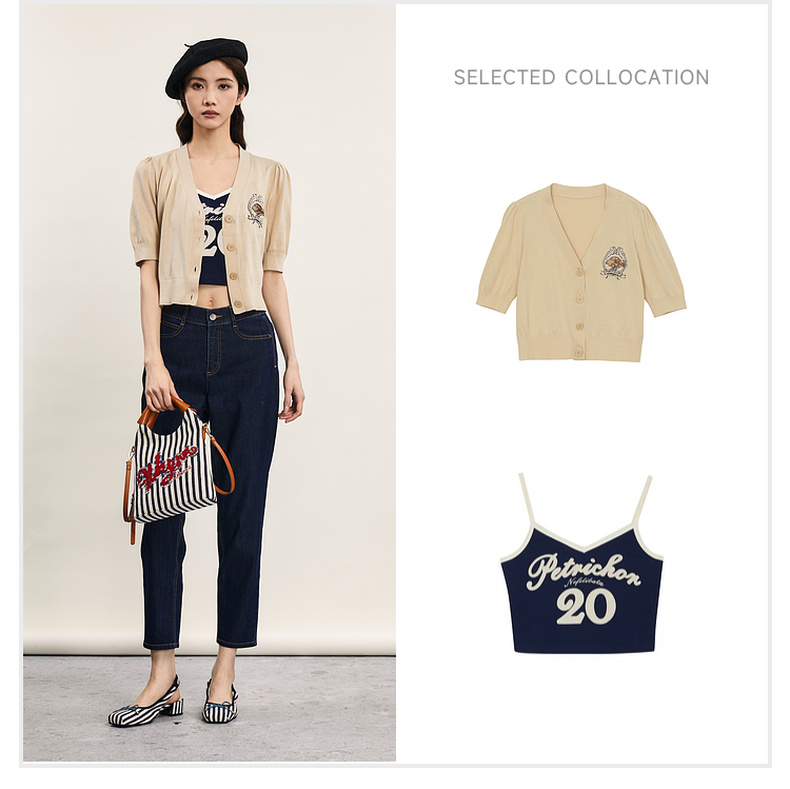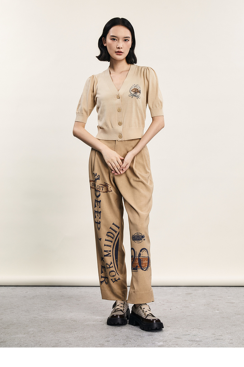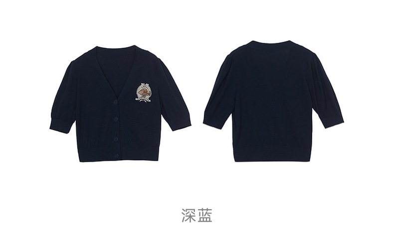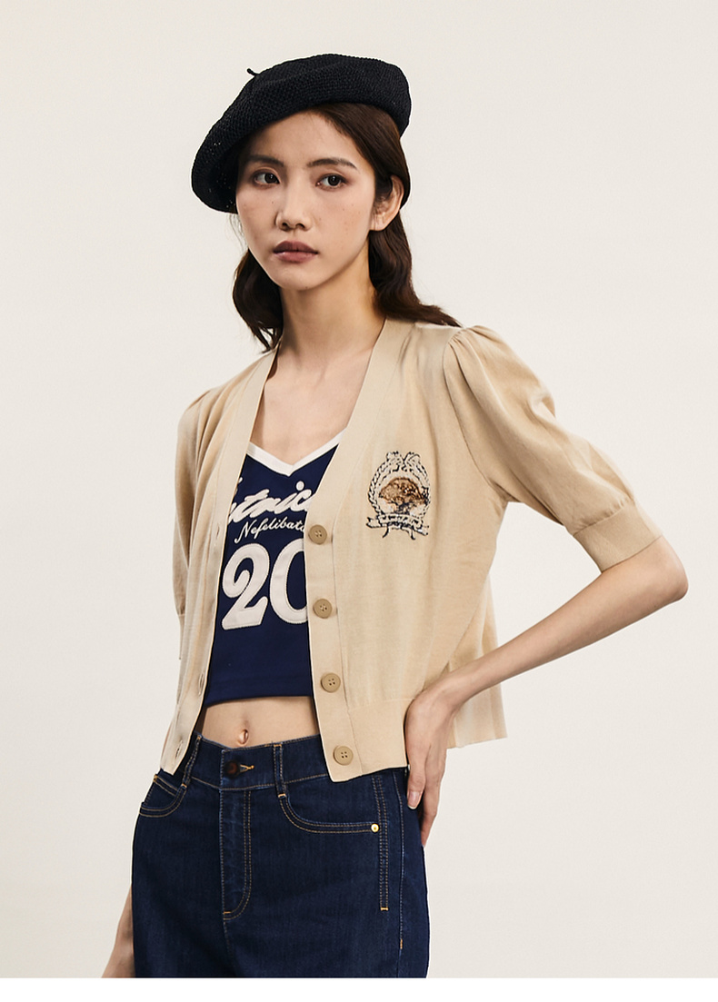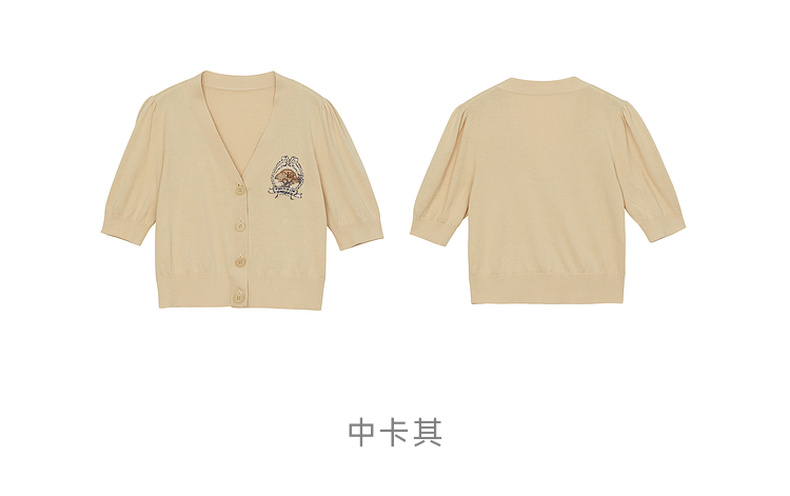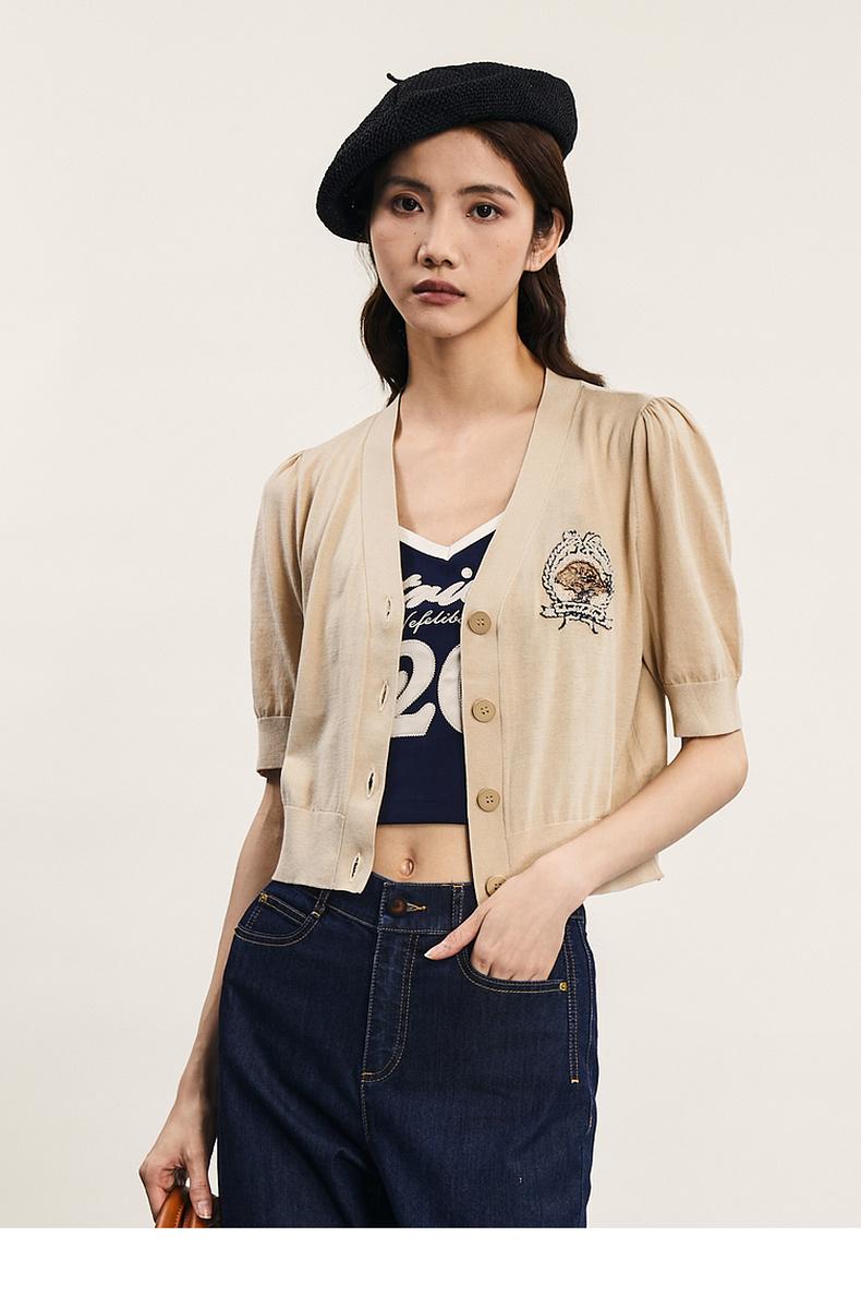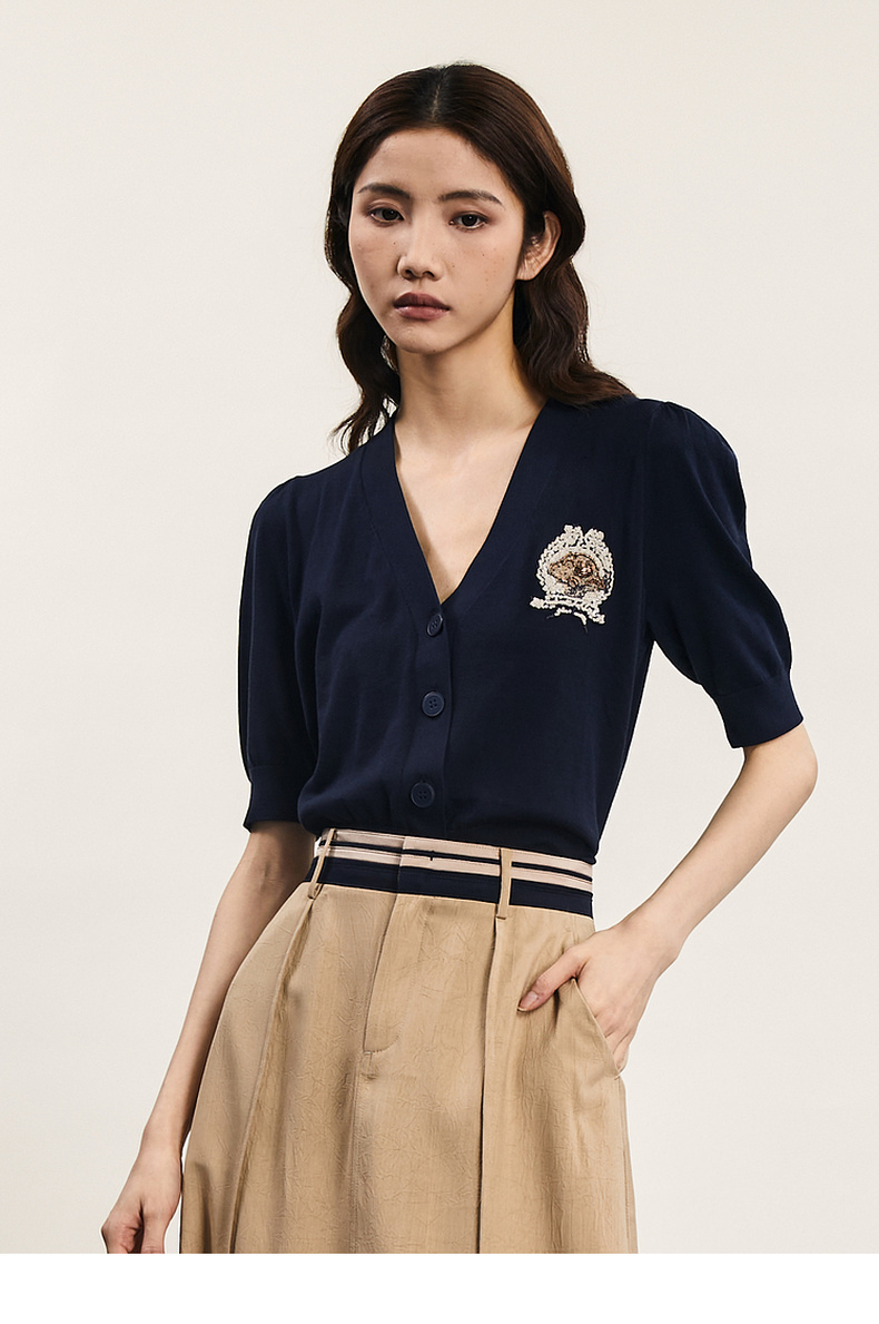 谜底V领针织开衫女士2024年夏季新品文艺风章仔绣花上衣242MZ0850