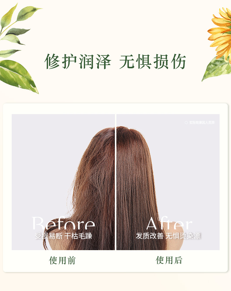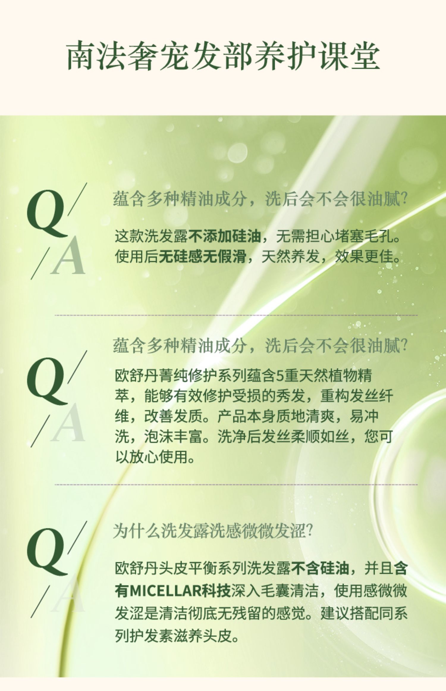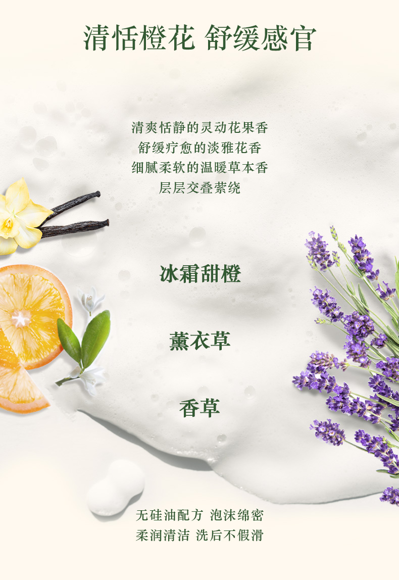 以温和植物性清洁成分为基底,不含矽灵,蕴含欧白芷、薰衣草、天竺葵、依兰依兰与甜橙五种草本精华油,为干燥受损发质带来修护、强化、促进再生及柔順作用。添加植物性氨基酸能加强修复、滋养强化发质与维他命原B5,修补干枯分岔发丝,使秀发柔顺不打结,发质呈现柔顺动人,闪耀如丝缎般的亮泽。
