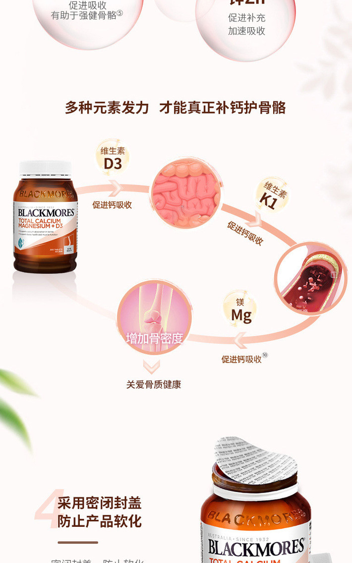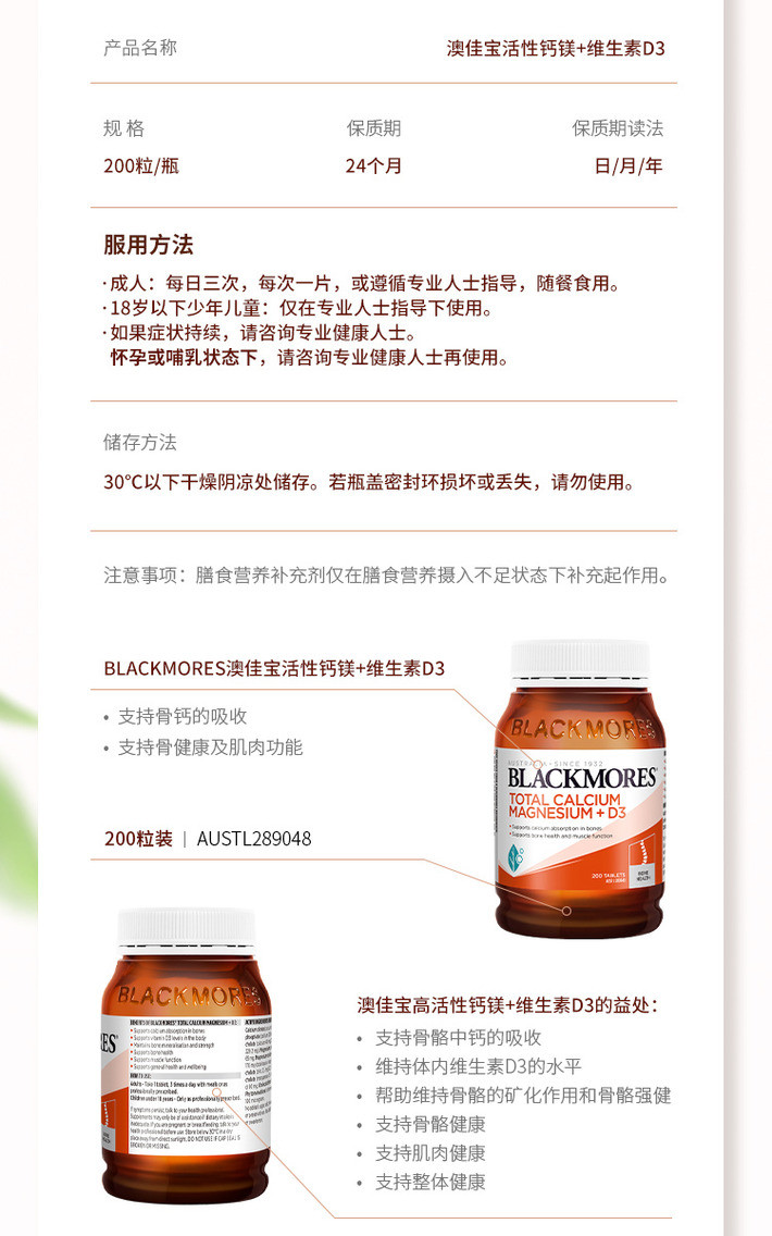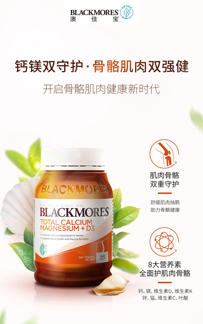 【保税区】澳洲澳佳宝Blackmores 活性钙镁片D3骨骼健康 200粒