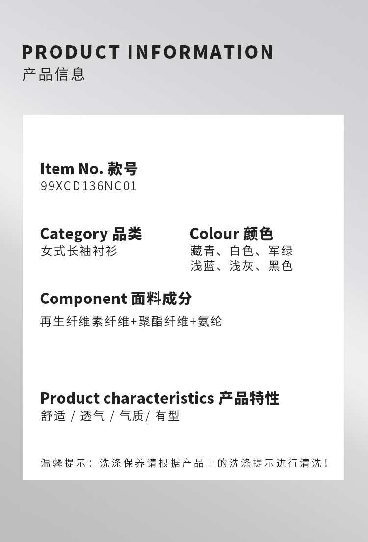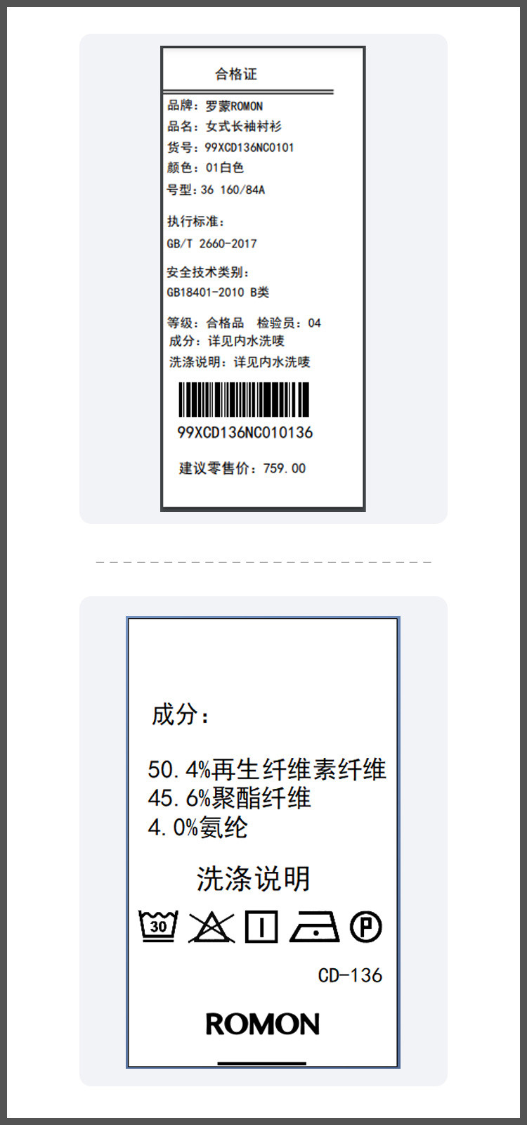 面料:50.4%再生纤维素纤维 45.6%聚酯纤维 4.0%氨纶