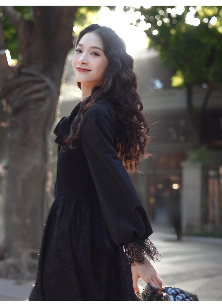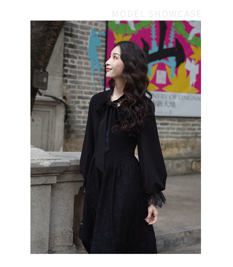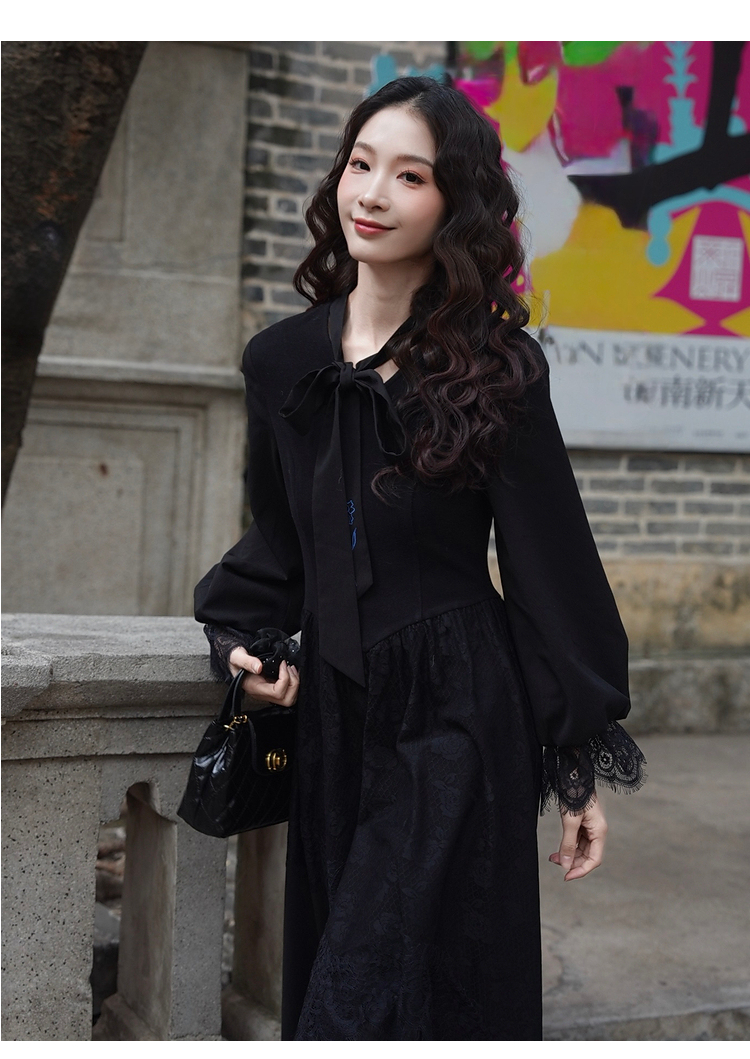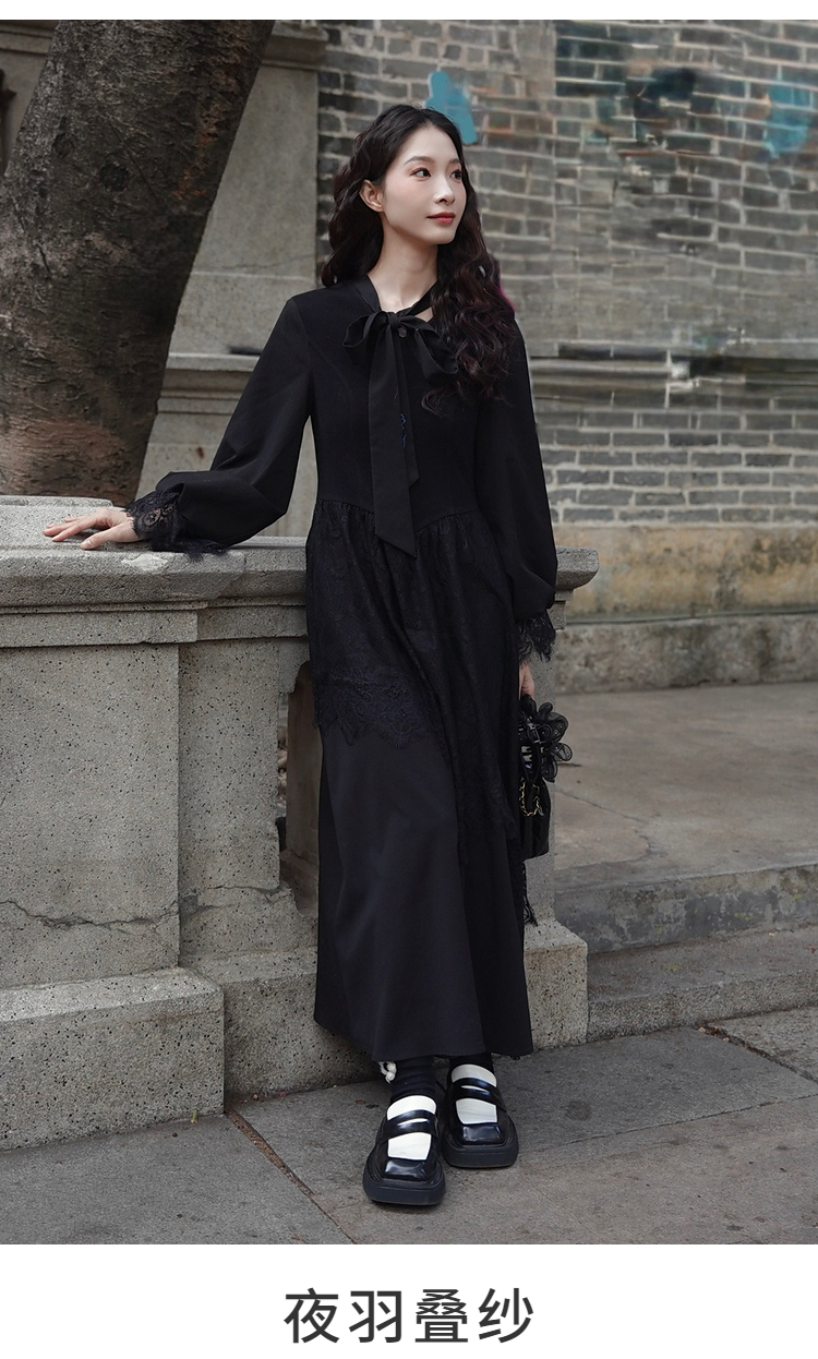两三事 夜羽叠纱梵高文艺春季新款绣花领带蕾丝拼接灯笼袖连衣裙