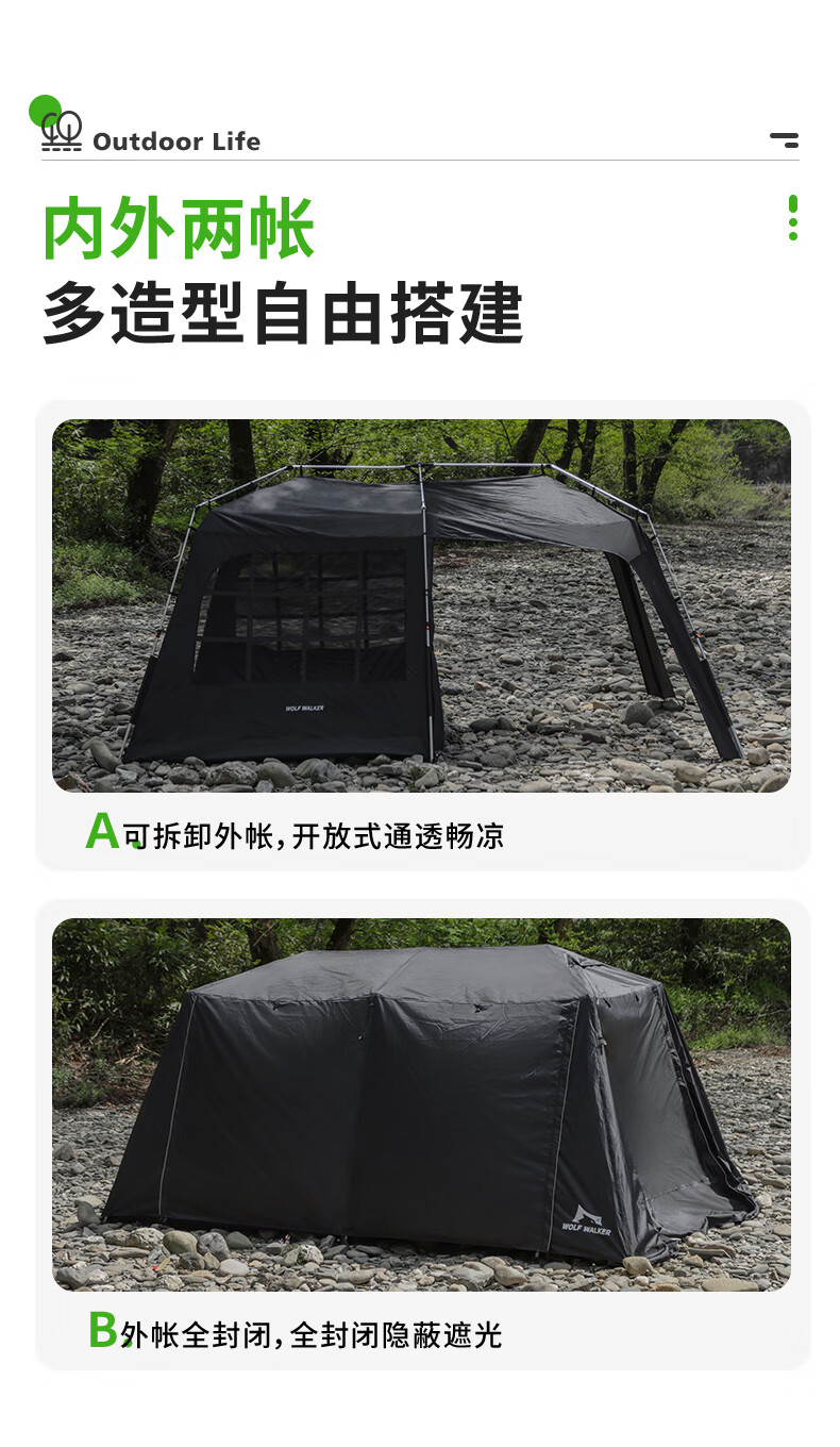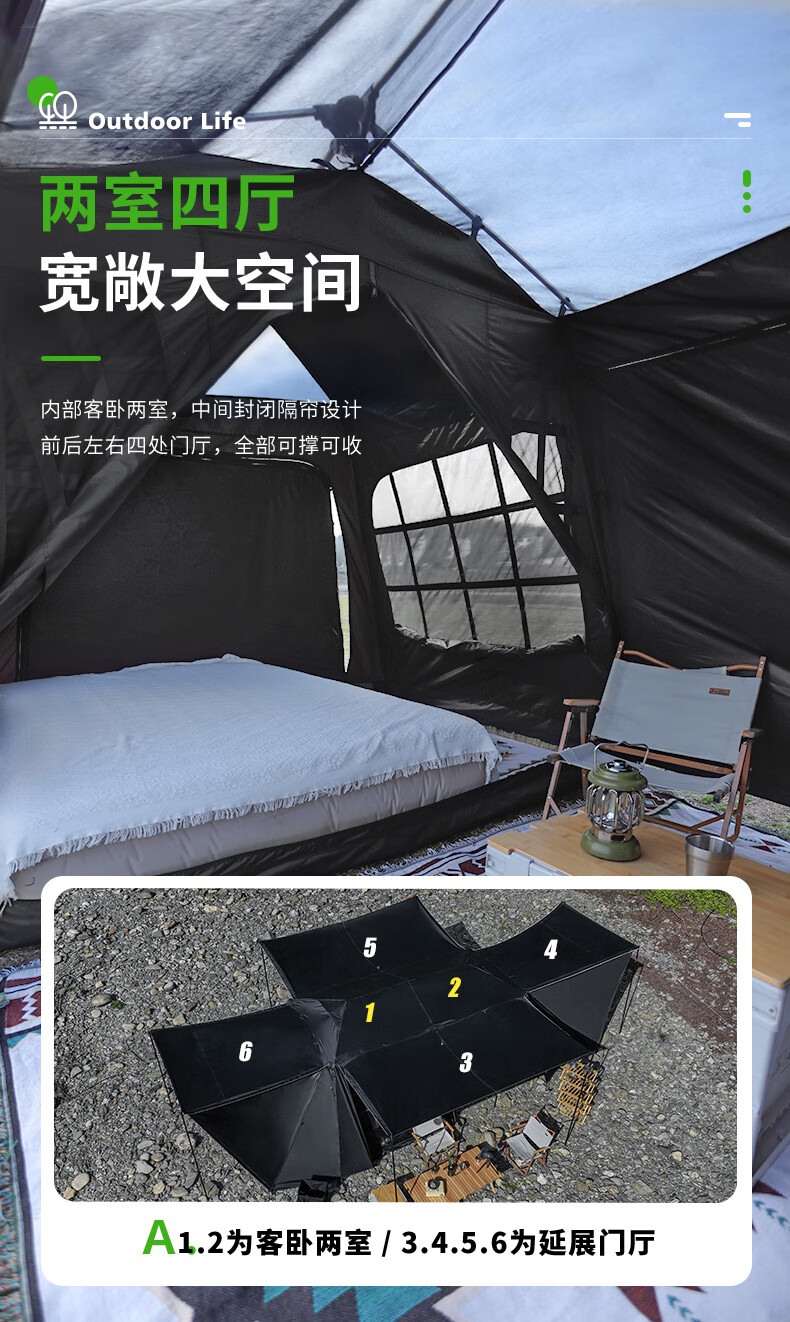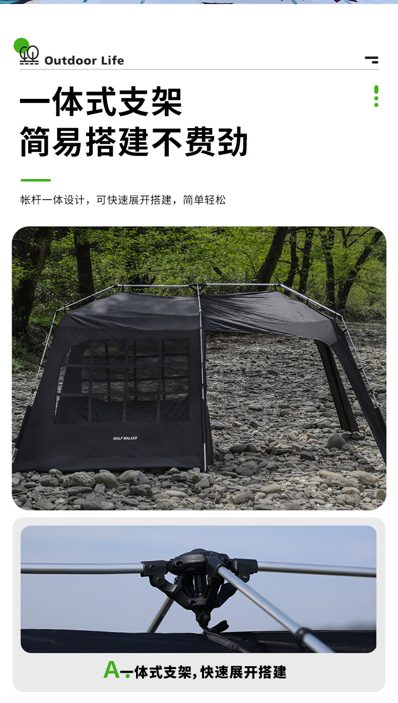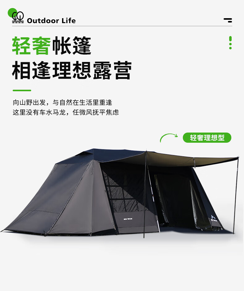 狼行者狼堡屋脊户外露营帐篷速开便携式折叠加厚野营装备全自动两室一厅 黑色