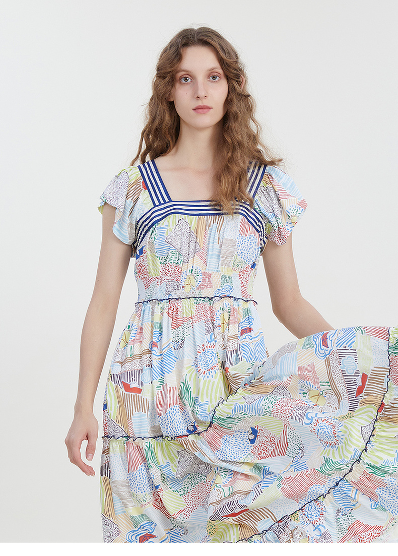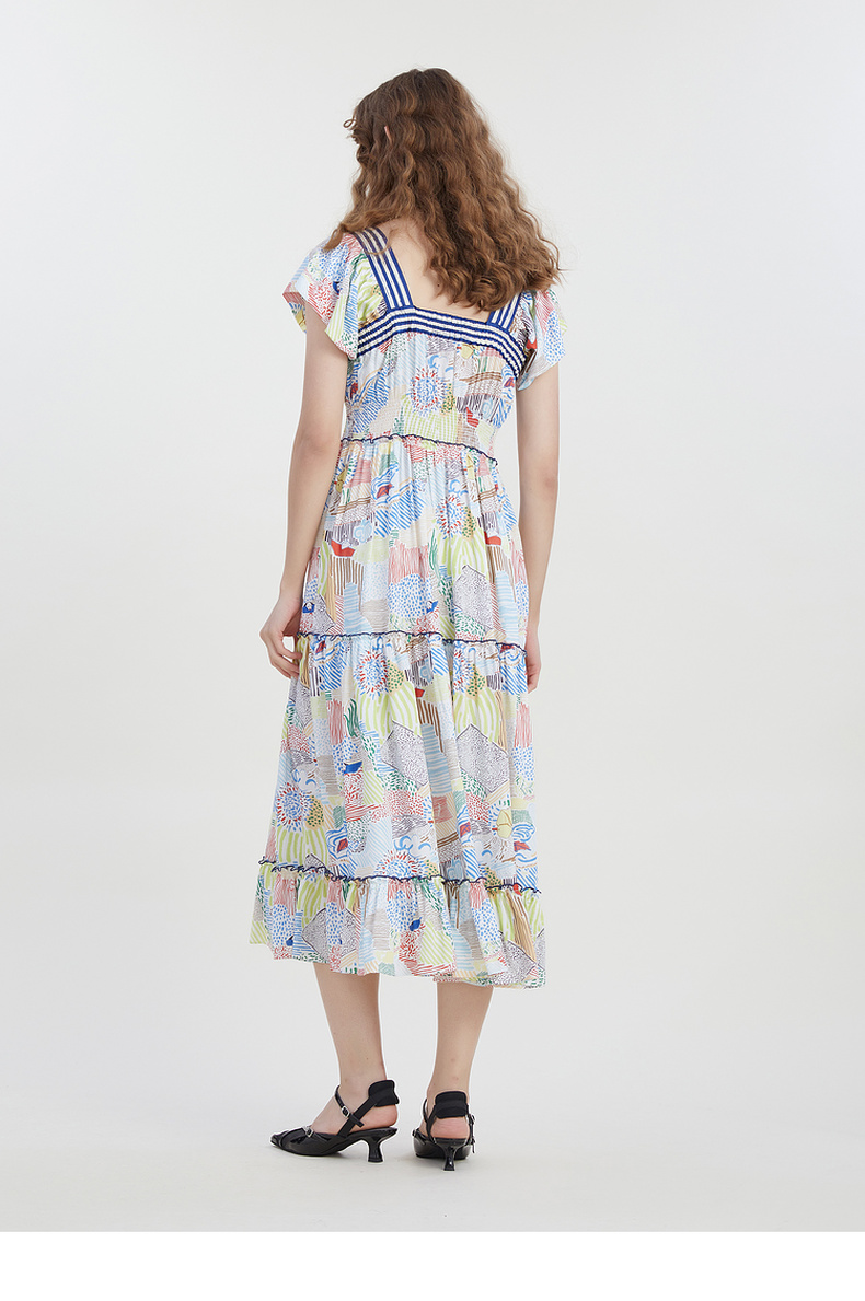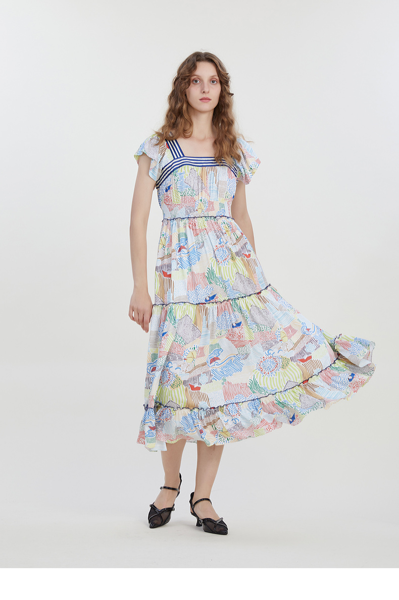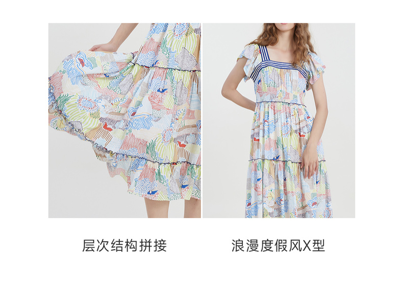 谜底复古花色连衣裙短袖2023夏季新款田园风飞飞袖长裙232ML0550