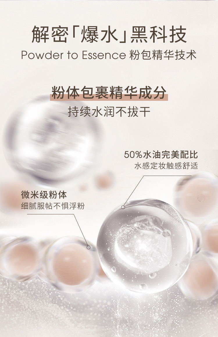 “爆水”黑科技+粉包精华技术,长效定妆,水光感很强