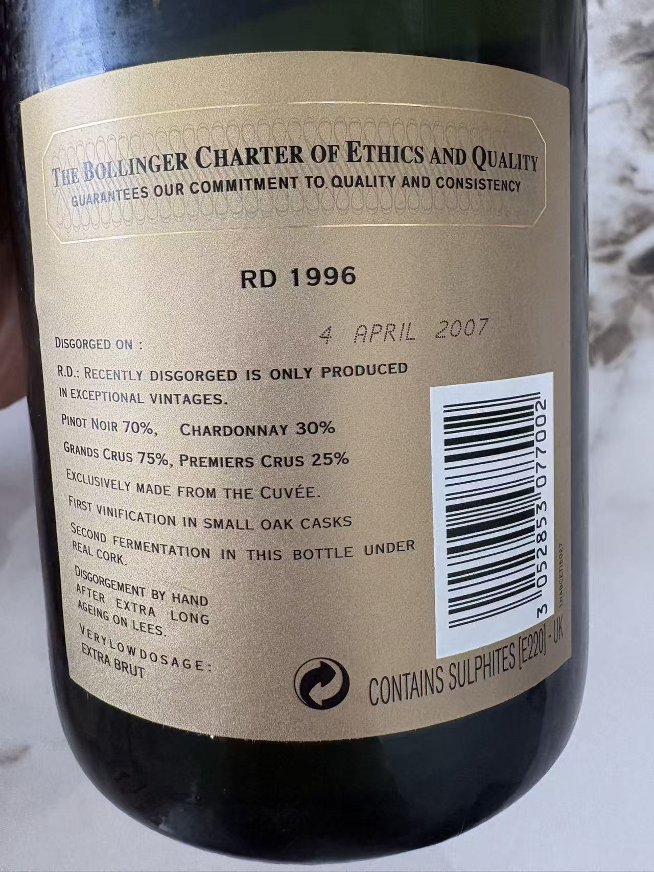 Bollinger R.D. Extra Brut 1996 Brut 堡林爵R.D.极干型香槟 1996(除渣年份2007)