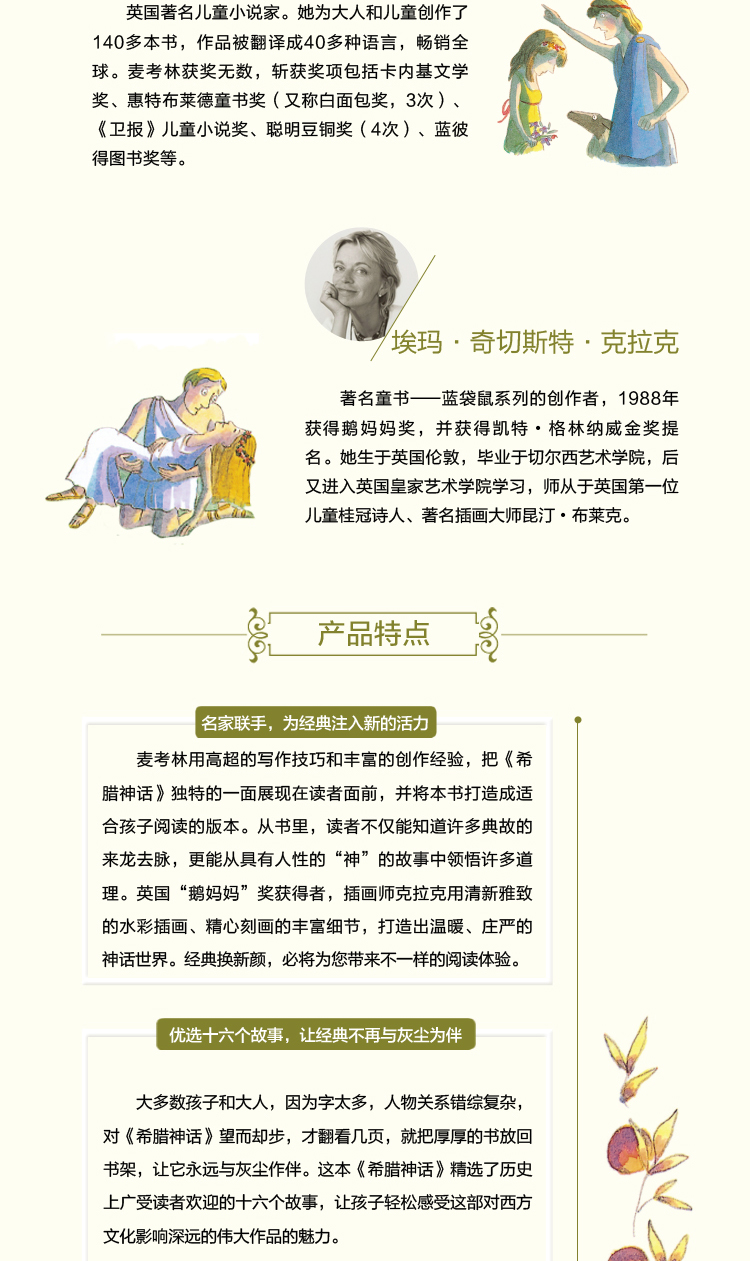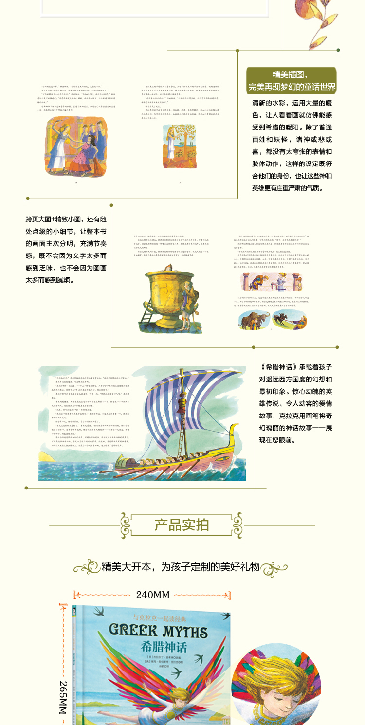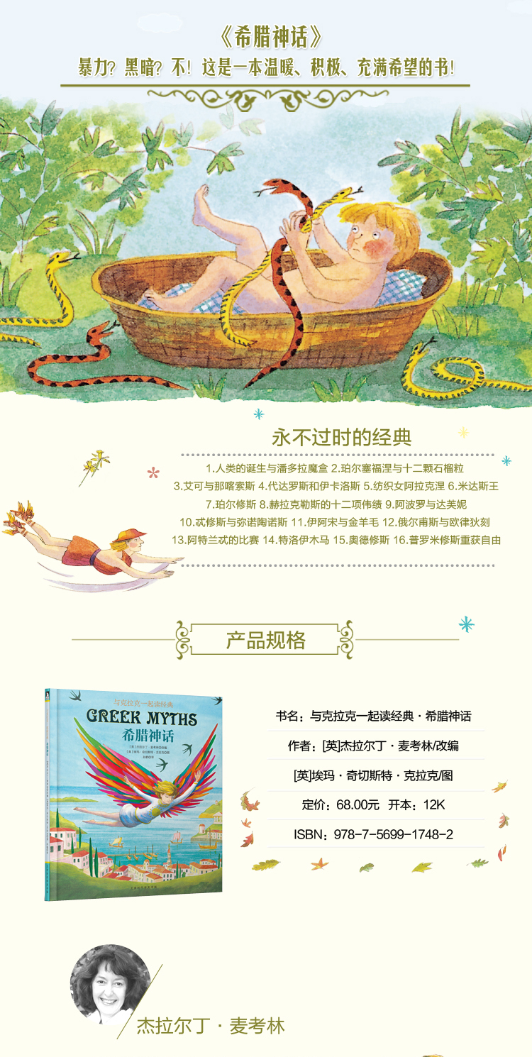 《希腊神话》收录了16个备受欢迎的希腊经典神话故事,包括《代达罗斯和伊卡洛斯》《伊阿宋与金羊毛》《特洛伊木马》等。故事简明扼要,对一些繁复的情节进行了适当删减,适合6-12岁的儿童阅读。作者对故事娓娓道来的叙述,配上色彩明快的插图,使小读者们爱不释手。
