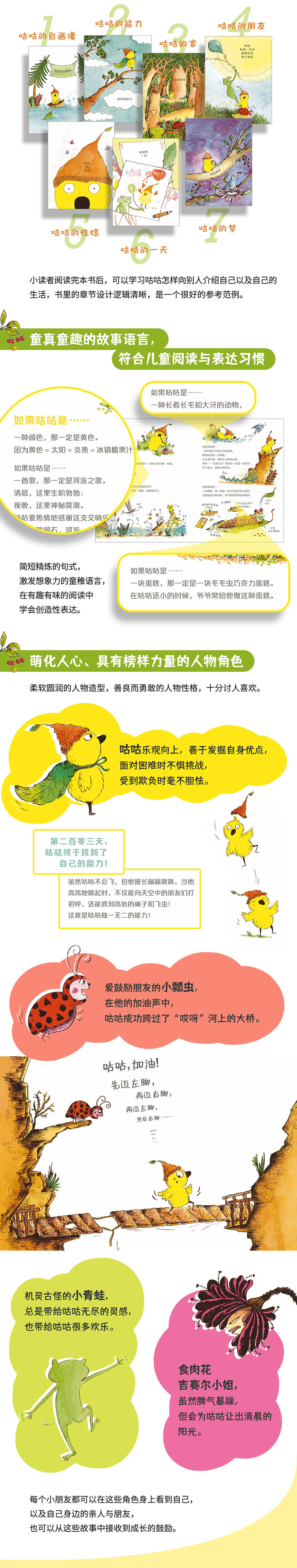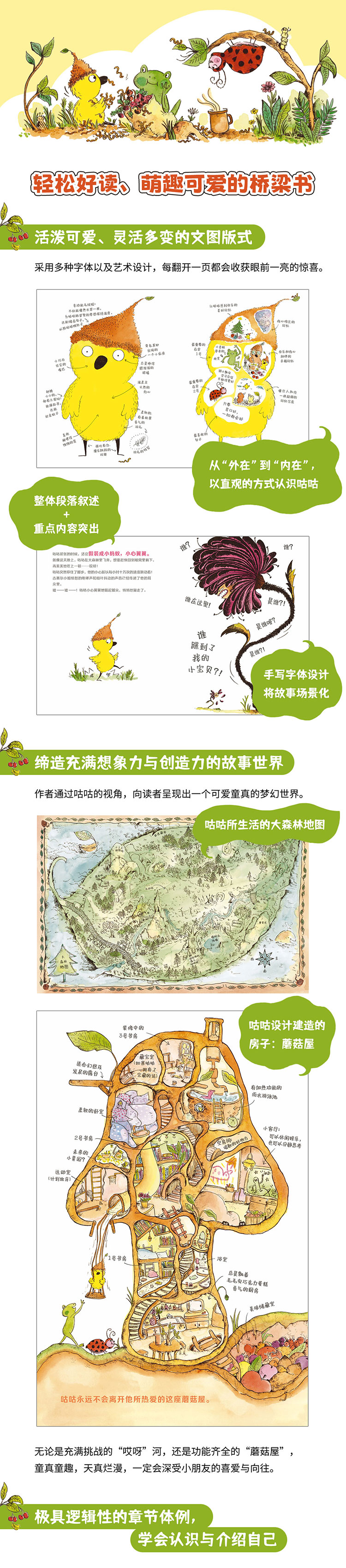 作者为小朋友缔造出一个儿童版“桃花源”,以咕咕的视角,向读者呈现出一个天真可爱的小小世界!本书分为7个章节,图文