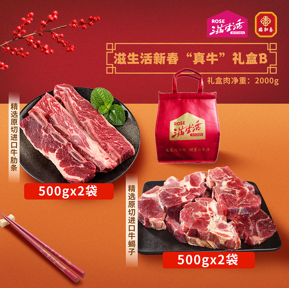 【直送到家】2000g滋生活新春“真牛”礼盒B 百分百原切好肉、O添加、0腌制 搭配精美礼袋 冷链到家