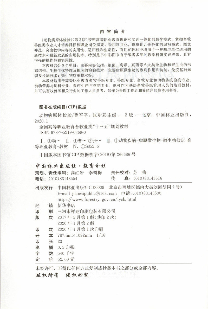 动物病原体检验 第2版 曹军平 张步彩 主编 0369 全国高等职业教育畜牧业类十三五规划教材 中国林业出版社