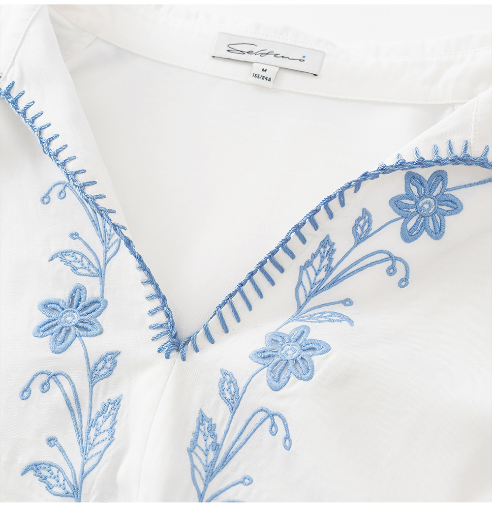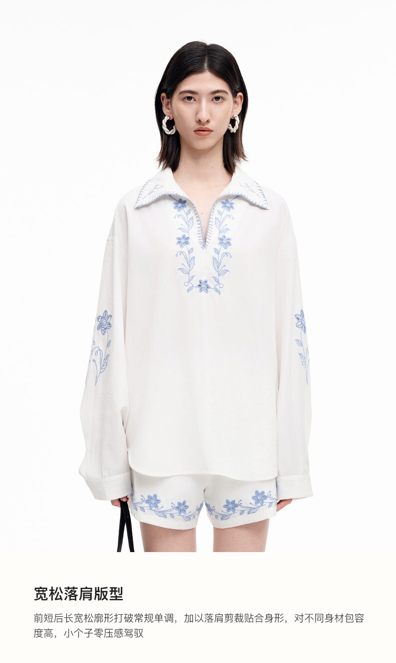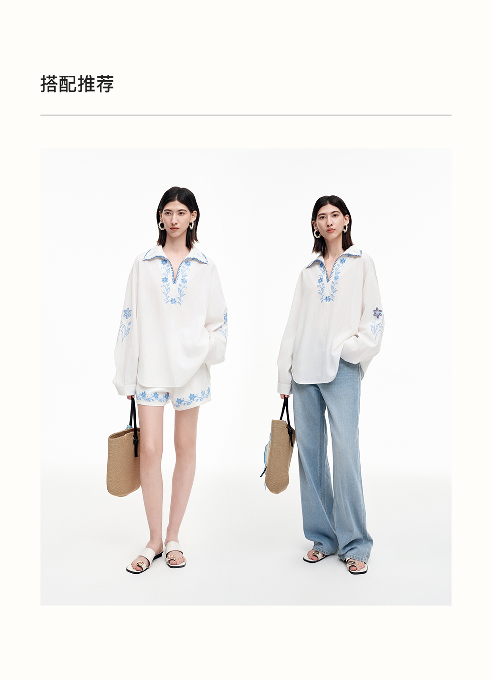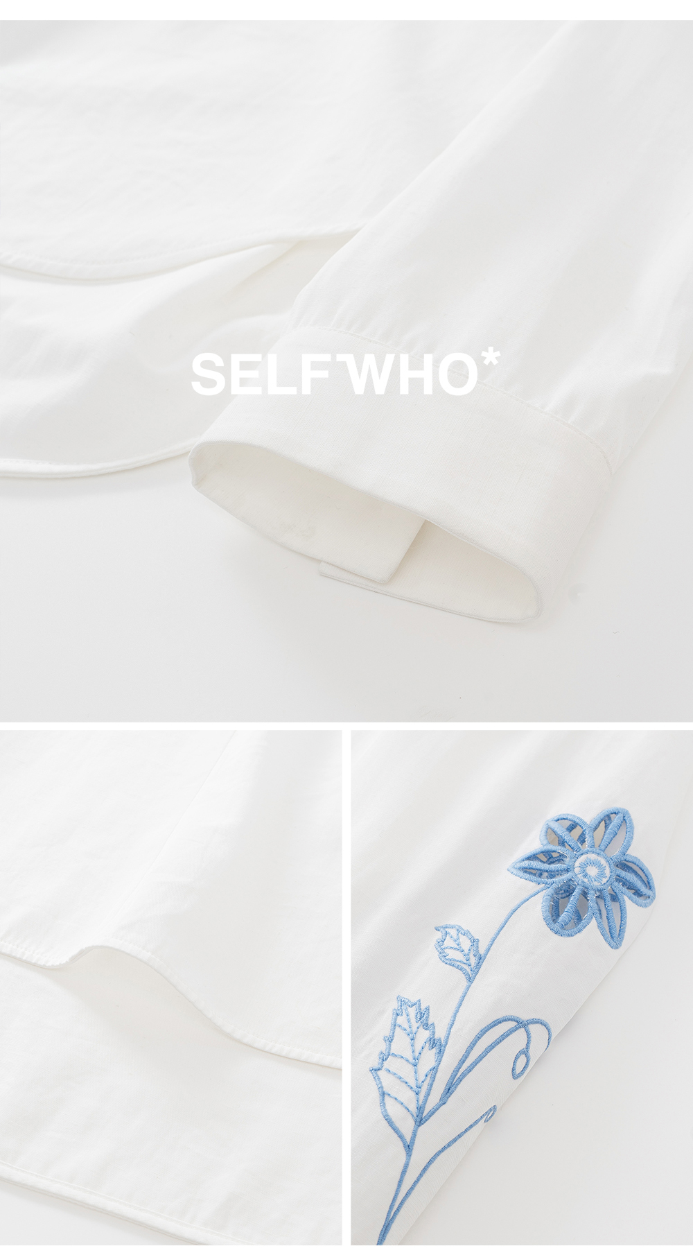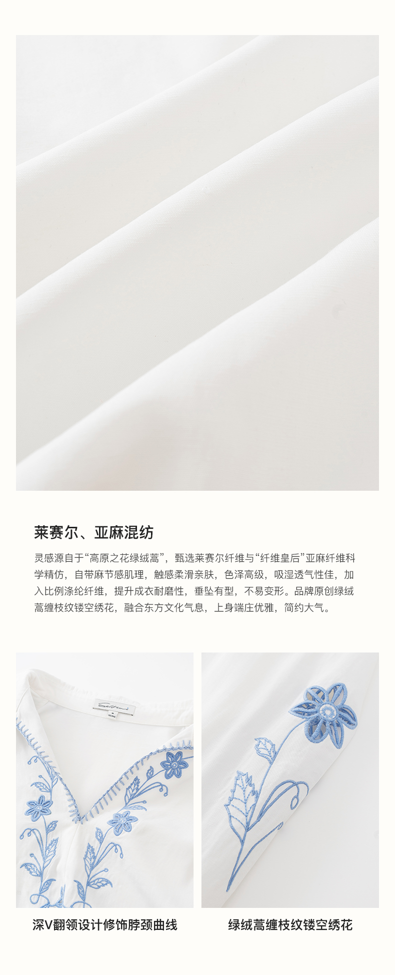 SELFWHO天丝亚麻混纺绿绒蒿镂空绣花衬衫2025秋季新款宽松V领上衣