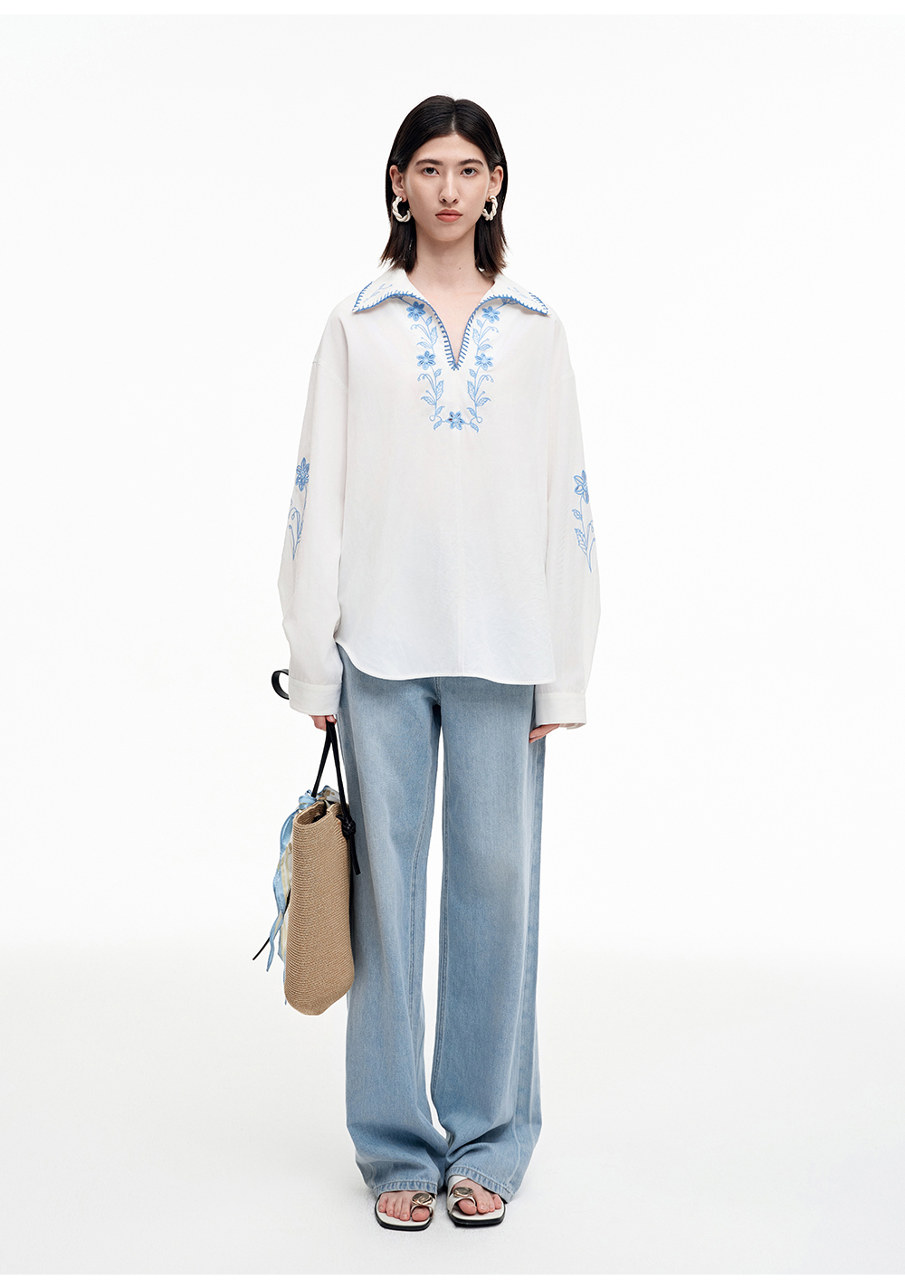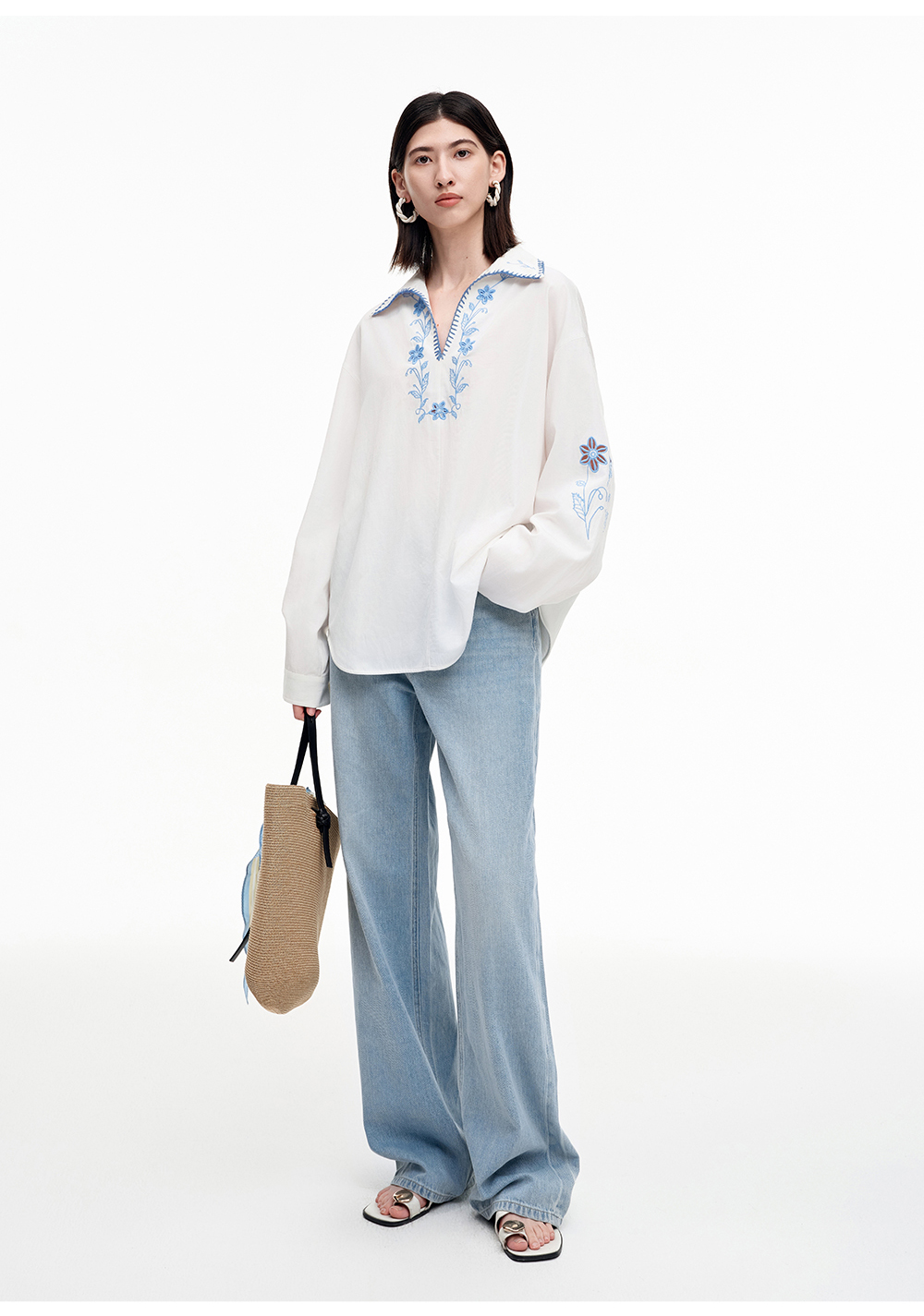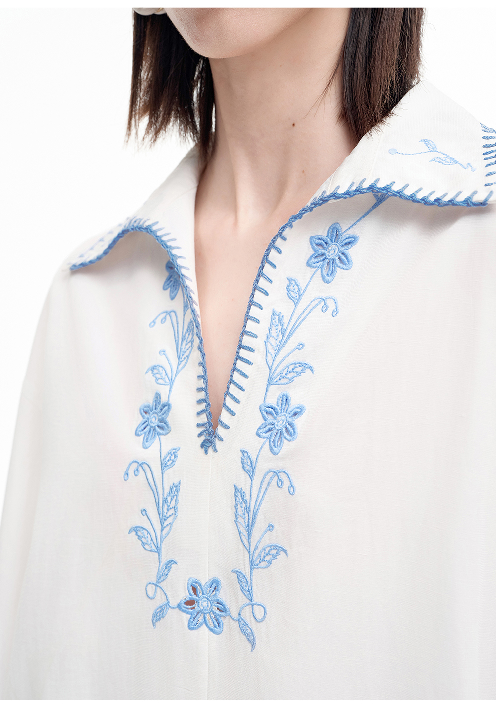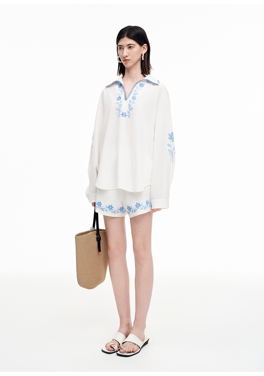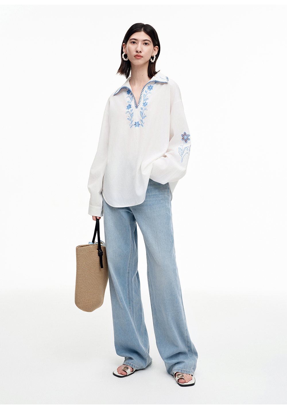 SELFWHO天丝亚麻混纺绿绒蒿镂空绣花衬衫2025秋季新款宽松V领上衣