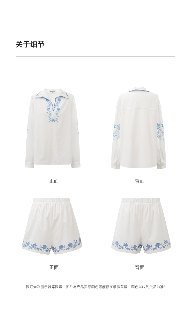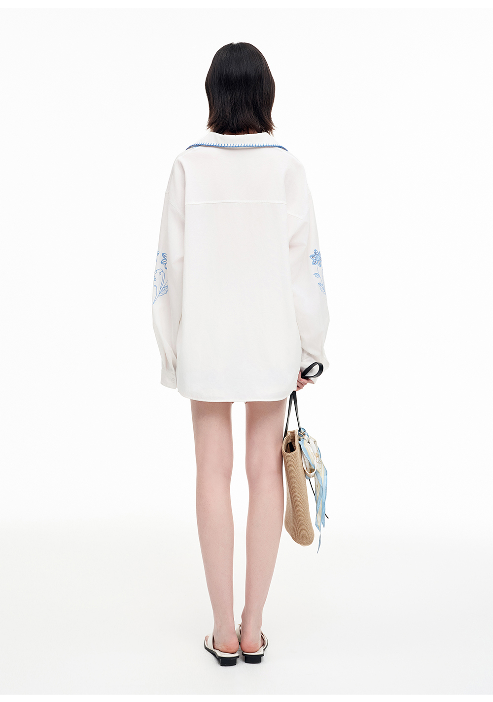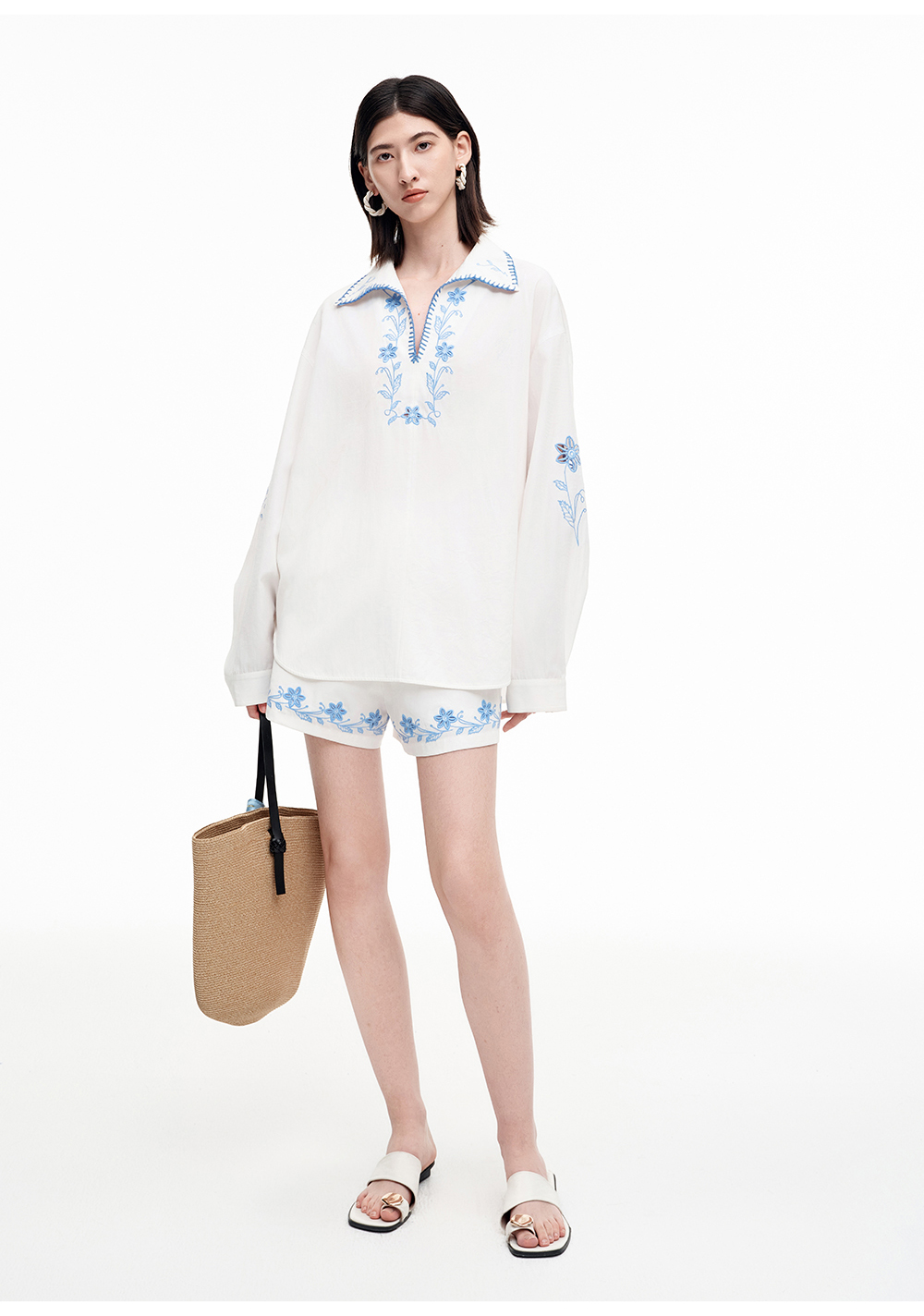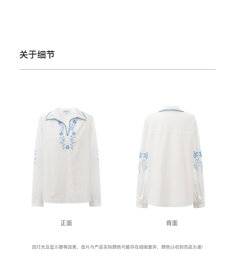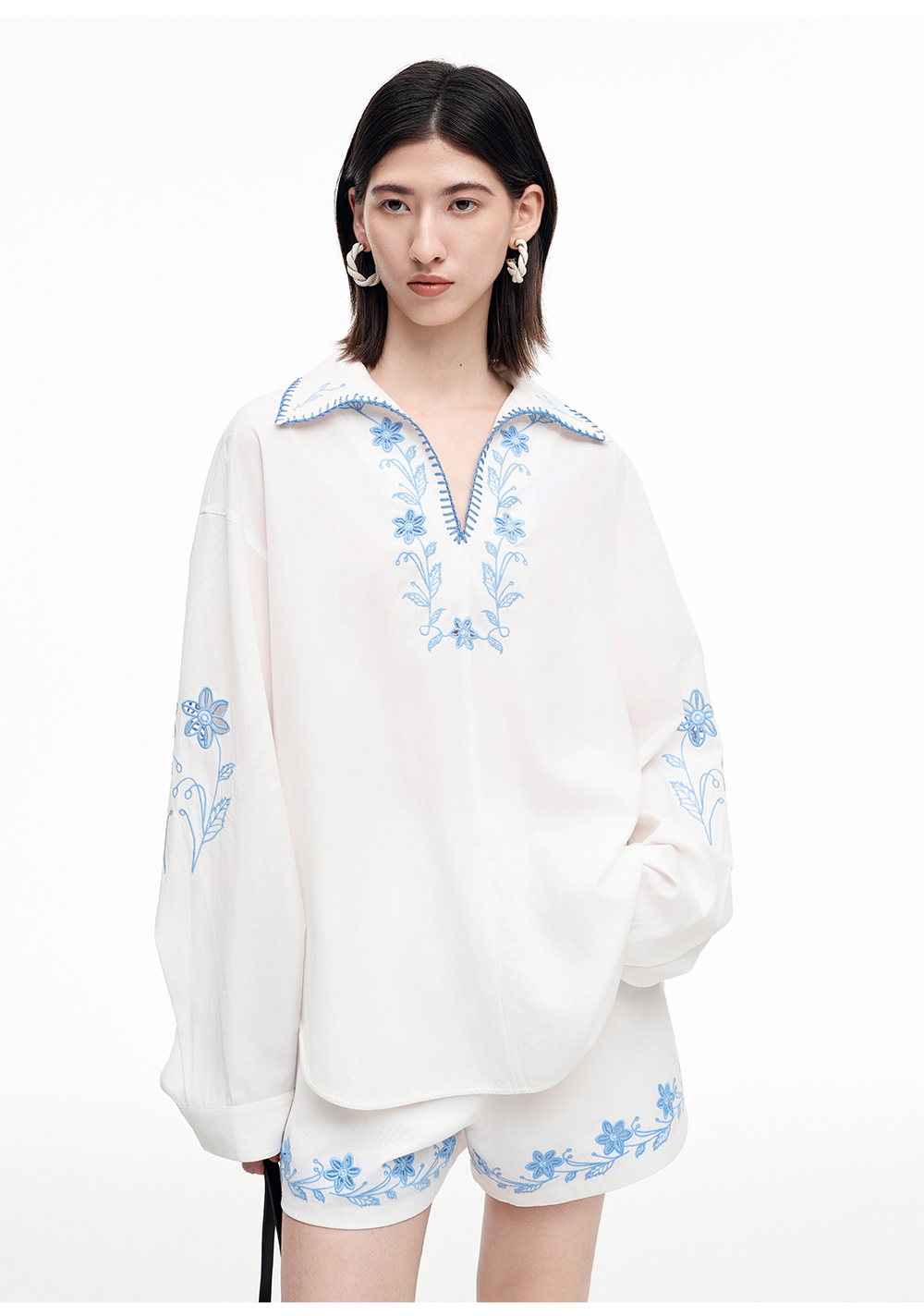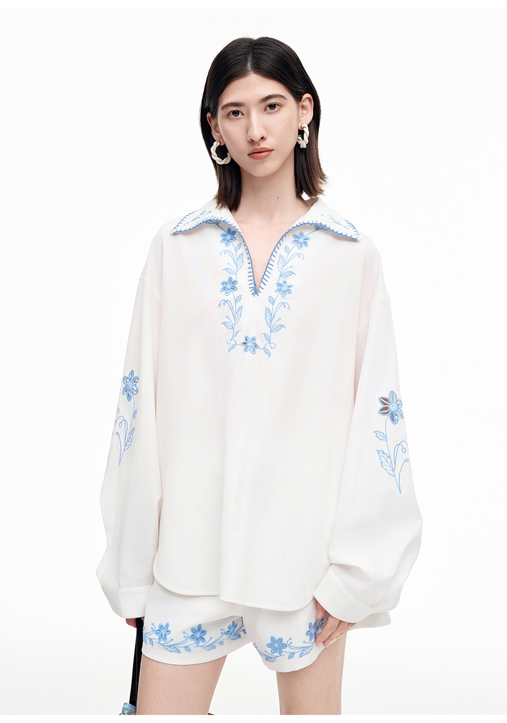SELFWHO天丝亚麻混纺绿绒蒿镂空绣花衬衫2025秋季新款宽松V领上衣