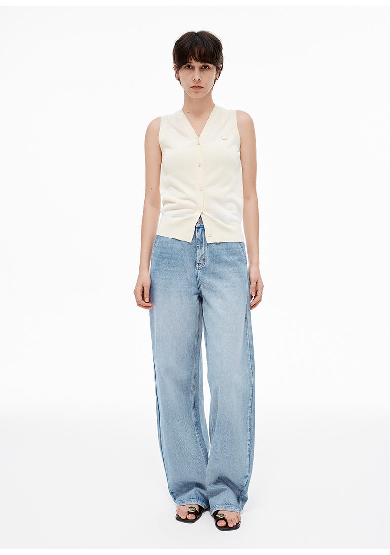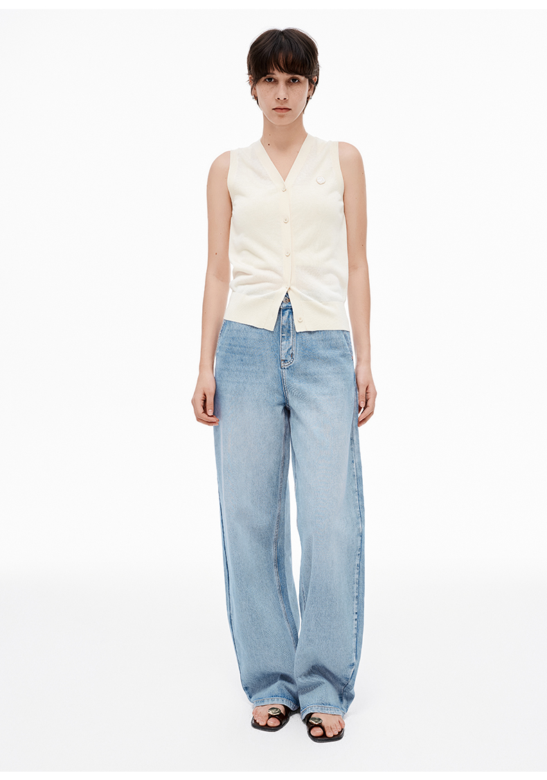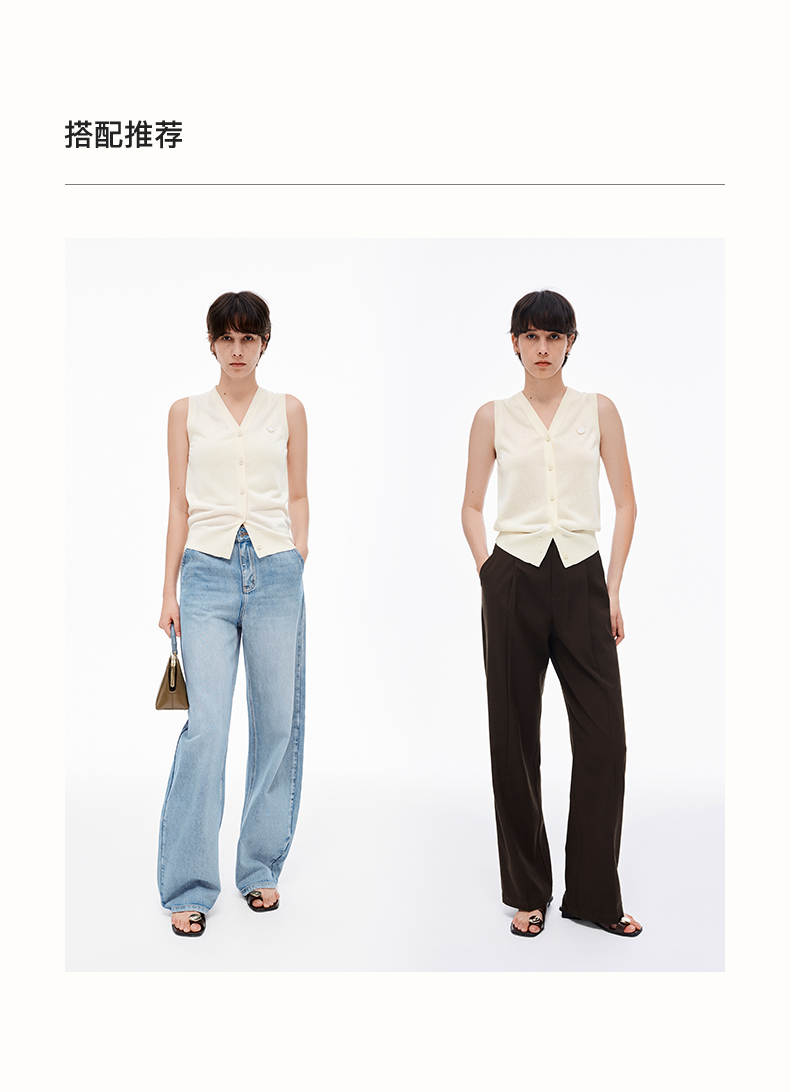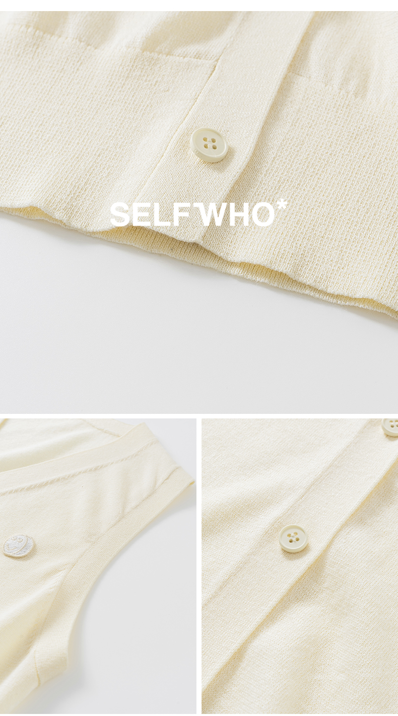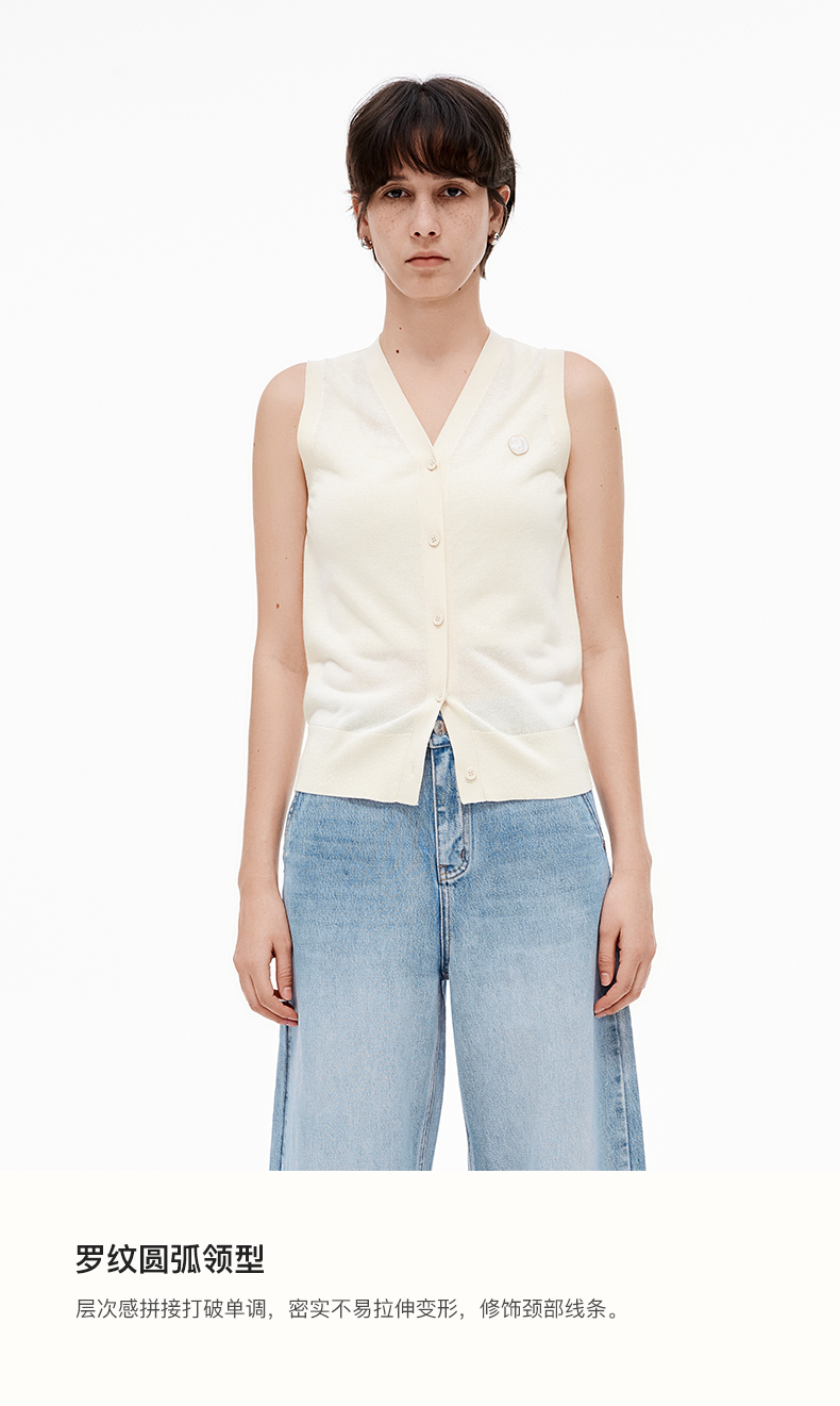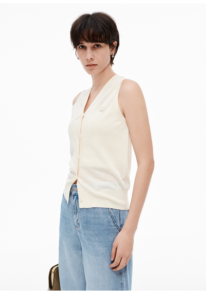 SELFWHO亚麻混纺米黄色针织背心马甲女2025夏新款宽松v领无袖马夹