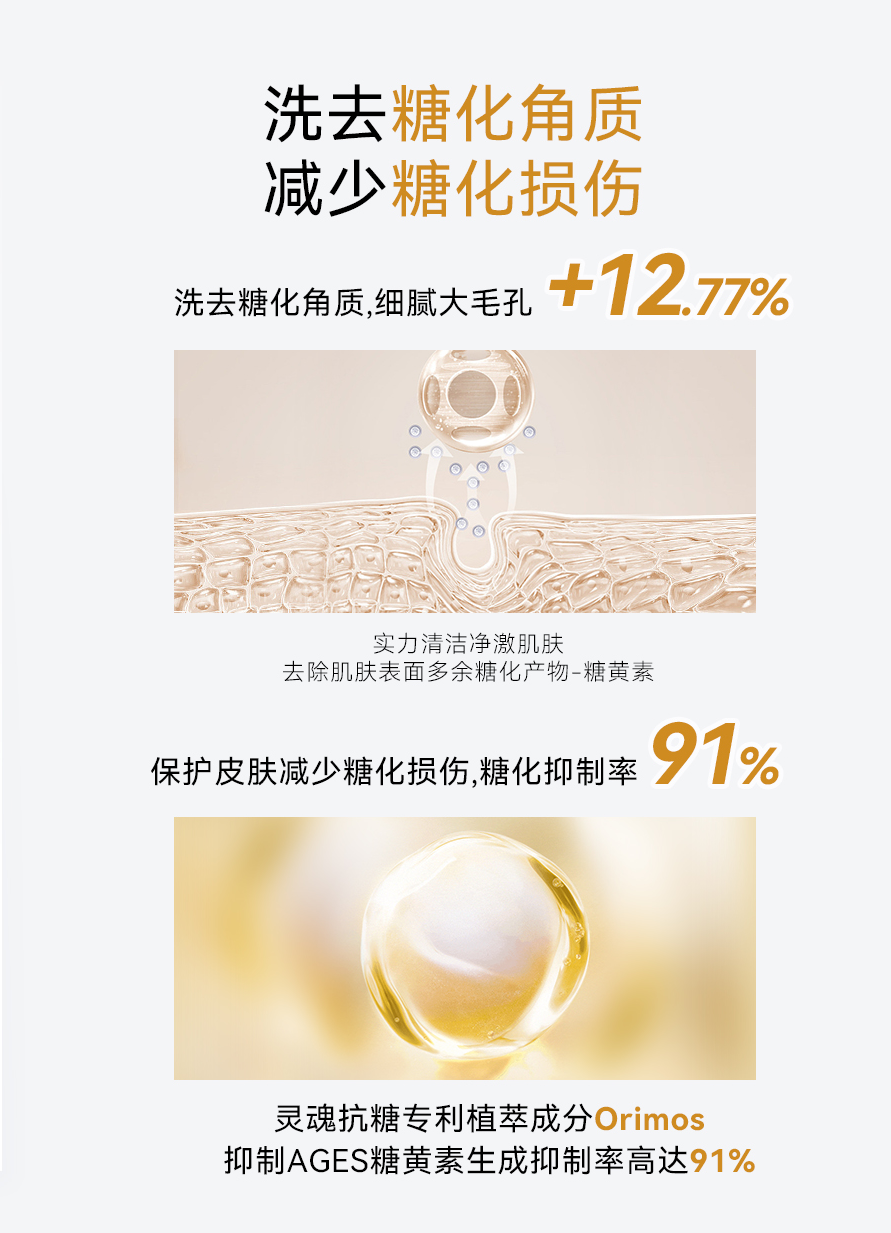 👍抗糖大佬做洁面!融入独家专利Orimos!实现了从洁净开始抗糖!洗去糖化角质,细腻大毛孔!