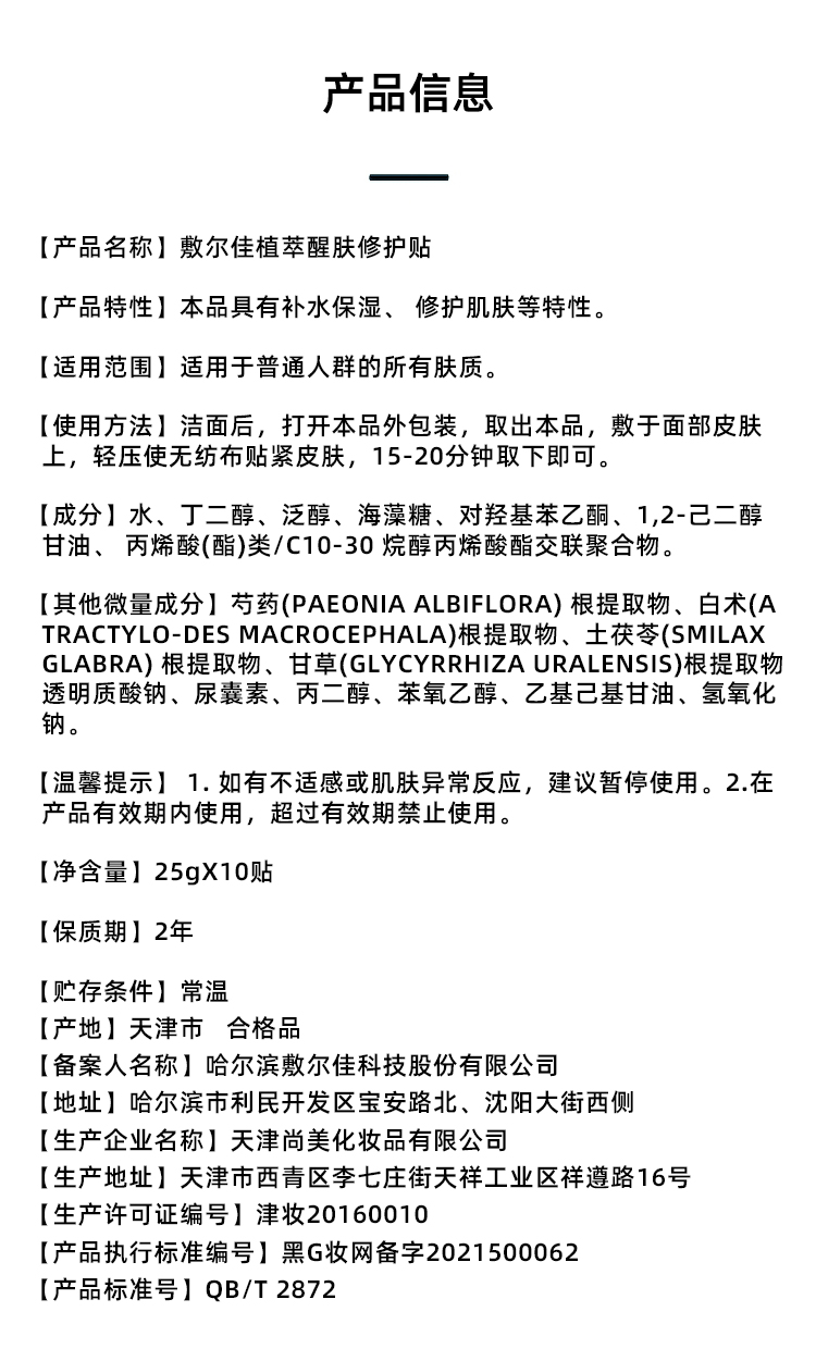 敷尔佳 植萃醒肤修护贴 25g*10贴/盒 补水保湿 心选到家