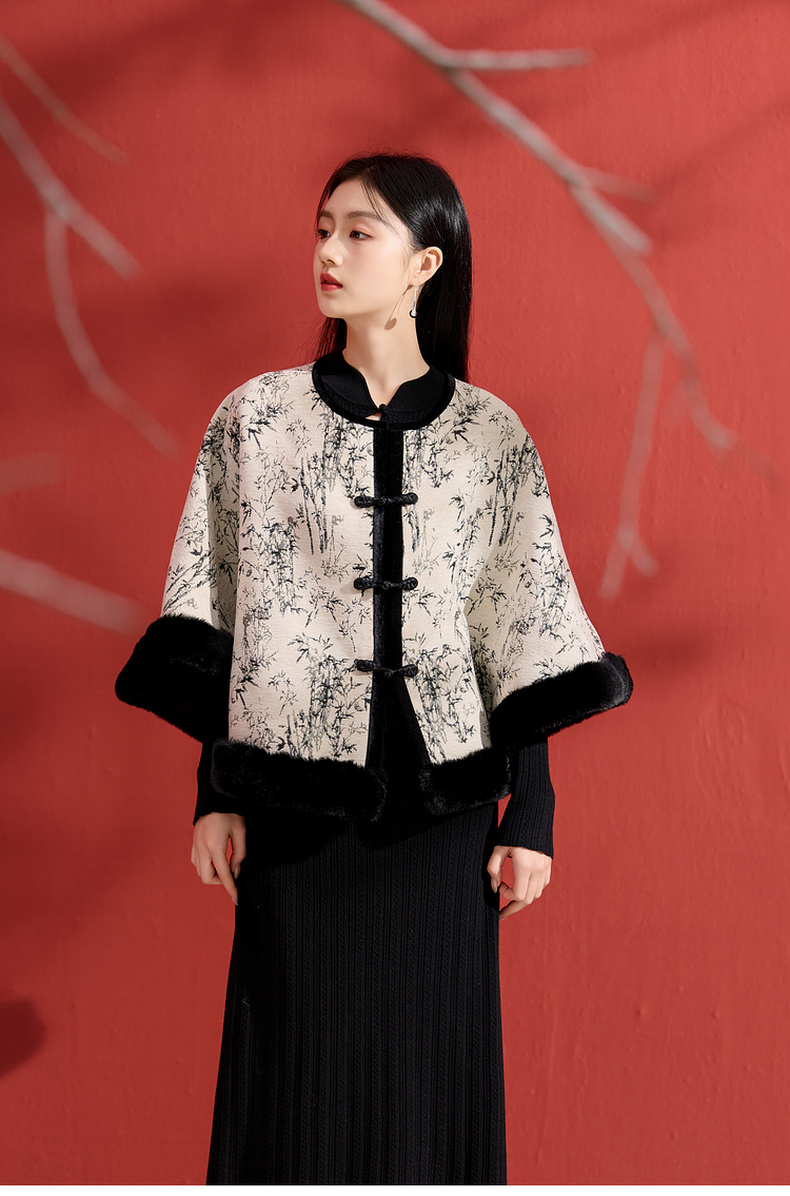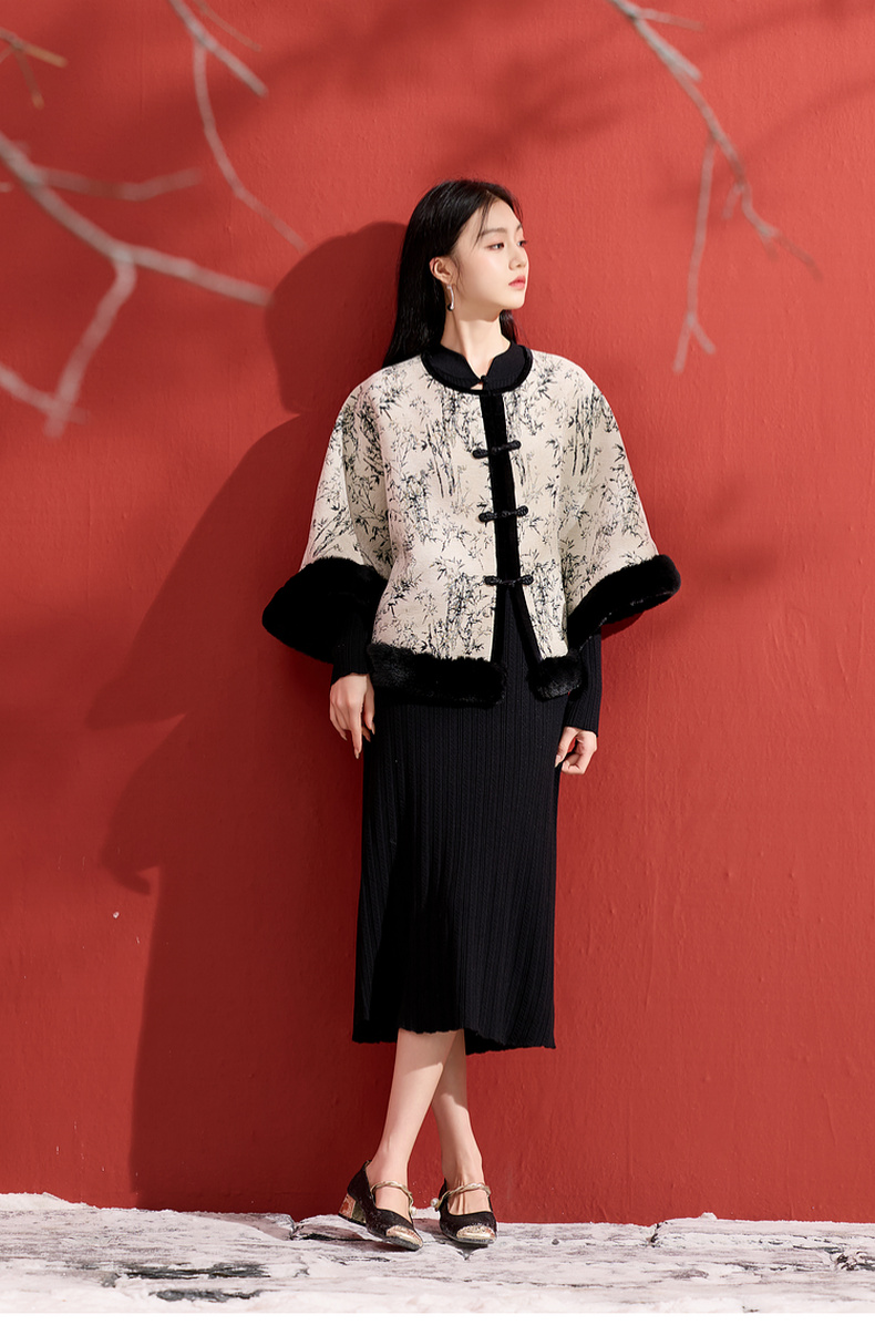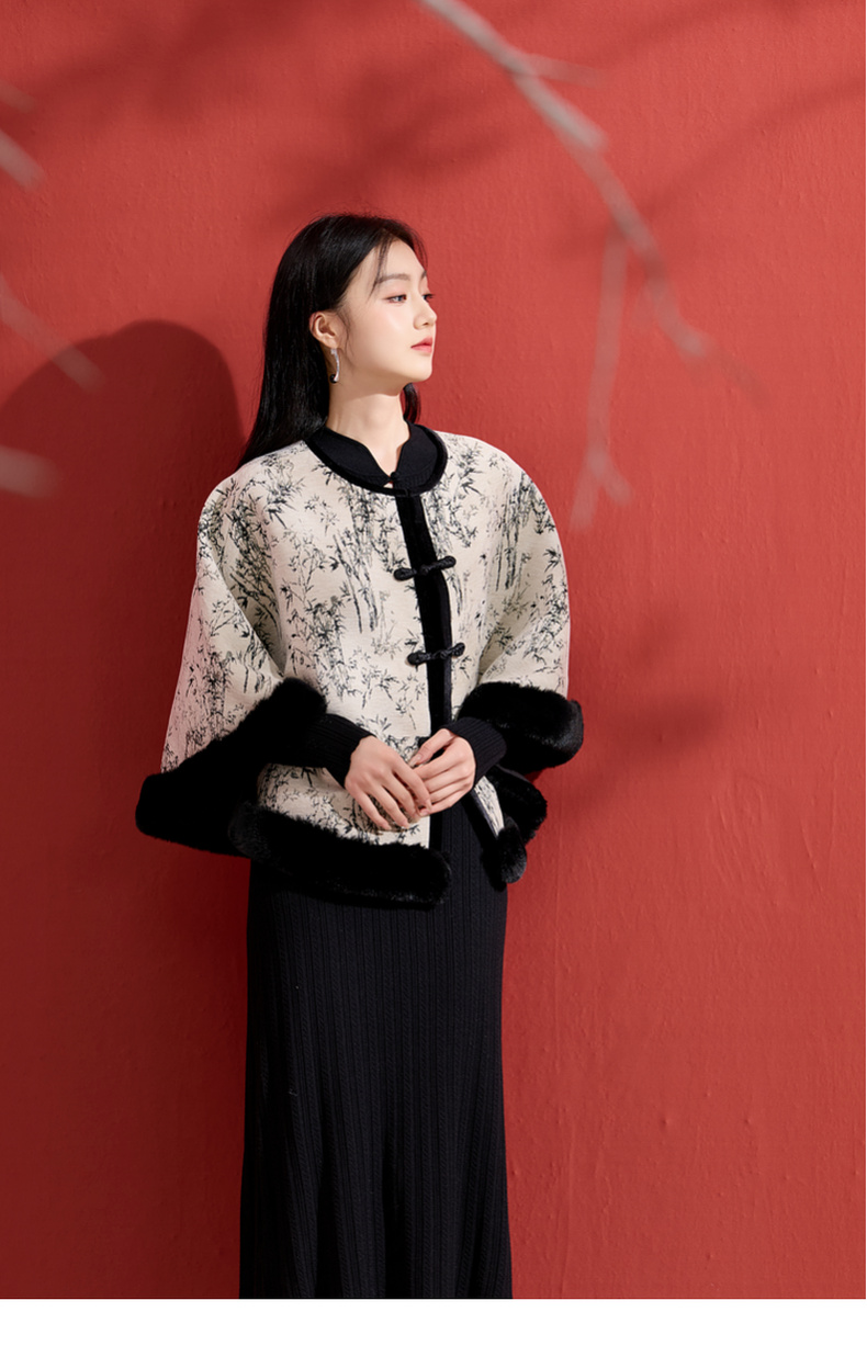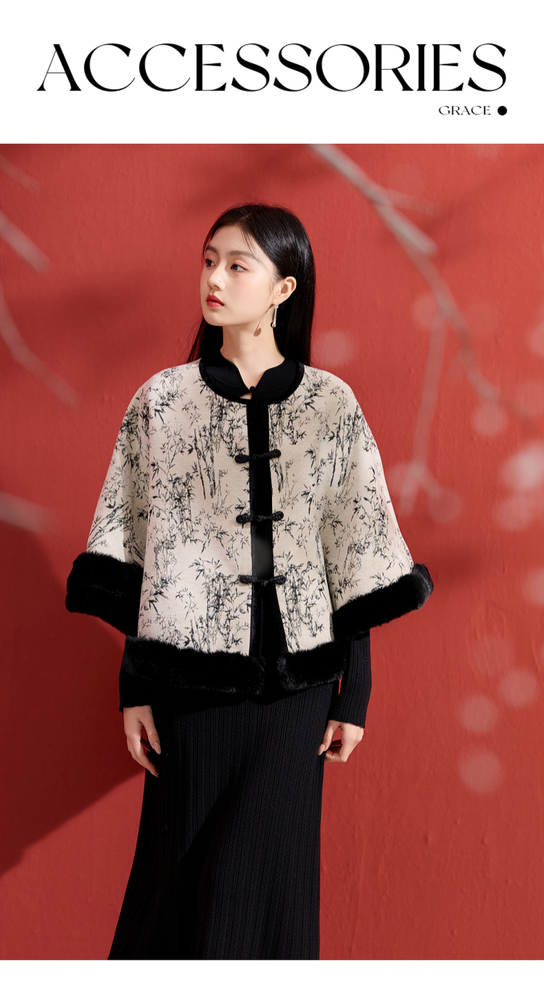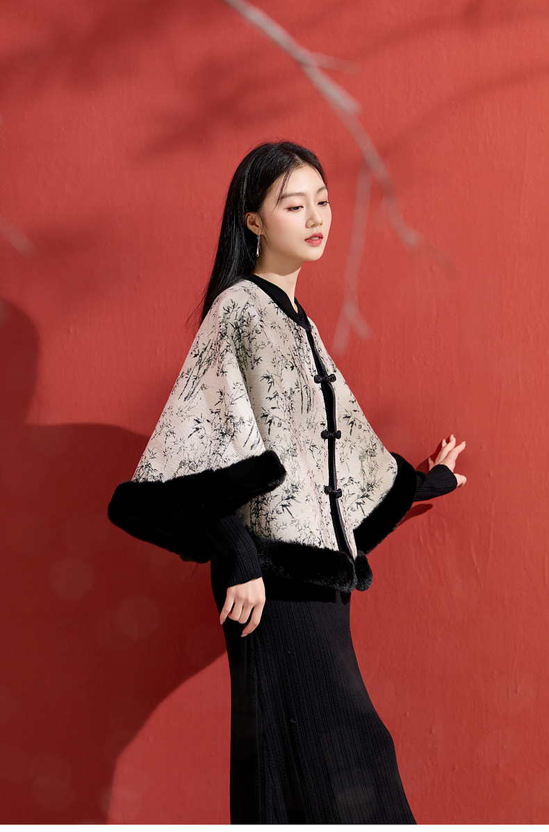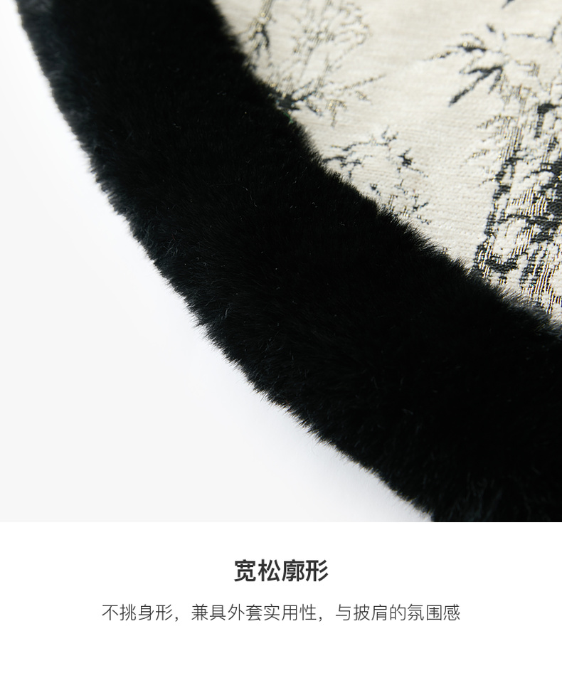 三彩2025新款国风复古外搭水墨竹纹披肩保暖女氛围感盘扣毛绒边