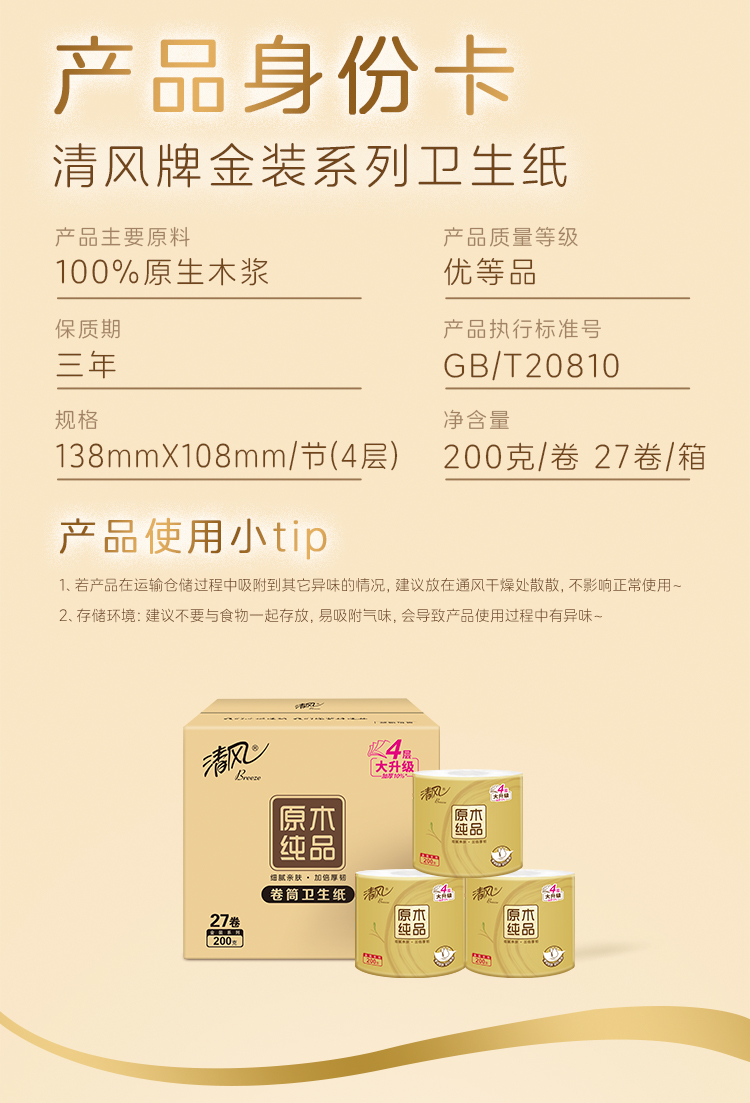 【官方自营】清风金装卷筒纸4层200克27卷