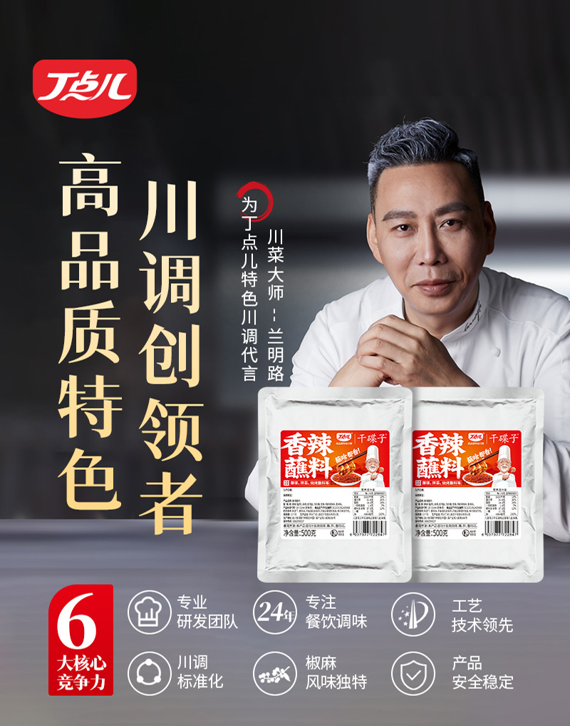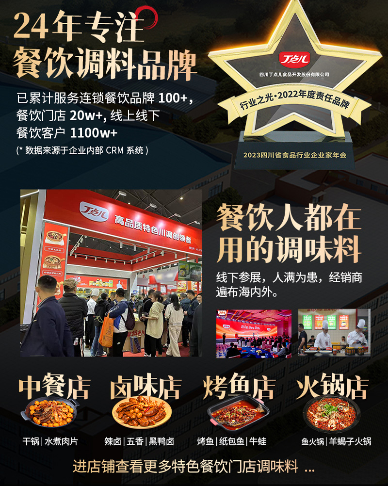 四川丁点儿食品开发股份有限公司,是集川菜调味料研发、生产、销售、服务为一体的现代化企业,专注为餐饮客户提供川菜调味解决方案。公司成立至今,服务了超百万家的餐饮门店以及连锁品牌。