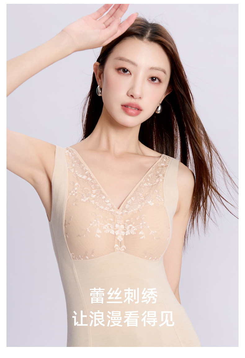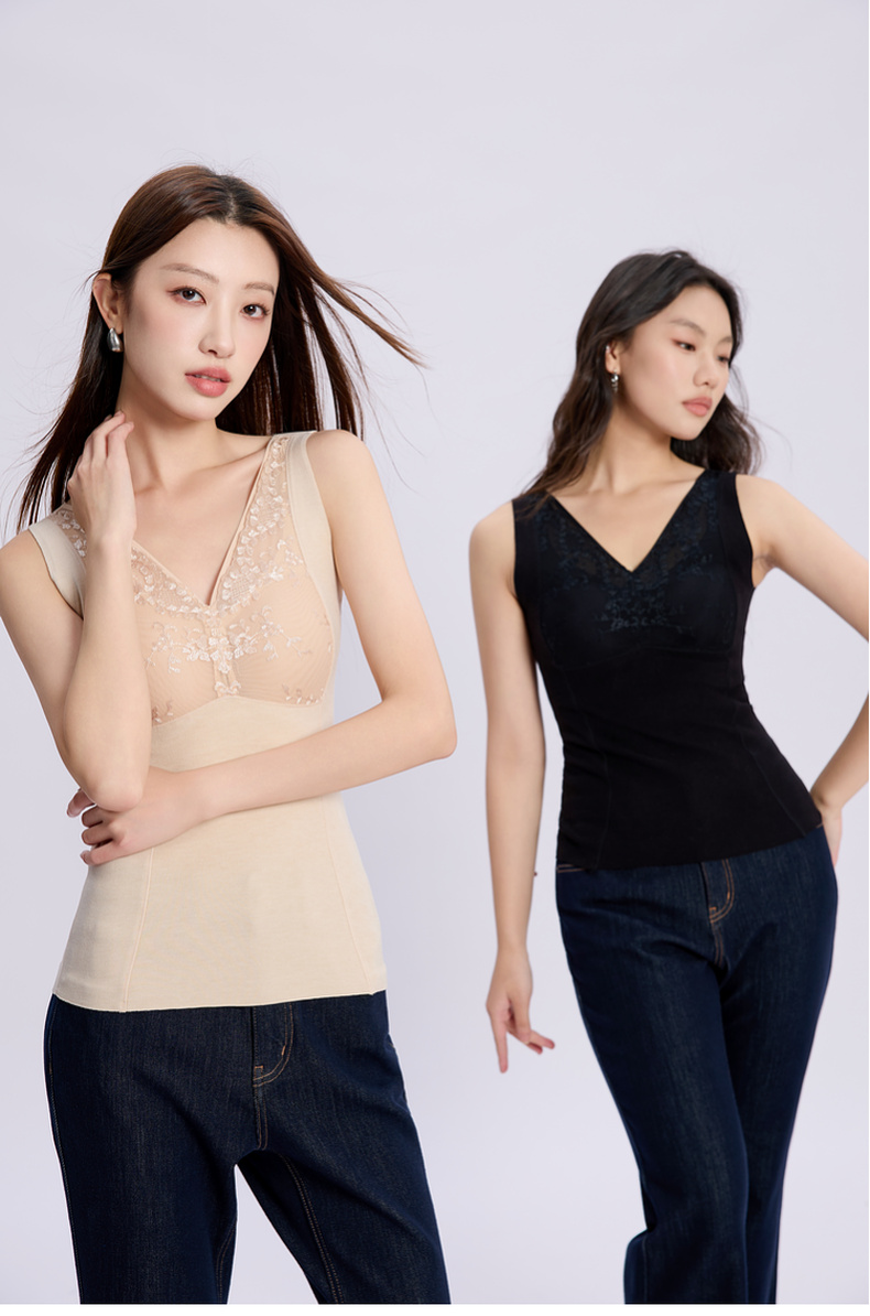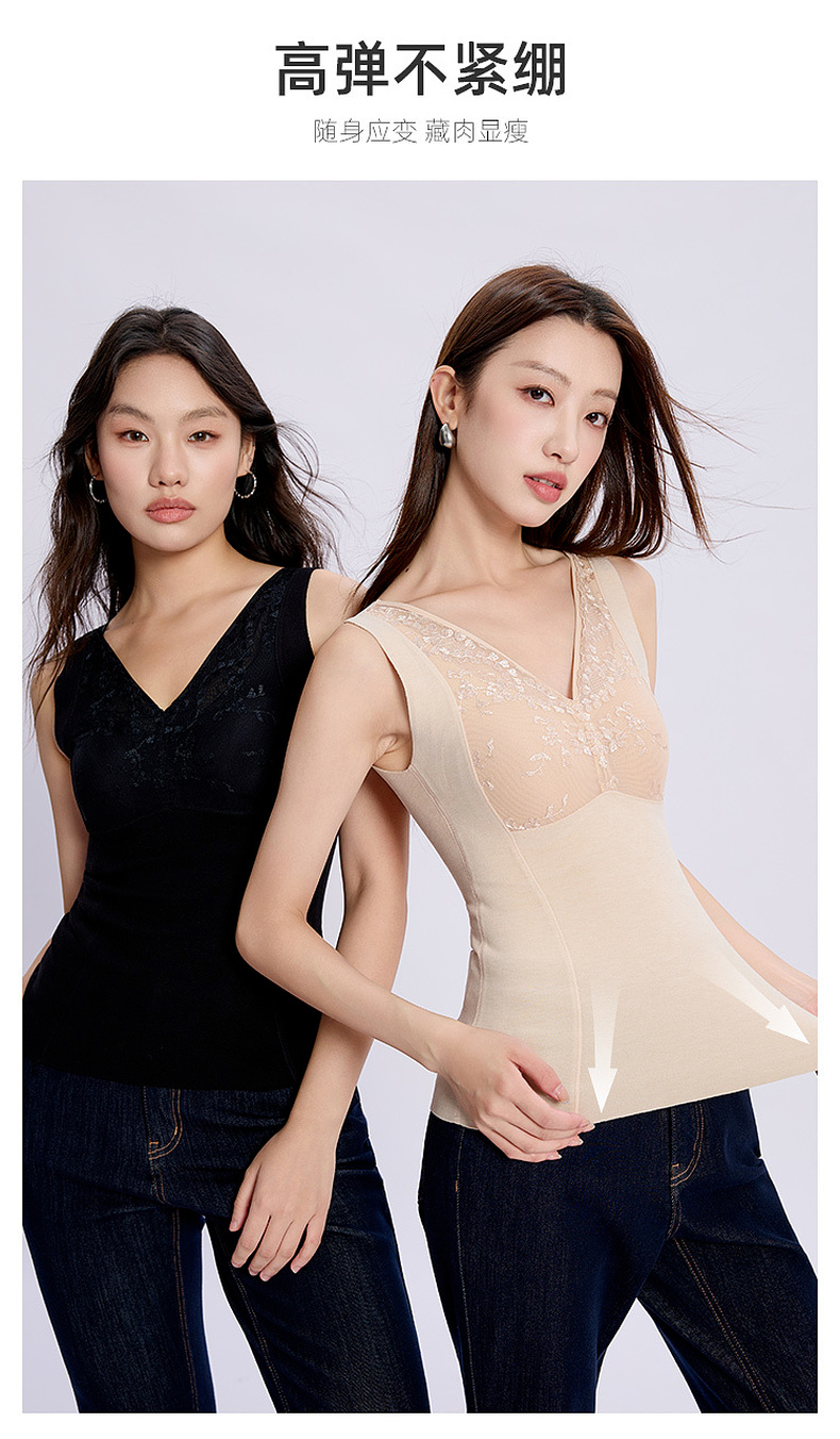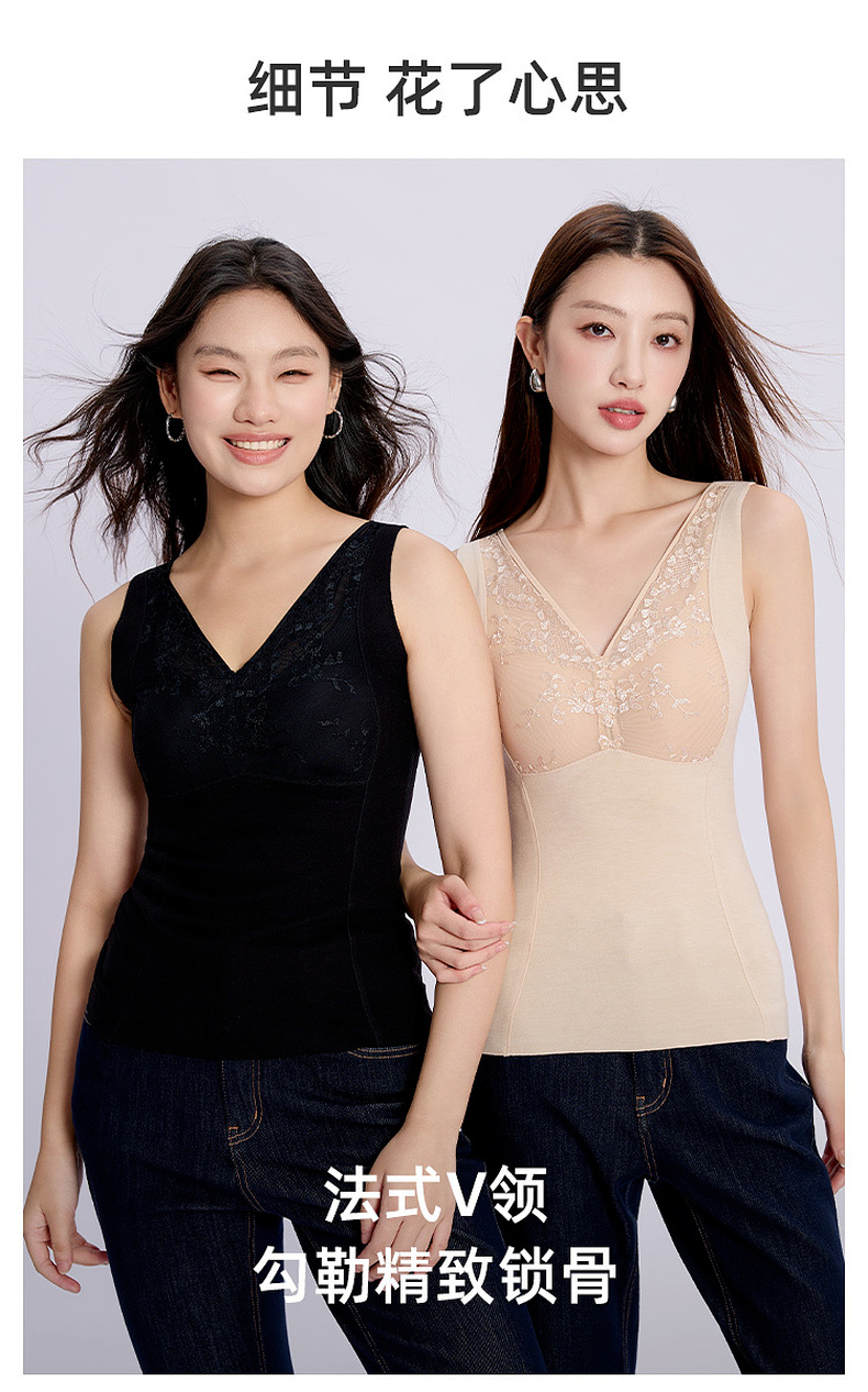 三彩2025新款蕾丝刺绣V领打底带胸垫带杯无痕背心收副乳修身女