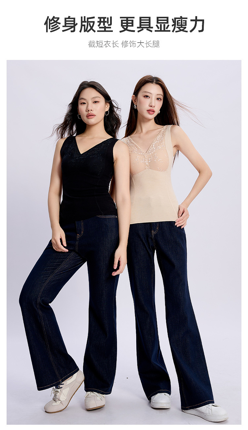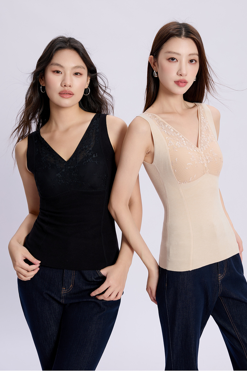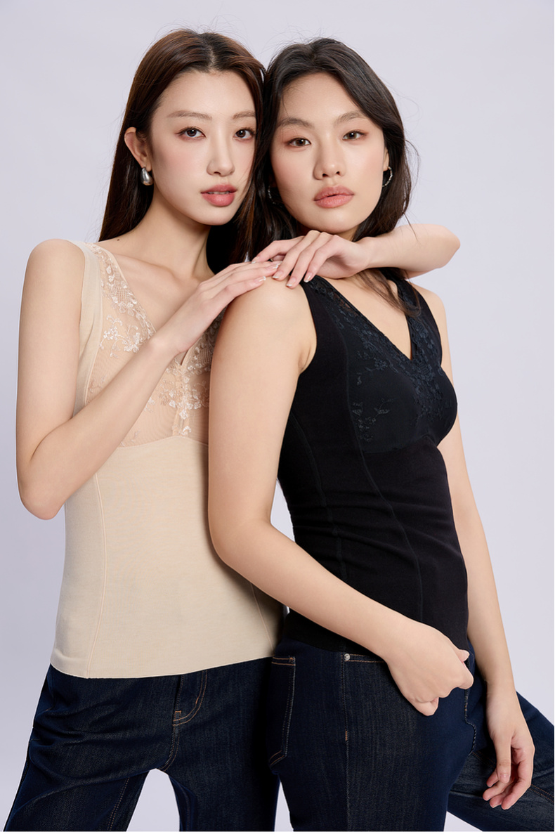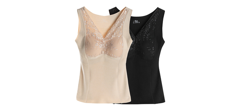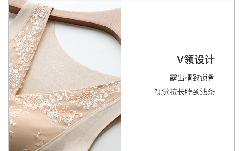 三彩2025新款蕾丝刺绣V领打底带胸垫带杯无痕背心收副乳修身女