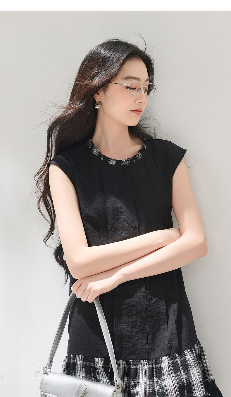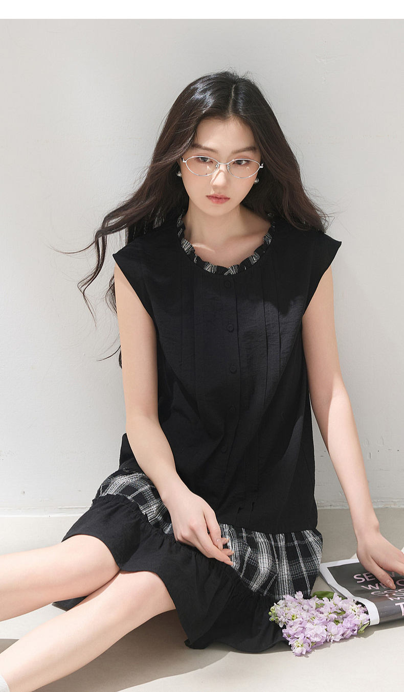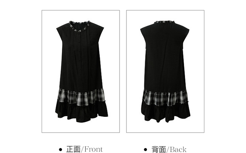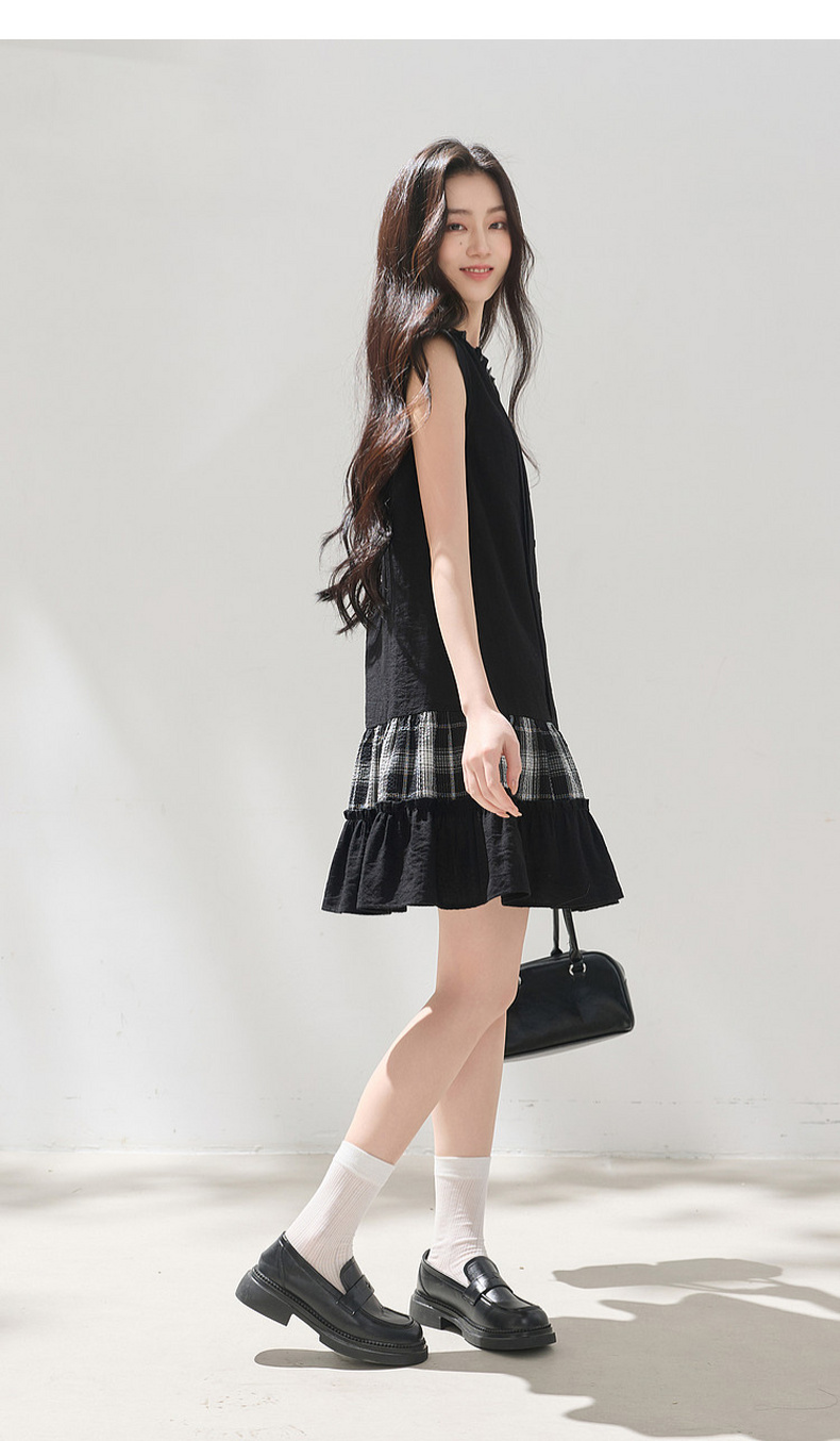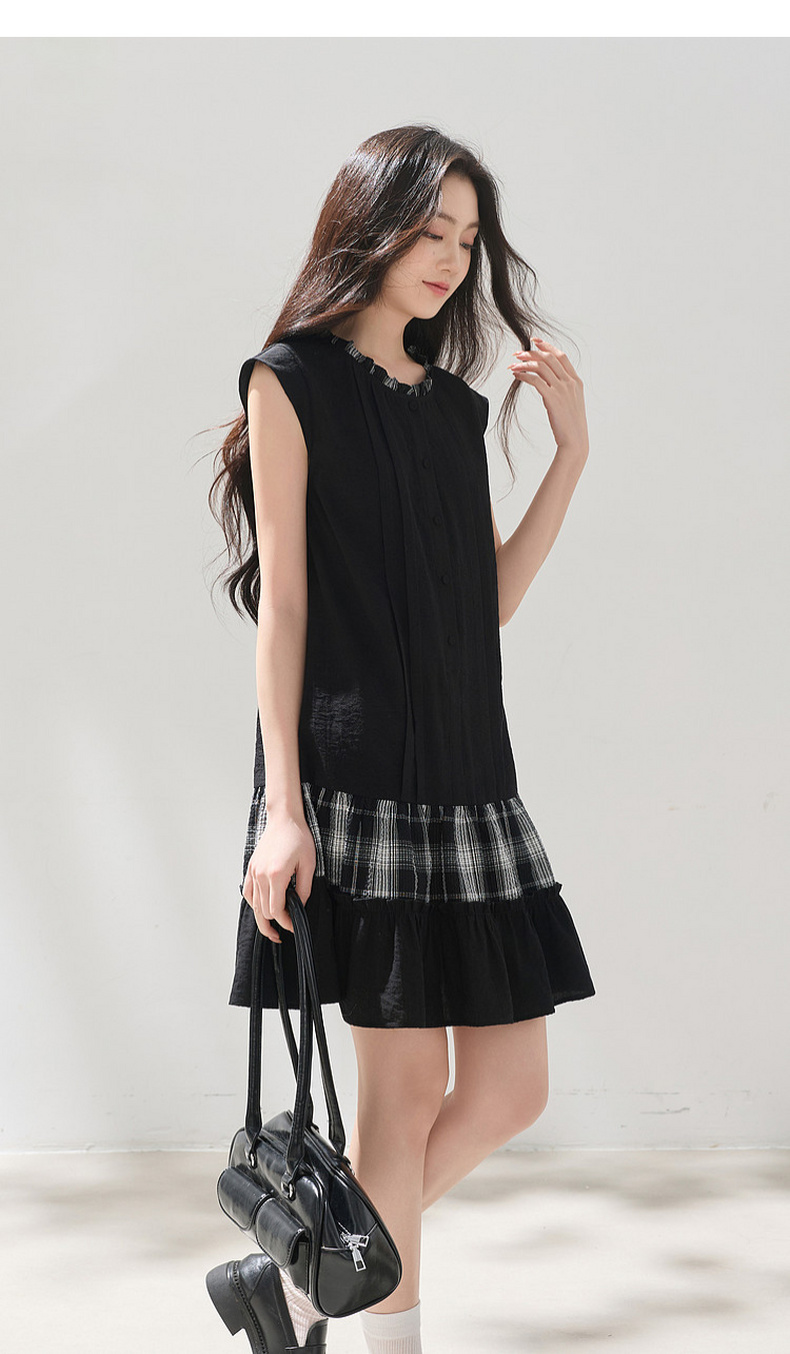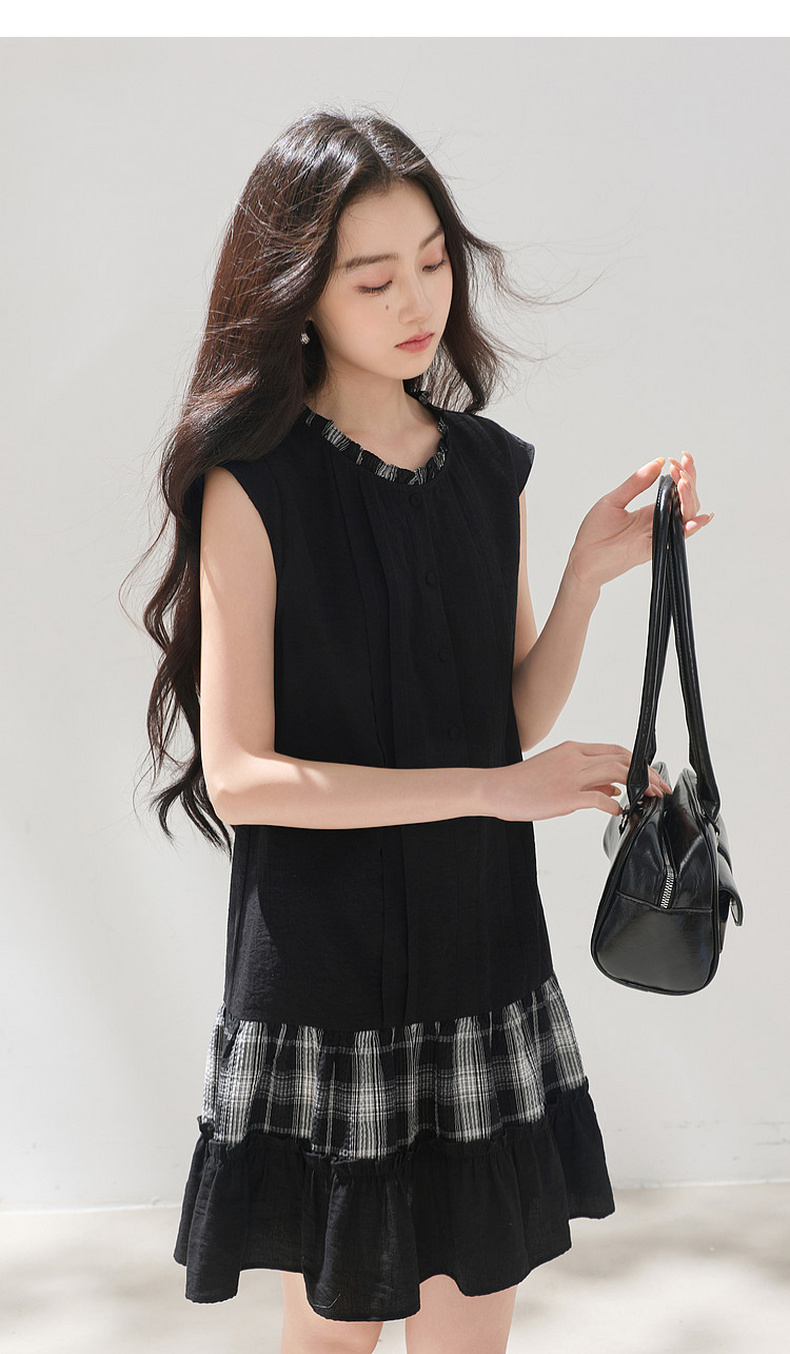 三彩2026夏季新款格纹拼接连衣裙圆领宽松A字裙短裙M