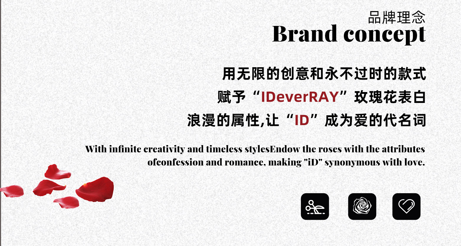 - ❣IDeverRAY简称“ID”,象征独一无二的个人标识,同时与"爱的"谐音,代表爱情的个性化表达 品牌slogan:玫瑰🌹配ID,更好的告白 品牌语言:I ID YOU